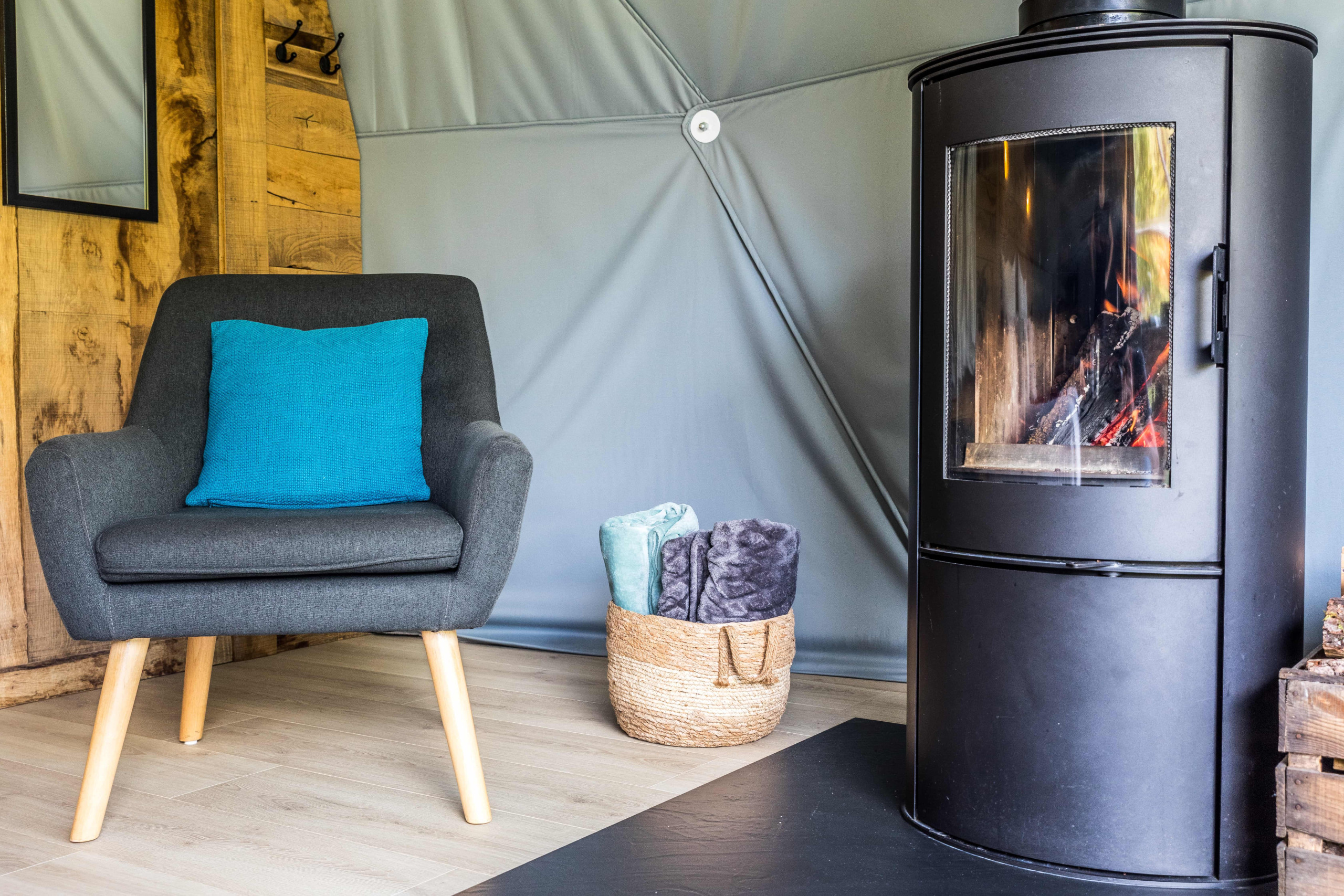 Genießen Sie einen hochwertigen Innenbereich mit einem atemberaubenden Blick auf den Wald. Die Unterkunft ist ausgestattet mit einem Wasserkocher, einer Espressomaschine, Geschirr, einem Minikühlschrank/Bar sowie einem Bluetooth-Lautsprecher. Sie verfügt auch über eine Klimaanlage mit Umkehrfunktion und einen Holzofen, um Sie sowohl im Sommer als auch im Winter komfortabel zu empfangen.