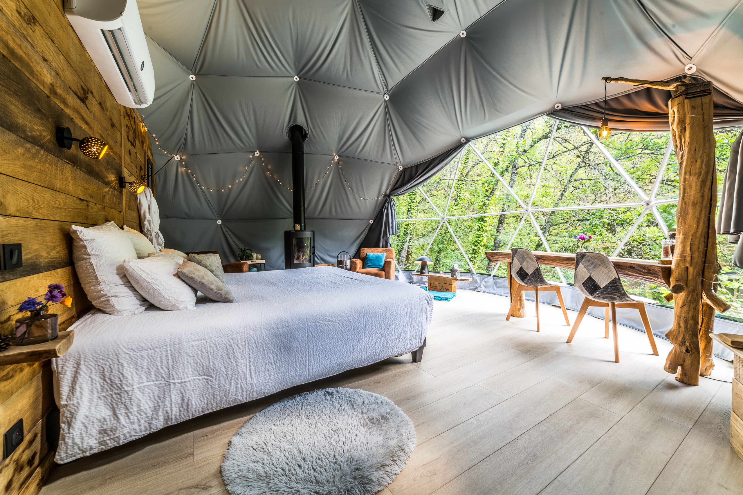 Genießen Sie einen hochwertigen Innenbereich mit einem atemberaubenden Blick auf den Wald. Die Unterkunft ist ausgestattet mit einem Wasserkocher, einer Espressomaschine, Geschirr, einem Minikühlschrank/Bar sowie einem Bluetooth-Lautsprecher. Sie verfügt auch über eine Klimaanlage mit Umkehrfunktion und einen Holzofen, um Sie sowohl im Sommer als auch im Winter komfortabel zu empfangen.