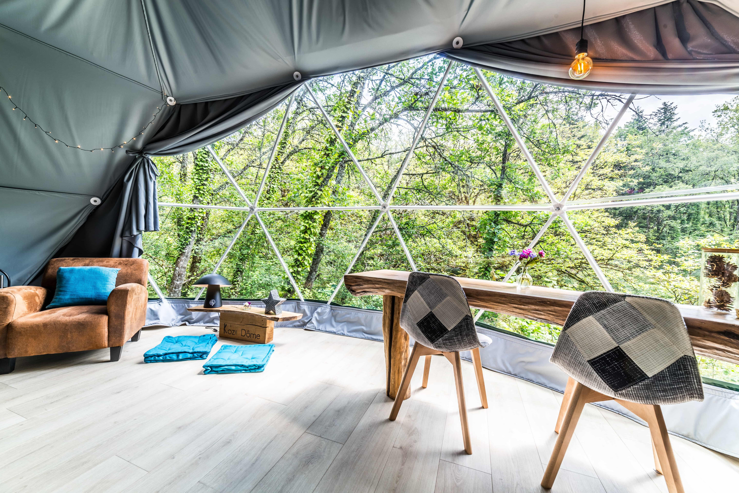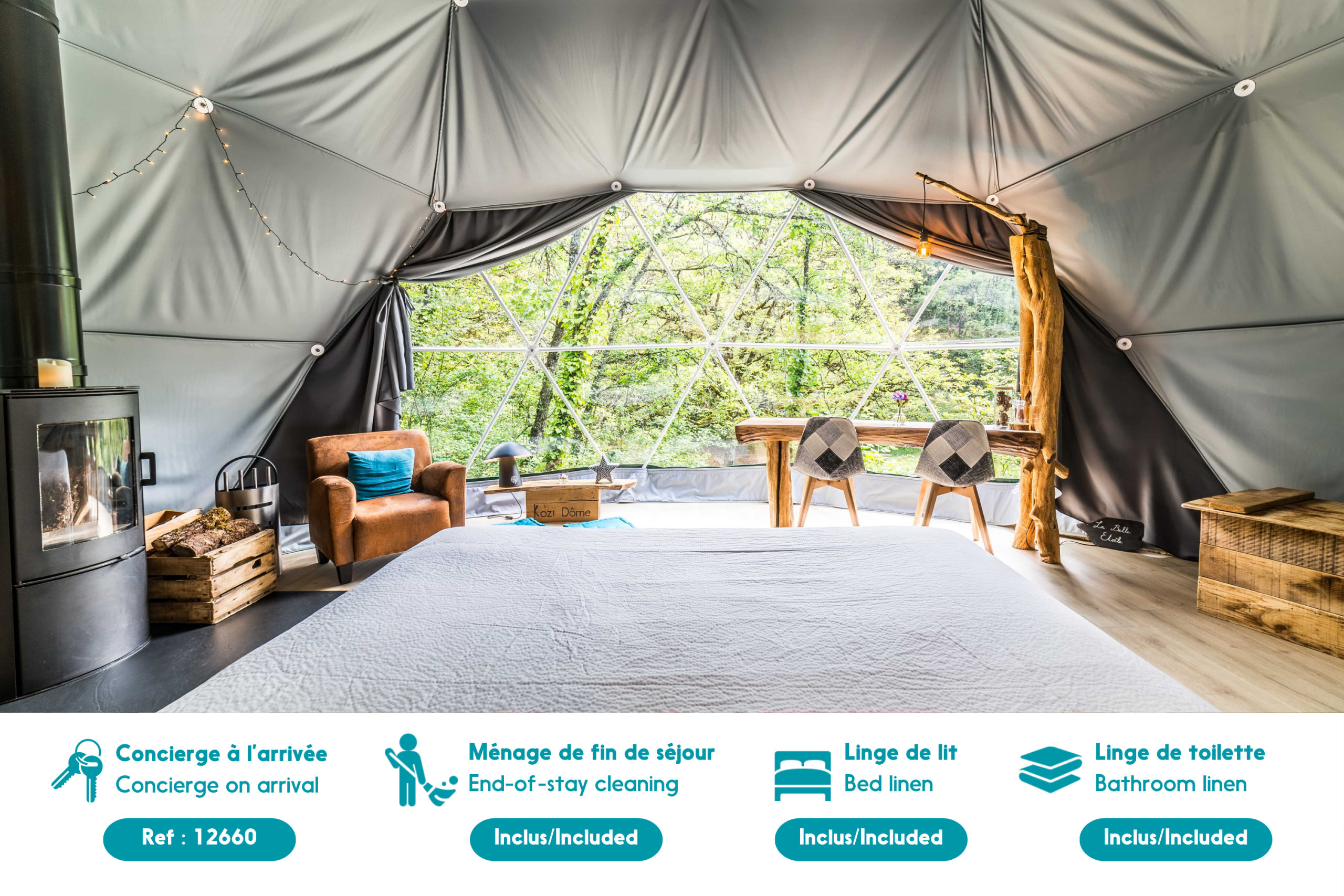 Willkommen im « Clair de Lune », einer Kuppel von 40 m², die in einer friedlichen Umgebung im Herzen der Landschaft von La Dornac liegt. Eingebettet in eine kleine natürliche Lichtung ist dieser intime Kokon sorgfältig dekoriert und darauf ausgelegt, Ihnen einen unvergesslichen Moment der Entspannung zu bieten. Sie werden eine große private Terrasse mit einem Essbereich sowie einen exklusiven Whirlpool genießen.