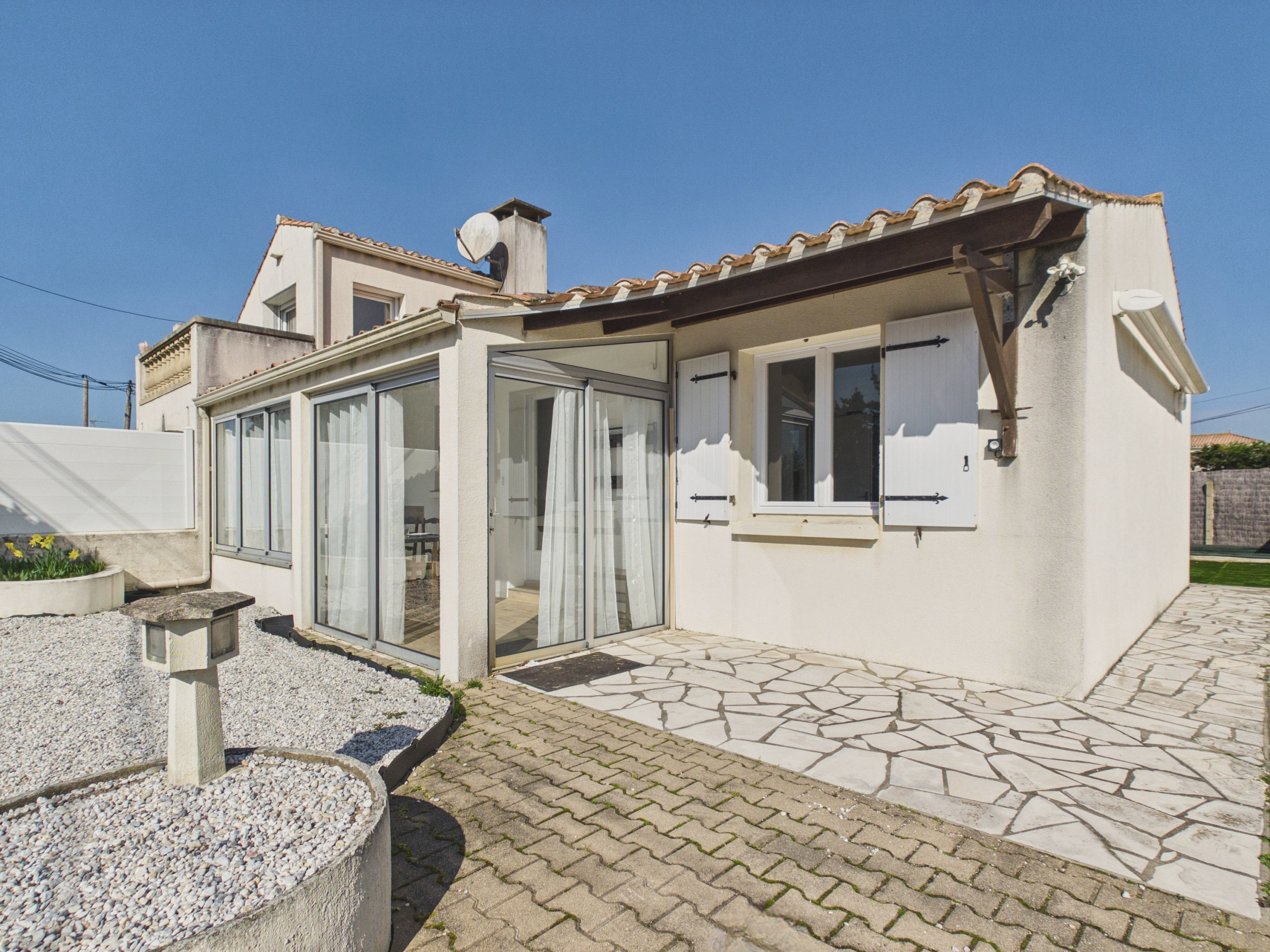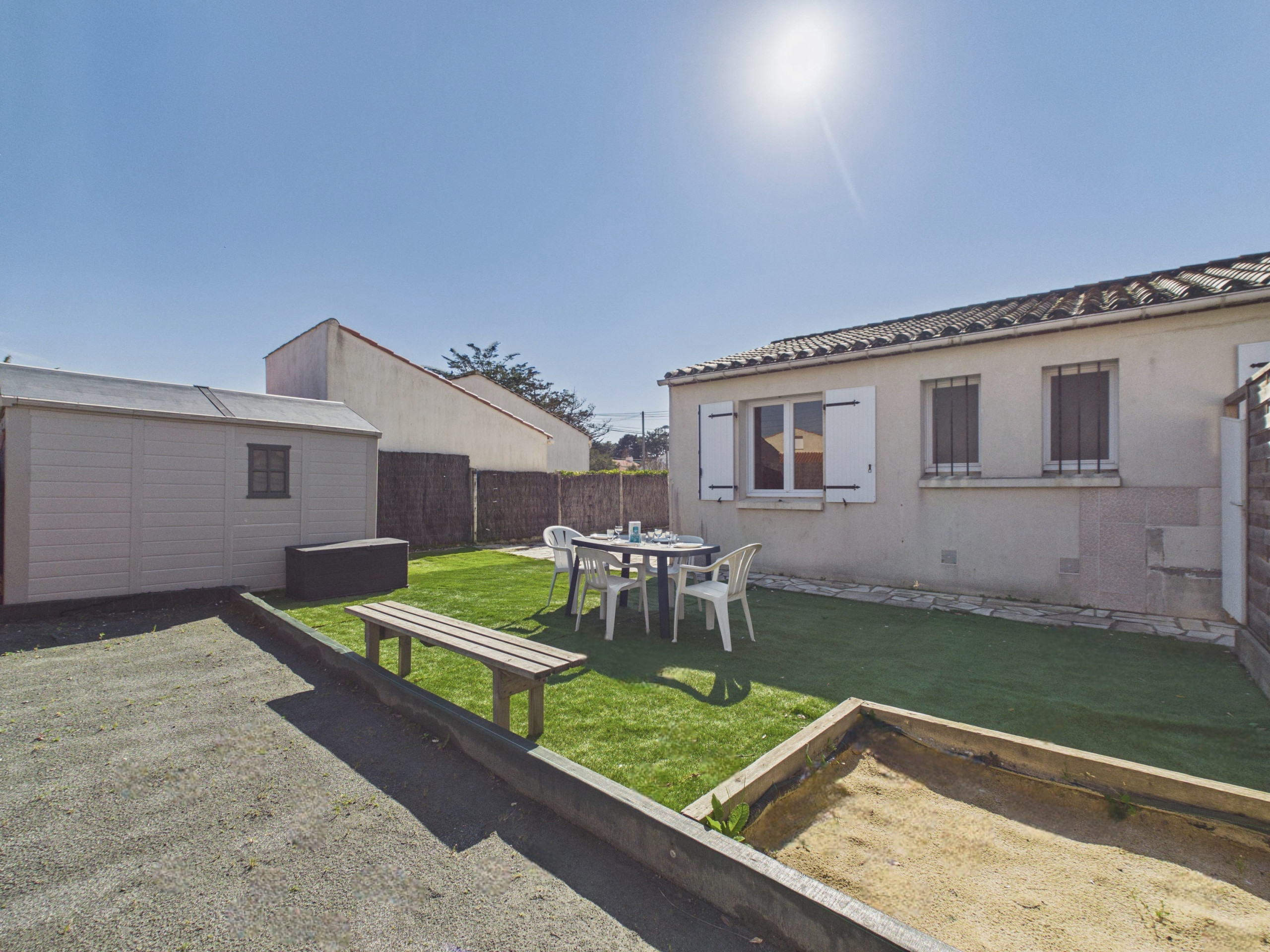 Im Freien werden Sie einen angenehmen eingezäunten Garten für Ihre Erholungsmomente genießen. Das Haus verfügt ebenfalls über eine schöne 40 m² große Terrasse, die mit Gartenmöbeln und einem Grill ausgestattet ist, ideal zum Teilen von Mahlzeiten im Freien, sowie über einen Sandkasten und einen Kieselplatz zum Boule-Spielen.
