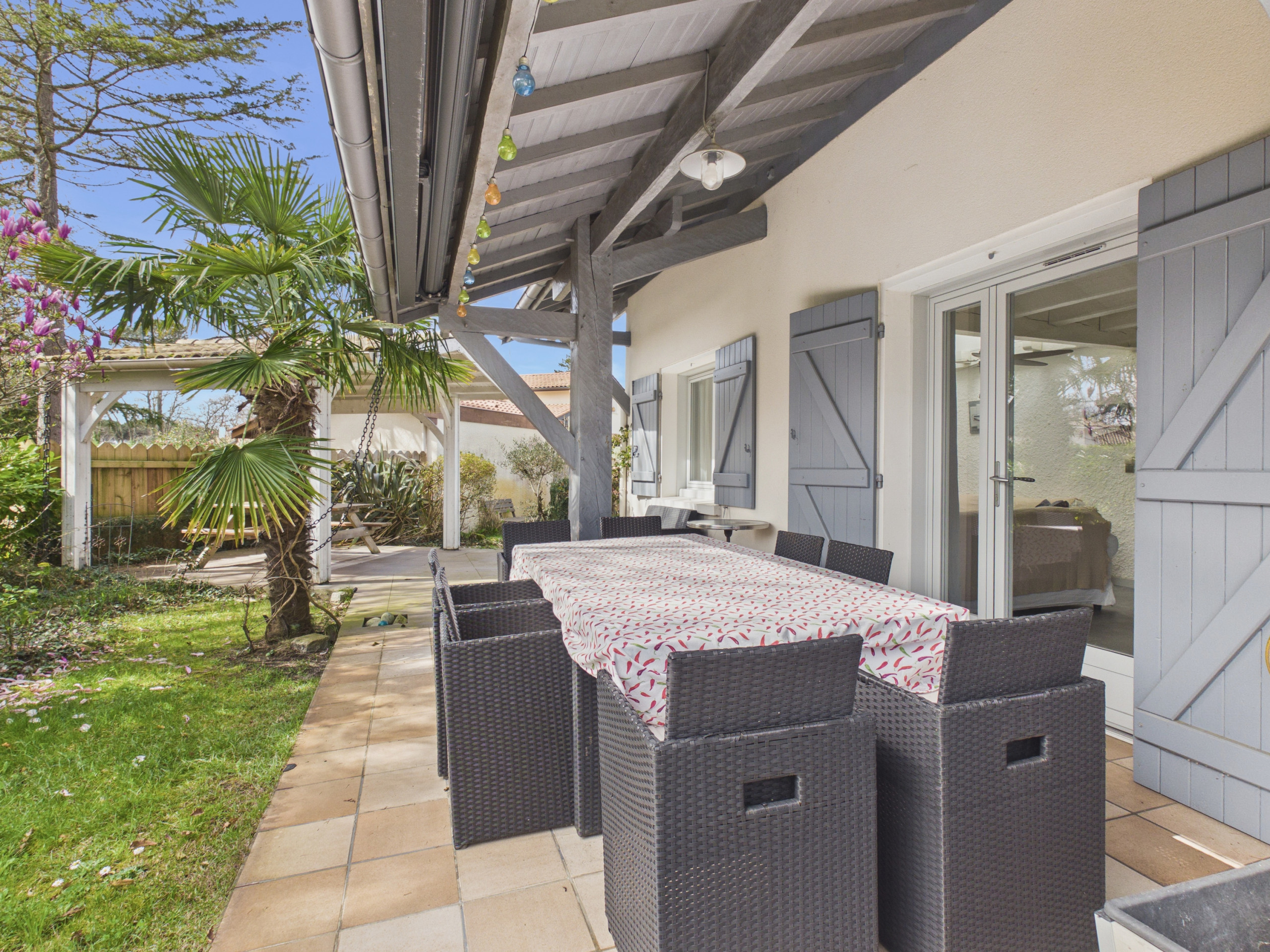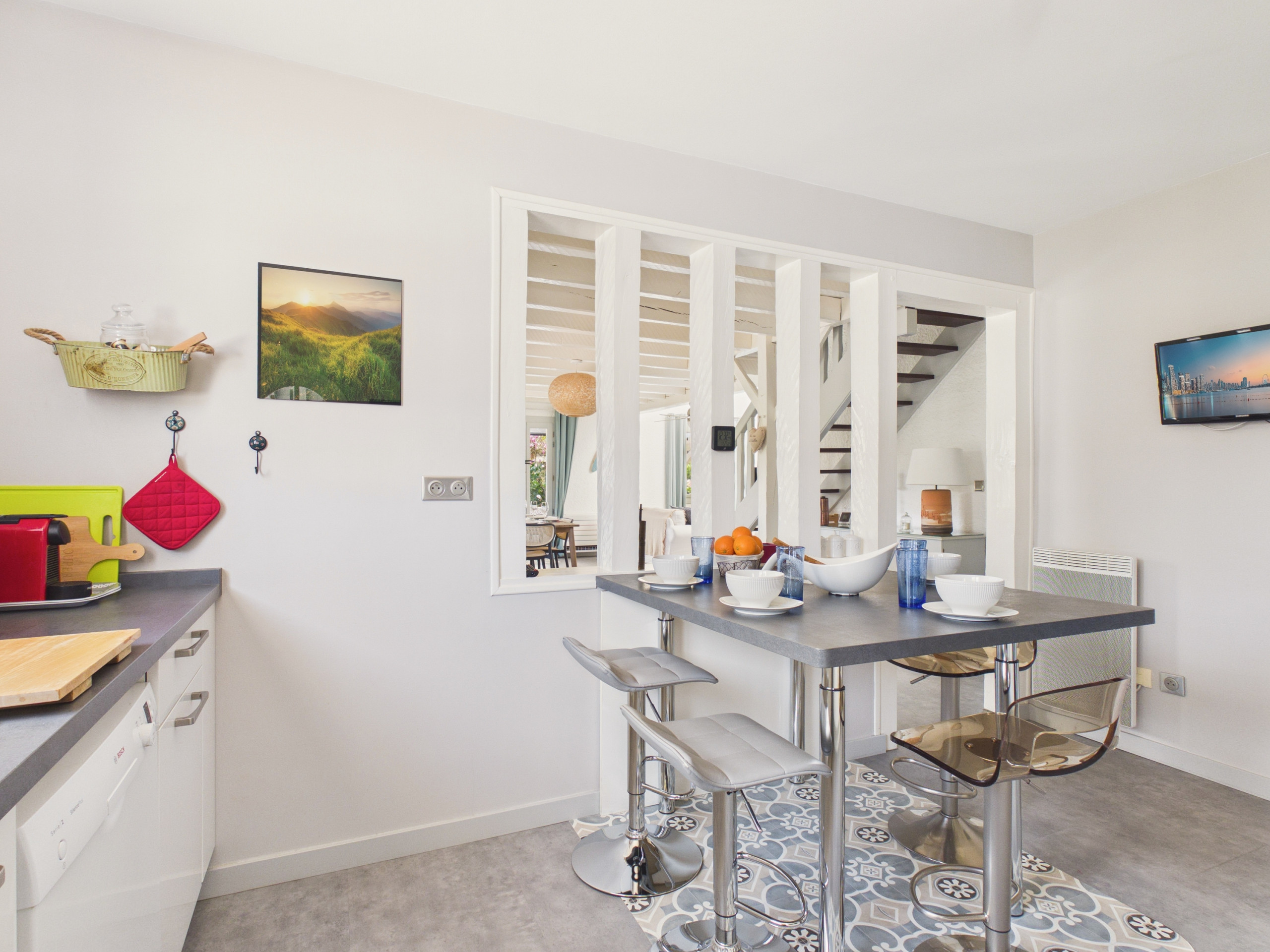 Das Innere des Hauses ist ebenso einladend, mit seiner modernen Dekoration und pastellfarbenen Tönen, die Sie sofort beruhigen werden. Das Wohnzimmer mit seiner ockerfarben Couch lädt zur Entspannung ein, zum Genießen eines Kaffees oder zum Plaudern mit der Familie. Der Esstisch garantiert gesellige Momente bei guten Mahlzeiten. Die offene, vollständig ausgestattete und moderne Küche bietet Ihnen alles Notwendige, um sich wie zu Hause zu fühlen: Glaskeramikkochfeld, Kühlschrank, Gefrierschrank, Mikrowelle, Backofen, Geschirrspüler, Kaffeemaschine, Toaster und Wasserkocher. Genug, um Ihrer kulinarischen Kreativität freien Lauf zu lassen!