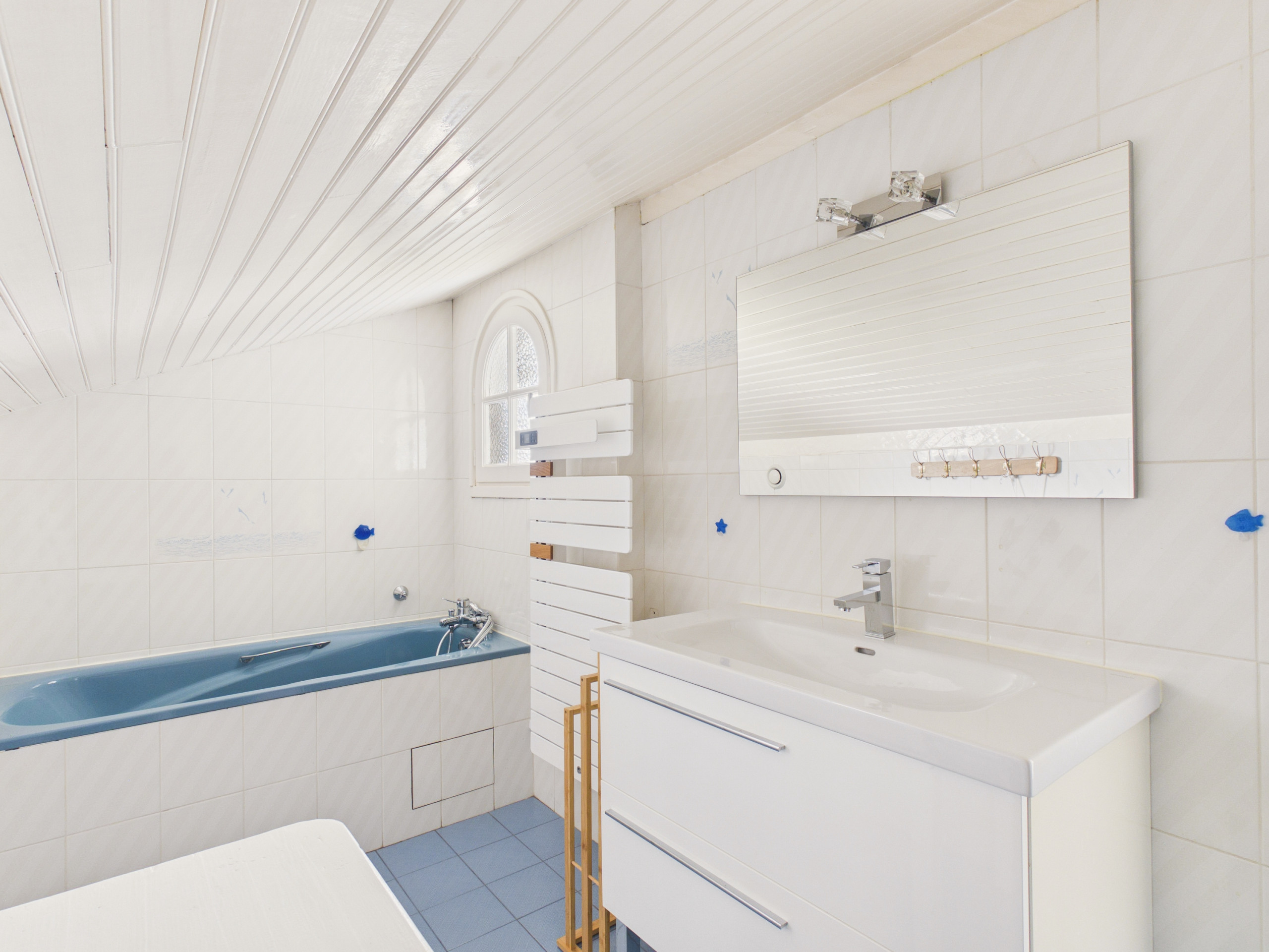 Das Haus verfügt ebenfalls über ein Badezimmer mit 1 separater Toilette im Erdgeschoss und einer weiteren im Obergeschoss. In der Garage stehen Ihnen eine Waschmaschine sowie ein Bügeleisen mit Bügelbrett zur Verfügung.