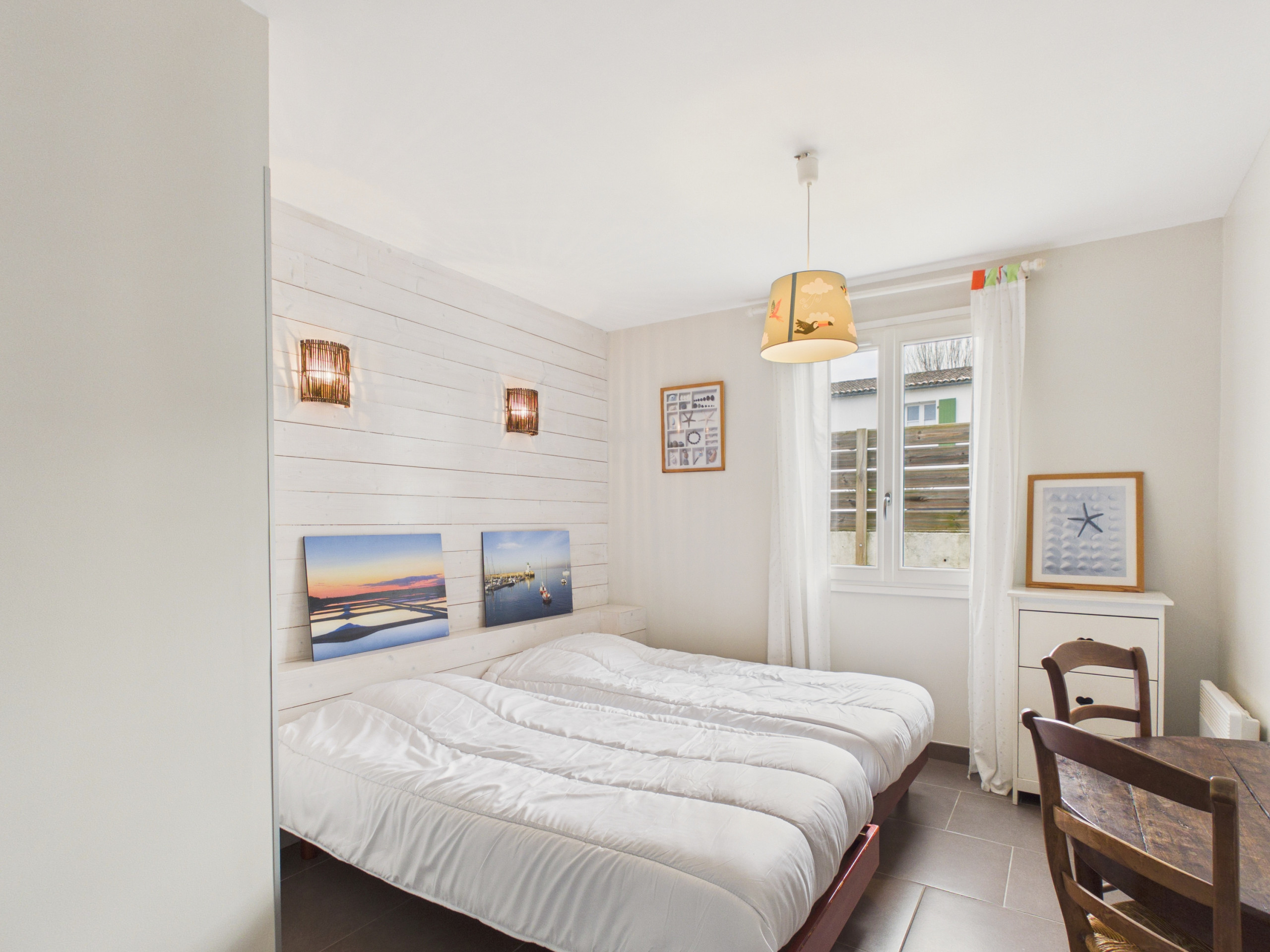 Im Obergeschoss werden Sie von einem gemütlichen Raum mit einem Sofa empfangen. Sie werden auch zwei Schlafzimmer finden, das erste mit einem Queen-Size-Bett und Meerblick, das zweite ist ein Schlafsaal mit einem Queen-Size-Bett und zwei Doppelbetten, die einen Blick auf die Salzwiesen bieten. Dann wird ein Badezimmer dieses Stockwerk vervollständigen.