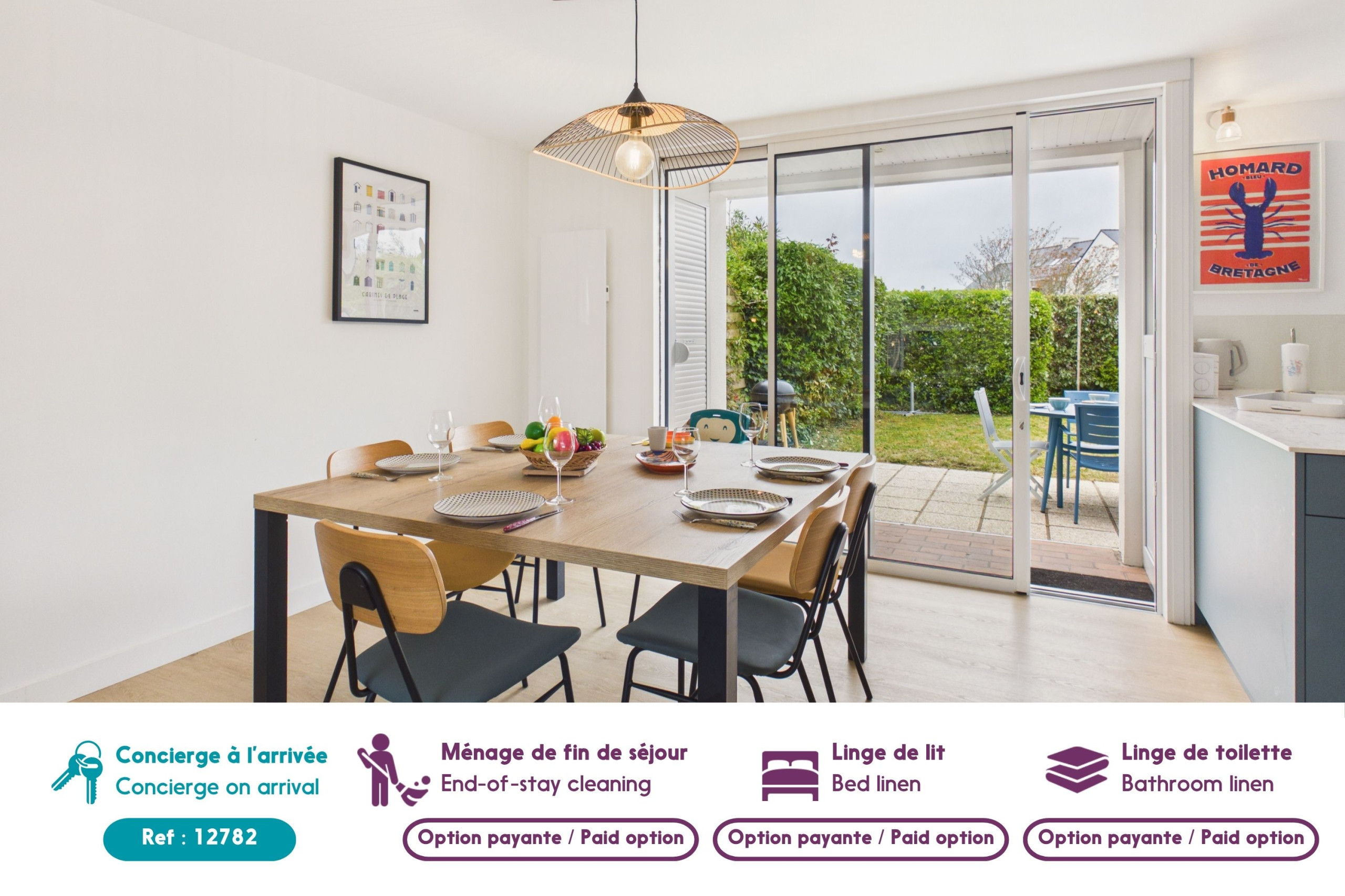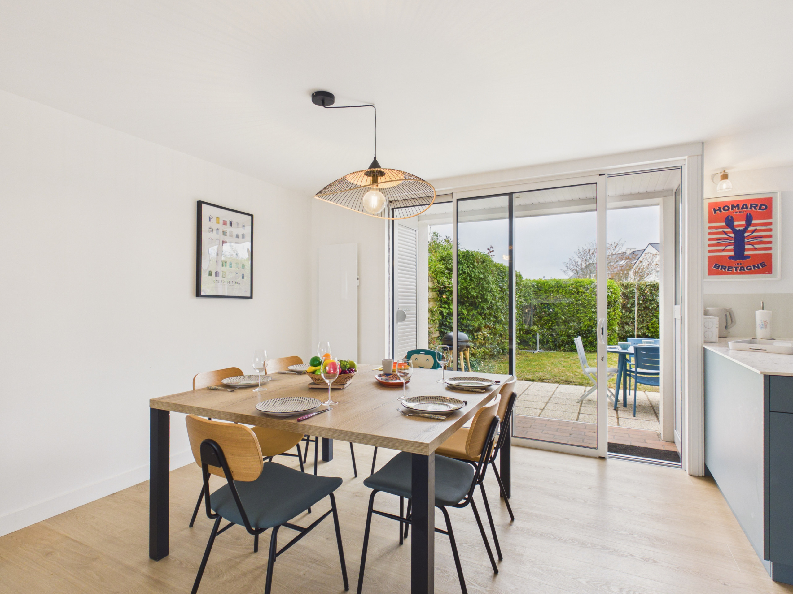 Im Inneren entdecken Sie bereits beim Eingang einen schönen, gemütlichen und hellen Wohnbereich. Das Wohnzimmer, ausgestattet mit einem bequemen Sofa und einem Fernseher, öffnet sich nach außen durch eine große Glasfront, die schöne Helligkeit bringt. In seiner Verlängerung verfügt der Essbereich über einen Tisch, der bis zu 6 Personen Platz bietet, und hat eine zweite Glasfront mit Blick auf die andere Seite des Gartens. Die amerikanische Küche, modern und vollständig ausgestattet (Induktionskochfeld, Kühlschrank, Gefrierschrank, Backofen, Mikrowelle, Geschirrspüler, Filterkaffeemaschinen und Nespresso, Toaster, Wasserkocher), ist offen zum Wohnbereich für mehr Gemütlichkeit.