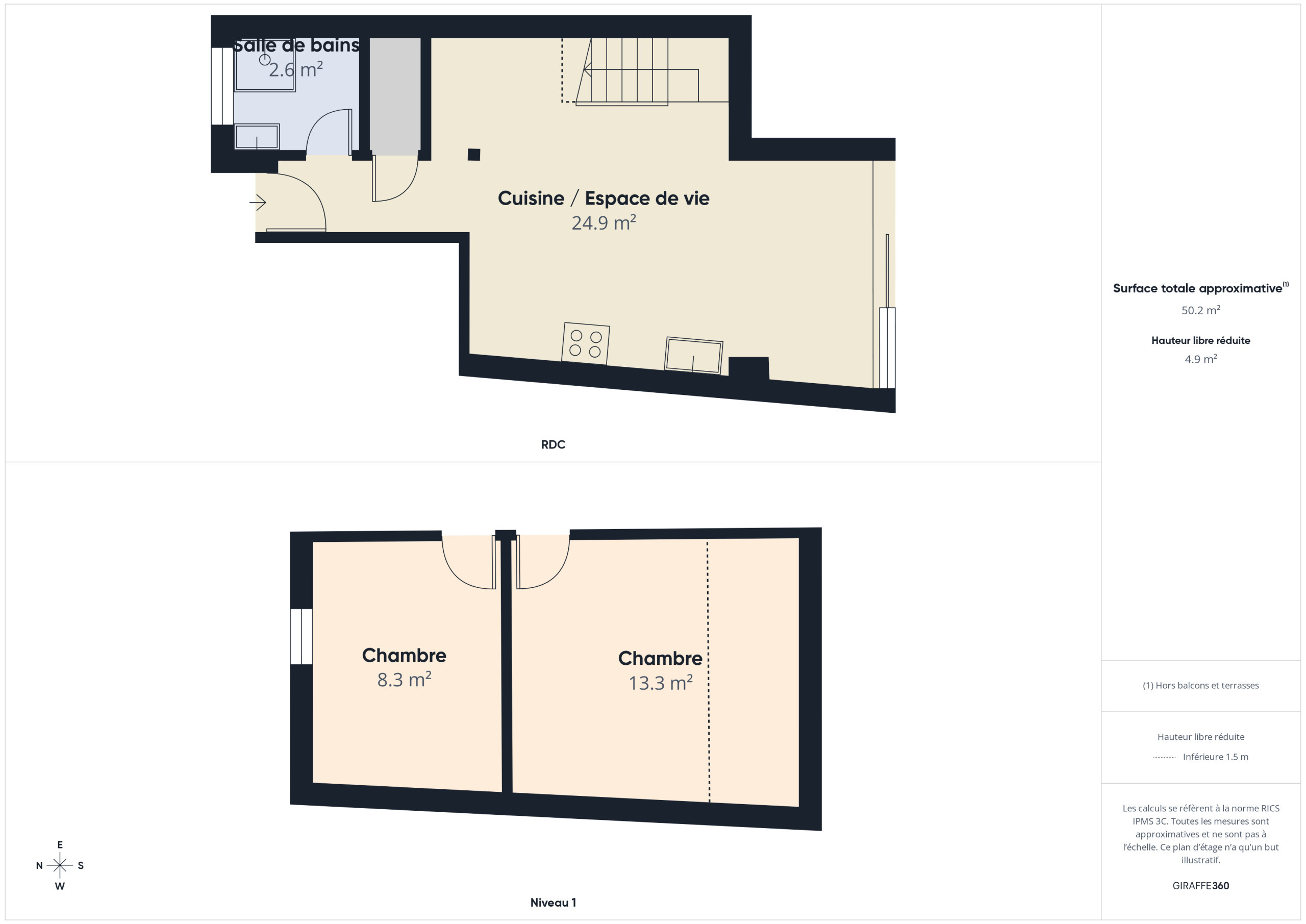 Schieben Sie die Eingangstür auf und entdecken Sie einen geräumigen Wohnbereich von über 50 m², der den gesamten Erdgeschoss einnimmt. Die offene, moderne und vollständig ausgestattete Küche (Kühlschrank, Gefrierschrank, Ofen, Mikrowelle, Geschirrspüler) stellt Ihnen alles zur Verfügung, was Sie zum Kochen wie zu Hause benötigen. Für Ihr Frühstück finden Sie auch eine Kaffeepadmaschine, einen Wasserkocher und einen Toaster. Teilen Sie Ihre Mahlzeiten um den Esstisch für 4 Personen oder genießen Sie die Außenterrasse an schönen Tagen. Am Abend treffen Sie sich um den dekorativen Kamin im gemütlichen Wohnbereich, ausgestattet mit einem bequemen Sofa, einem Couchtisch und einem Fernseher. Eine separate Toilette vervollständigt das Erdgeschoss.