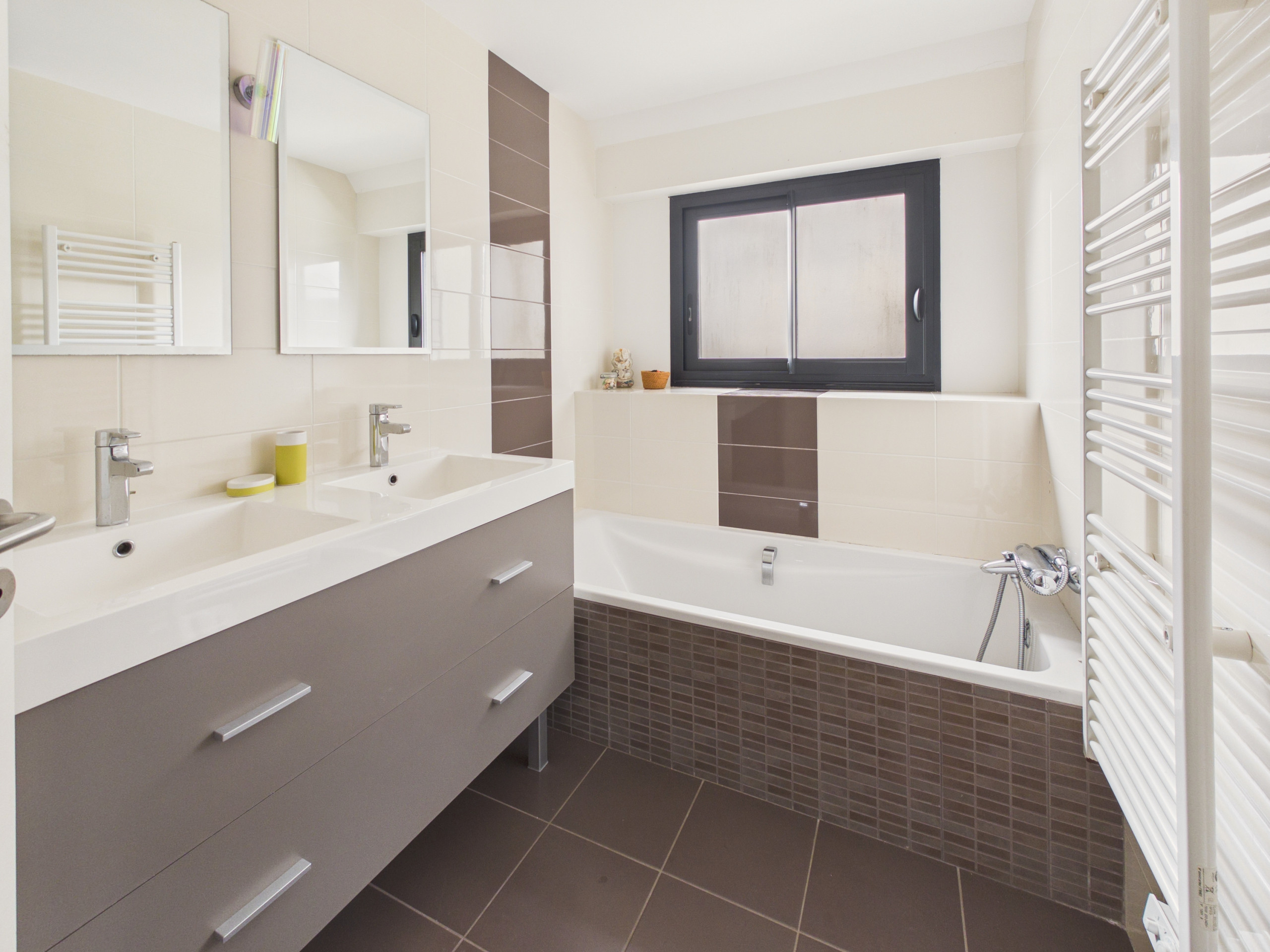 Sie umfasst ebenfalls zwei Badezimmer: eines im Erdgeschoss, ausgestattet mit einer Badewanne, und ein weiteres im Obergeschoss mit einer Dusche und einer Toilette.