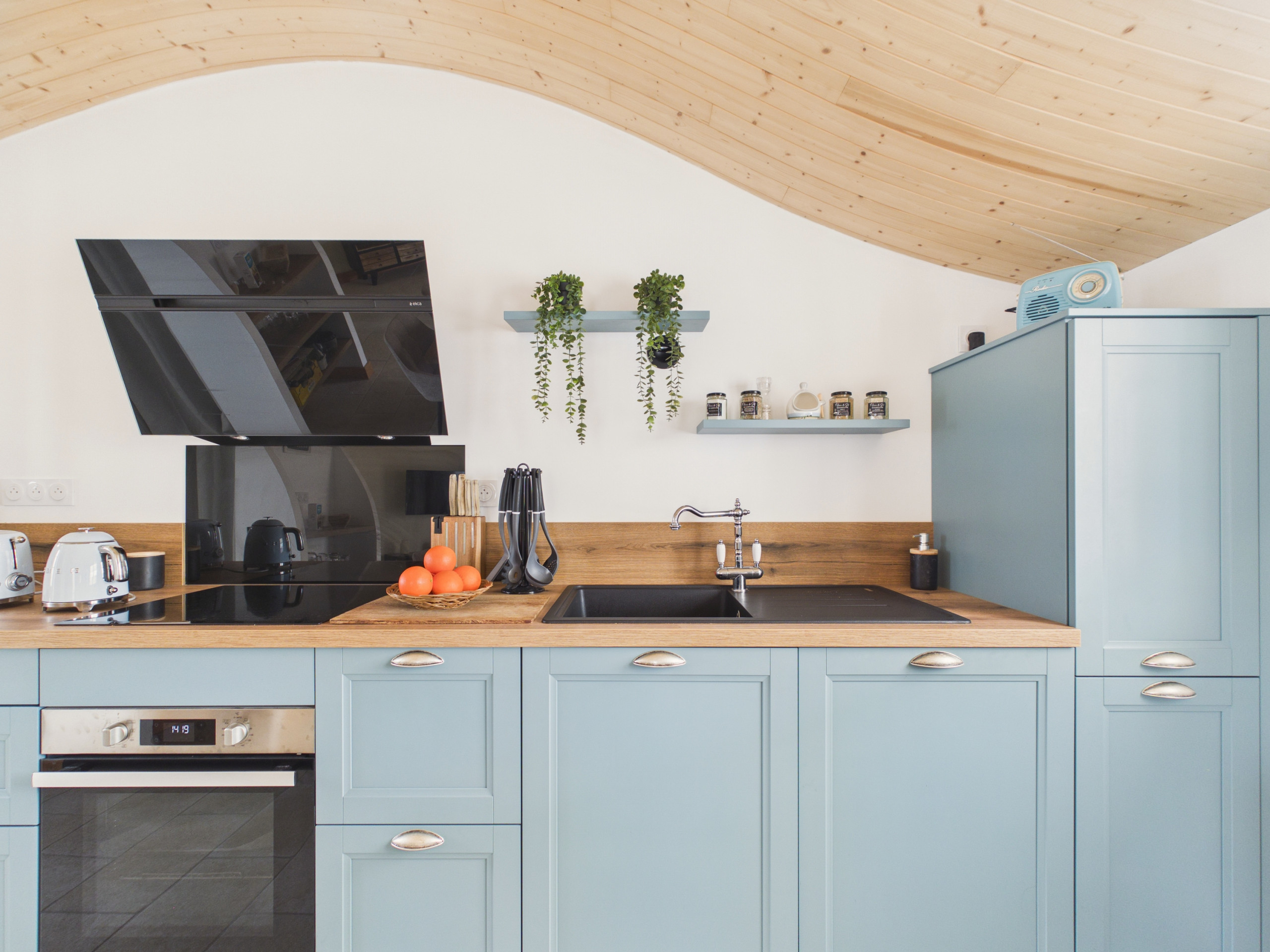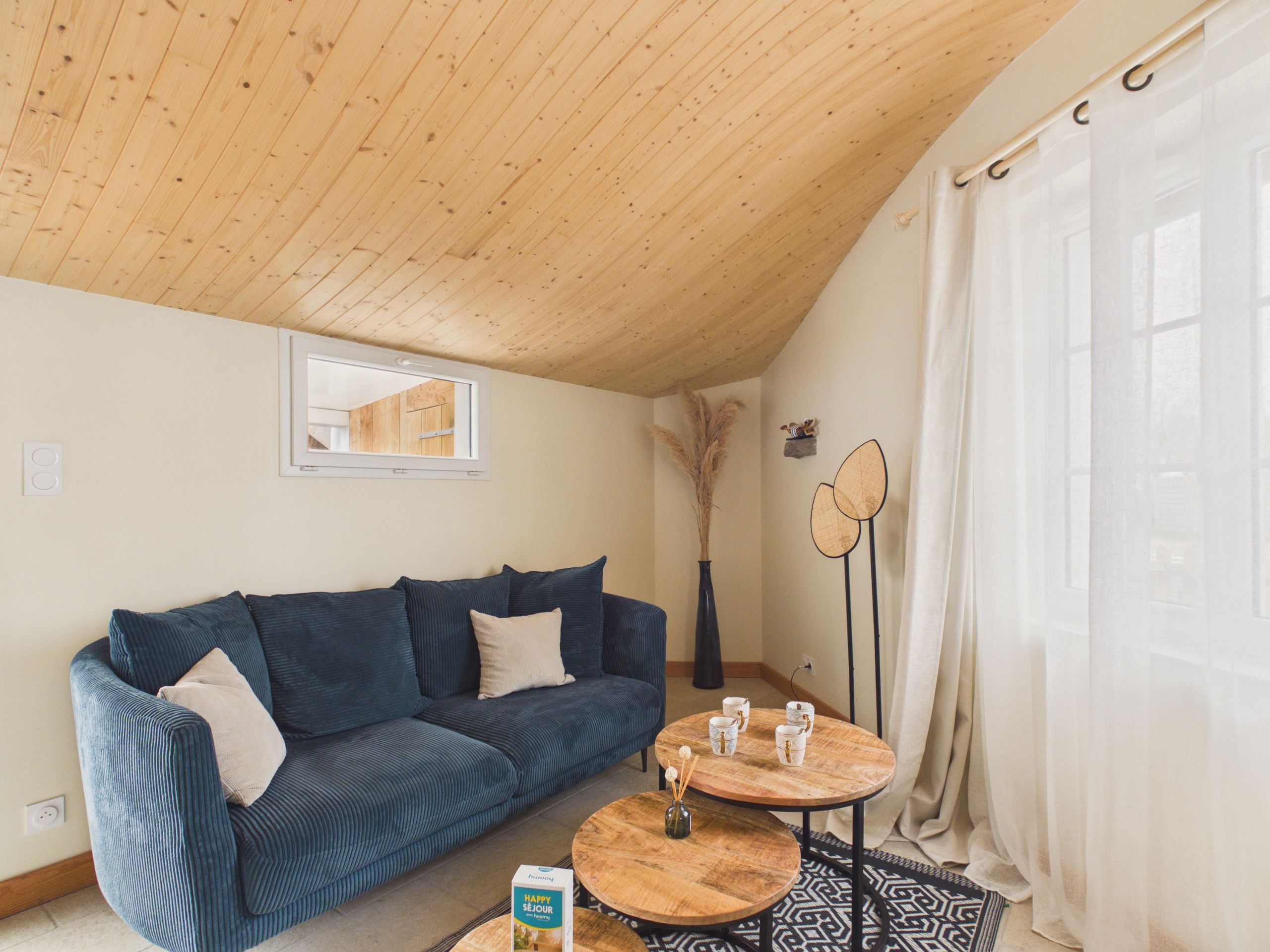 Im Inneren werden Sie gleich beim Betreten einen schönen, warmen und lichtdurchfluteten Wohnbereich entdecken. Das Wohnzimmer, bestehend aus einem gemütlichen Sofa und einem Fernseher, öffnet sich durch eine große Glasfront zum Garten und bringt wunderbares natürliches Licht herein. Die Decke, wunderschön aus hellem, gerundetem Holz gearbeitet, erinnert an eine Welle oder einen Bootskörper und verleiht dem Ganzen einen einzigartigen Charme. Der Essbereich auf der anderen Seite des Raumes verfügt über einen großen Tisch, der bis zu 6 Personen für gesellige Momente Platz bietet. Die offene Küche mit Induktionsherd ist komplett ausgestattet: Kühlschrank, Backofen, Mikrowelle, Geschirrspüler, Espresso- und Senseo-Kaffeemaschine, Toaster, Wasserkocher und alles Nötige, um wie zu Hause zu kochen.