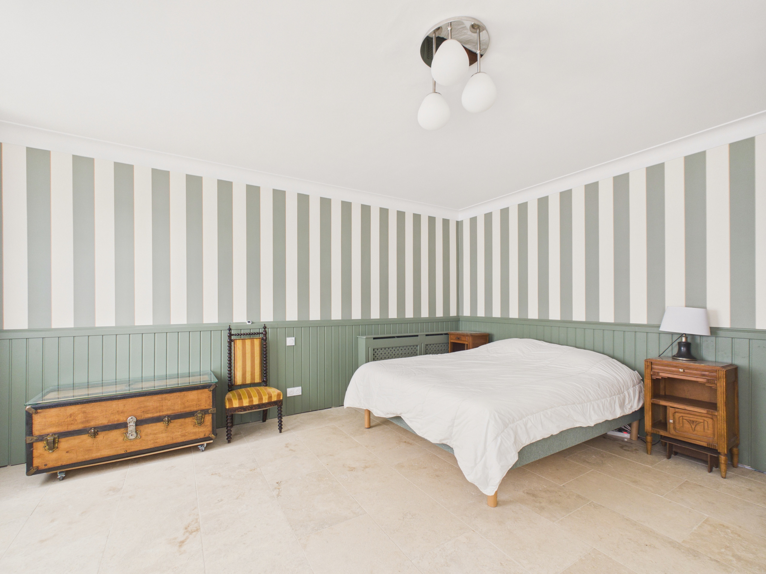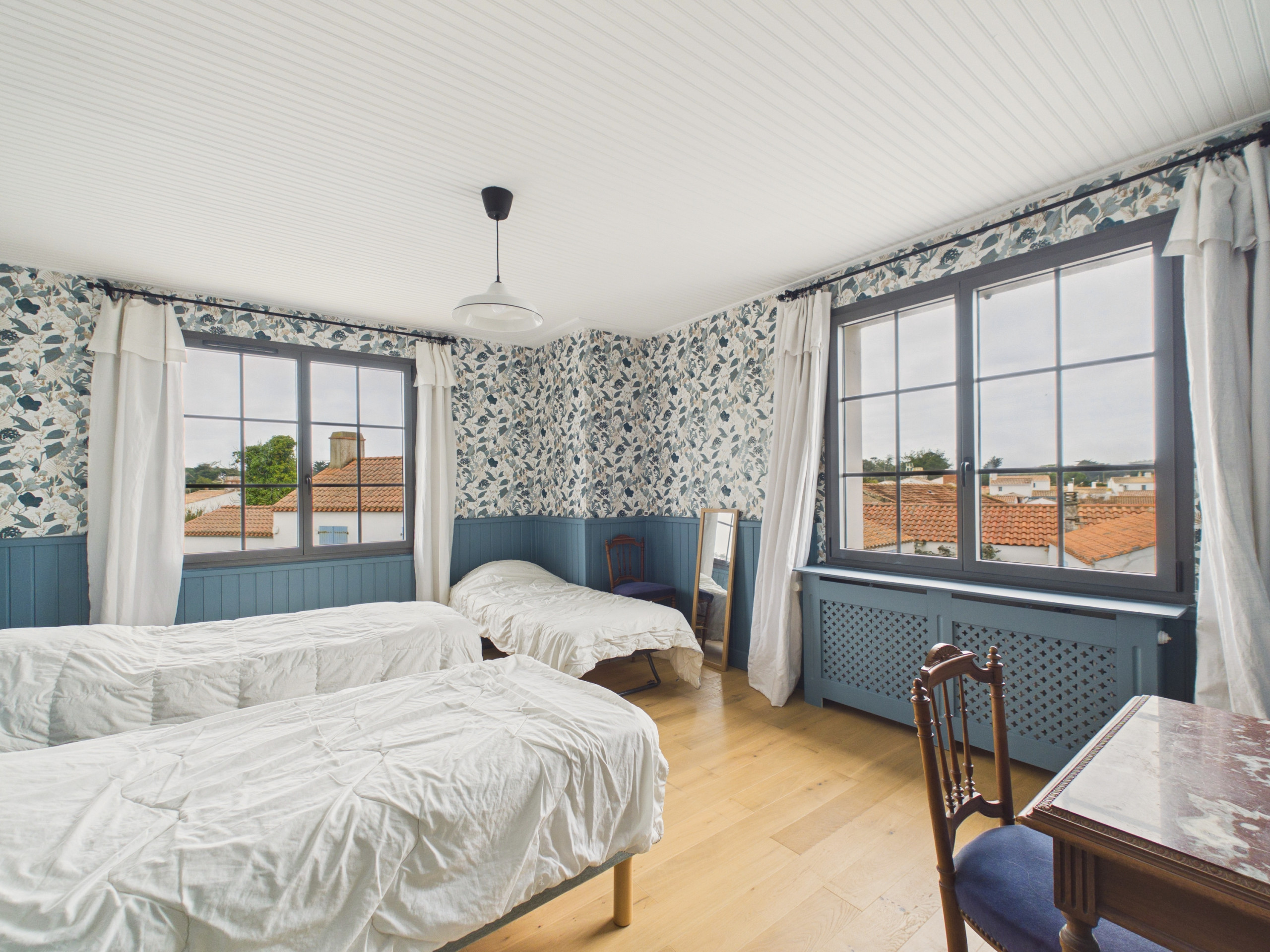 Was die Zimmer betrifft, verfügt das Haus über 3 Zimmer: Ein erstes Zimmer mit einem Queensize-Bett (160x200), ein zweites Zimmer ebenfalls mit einem Queensize-Bett (160x200) und ein Zimmer mit zwei Stockbetten, also vier Einzelbetten (80x200).