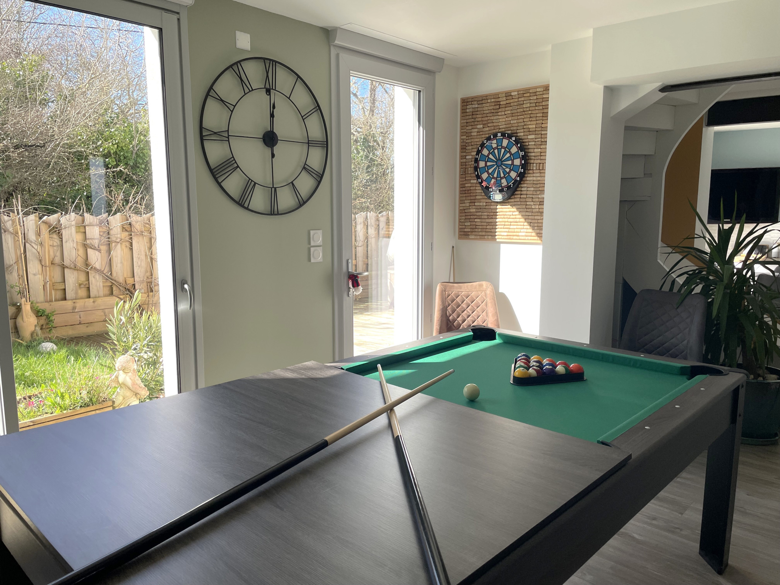 Im Untergeschoss erreichen Sie das Billiardzimmer und eine separate Dusch- und WC-Kabine sowie die Garage, die ebenfalls über eine Dusche für Ihre Rückkehr von Angeln oder Strand verfügt. Gartenmöbel, ein Kinderbereich sowie eine elektrische Plancha stehen zur Verfügung.