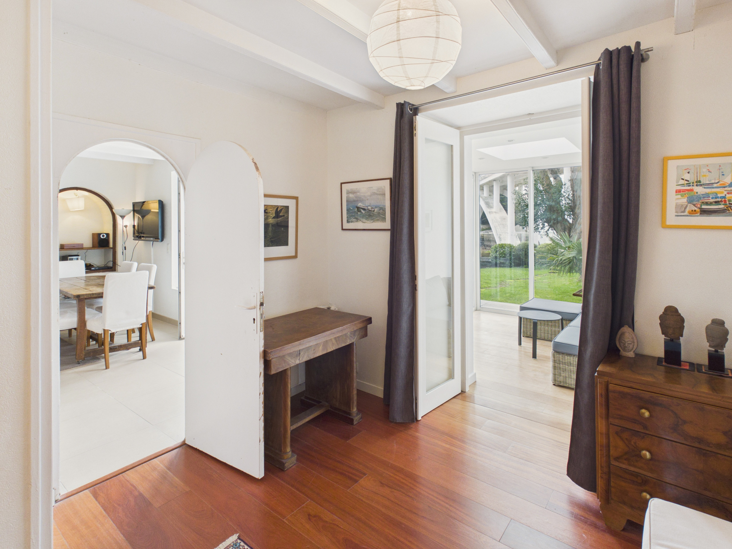 Im Freien werden Sie einen perfekt gepflegten geschlossenen Garten genießen, ideal für Familienmomente. Die 25 m² große Terrasse, ausgestattet mit Gartenmöbeln, einem Grill und einer Plancha, wird der bevorzugte Ort für Ihre sonnigen Mittagessen und Sommerabende mit Blick aufs Meer sein. Das Haus verfügt auch über eine lichtdurchflutete Veranda, einen wahren Erholungsraum mit Sofa, der einen außergewöhnlichen Blick auf den Garten und den Ozean bietet, ein einzigartiger Rahmen, um die Aussicht in allen Jahreszeiten zu genießen.