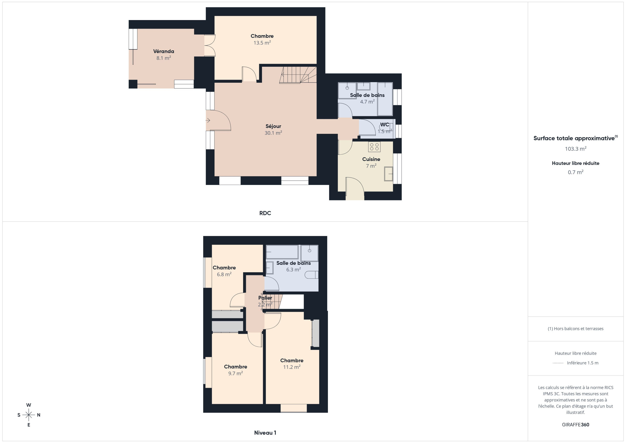 Zwei Badezimmer stehen Ihnen zur Verfügung, eines in jeder Etage, die jeweils mit einer Badewanne und einer Dusche ausgestattet sind. Sie finden auch zwei WCs im Haus, eines ist in das Badezimmer im Obergeschoss integriert und ein separates WC ist im Erdgeschoss verfügbar.