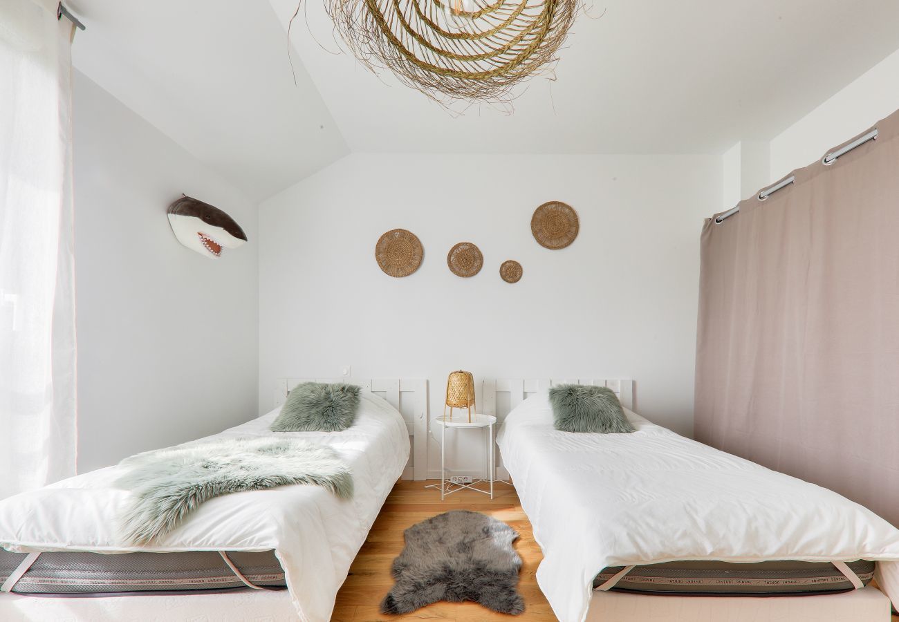 Sobald die Nacht hereinbricht, können Sie sich in einem der 4 Schlafzimmer des Hauses ausruhen. Das erste befindet sich im Erdgeschoss, es hat ein Kingsize-Bett und ein Badezimmer. Die anderen drei befinden sich im Obergeschoss, alle im Dachgeschoss und sind mit zwei Einzelbetten ausgestattet (die Sie jedes Mal zu Kingsize-Betten zusammenstellen können). Es handelt sich um gemütliche Kokons, in denen Sie ruhig schlafen können.