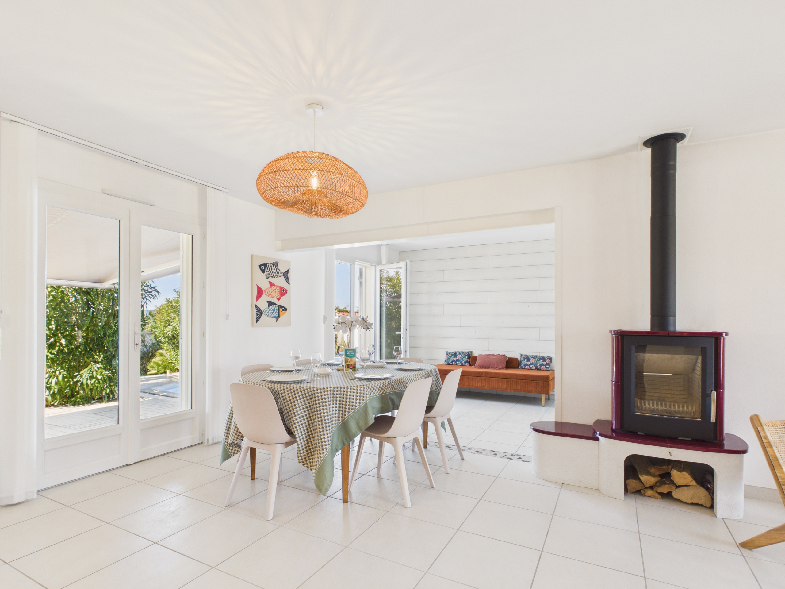 Bei Ihrer Ankunft entdecken Sie einen Wohnbereich mit Fernseher und dekorativem Kamin, perfekt für Ihre Abende. Sie können Ihre Mahlzeiten am Tisch im Inneren einnehmen oder den Gartensalon auf der schattigen Terrasse genießen.
