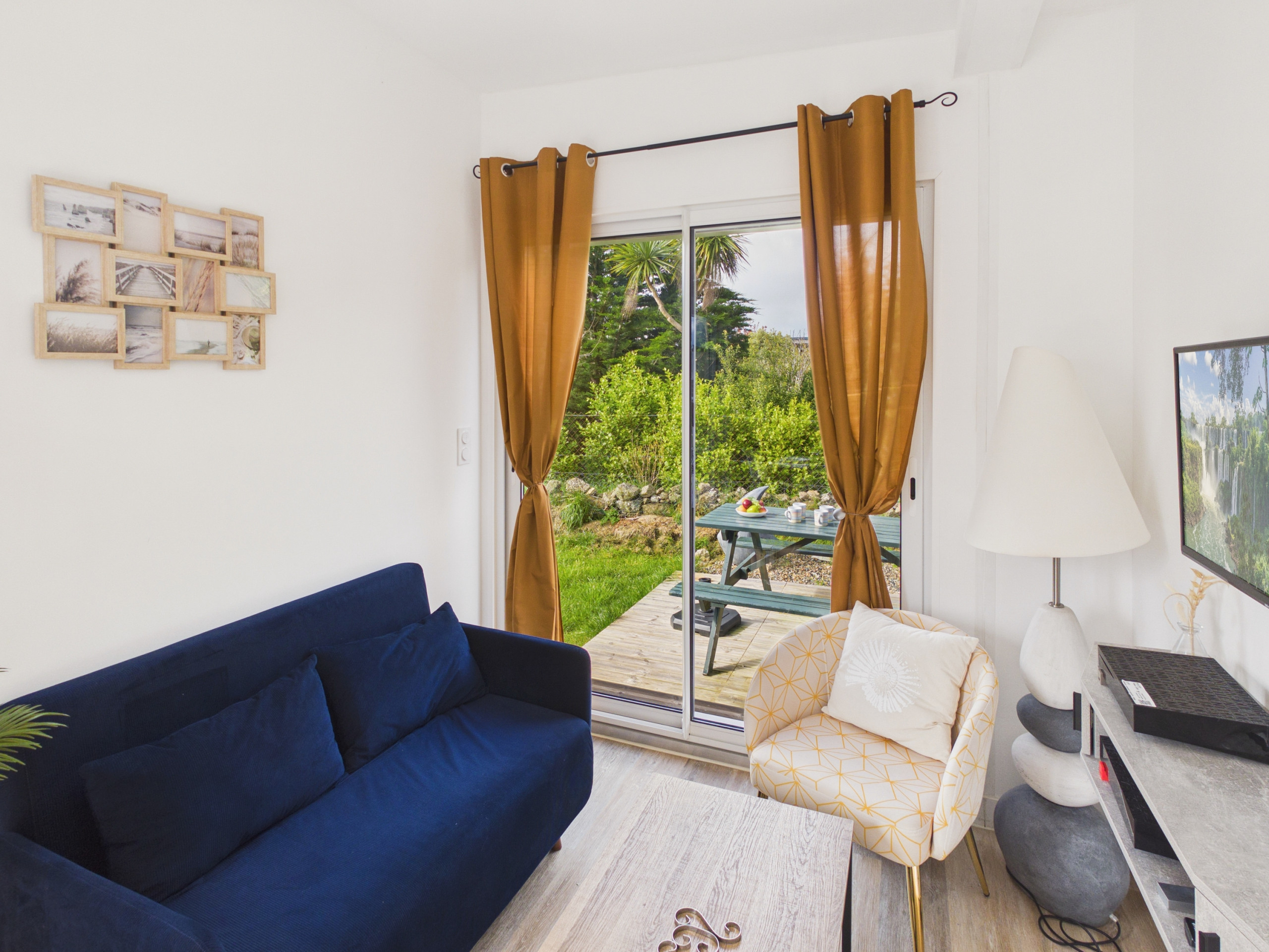 Bei Ihrer Ankunft entdecken Sie einen hellen Wohnbereich, bestehend aus einer Wohnecke, einem Esszimmer und einer offenen Küche. Das Wohnzimmer mit seinem Sofa und seinem Sessel ist mit einem Fernseher ausgestattet, ideal für Entspannungsmomente. Sie können Ihre Mahlzeiten am Esstisch genießen oder den auf der Terrasse aufgestellten Tisch nutzen.