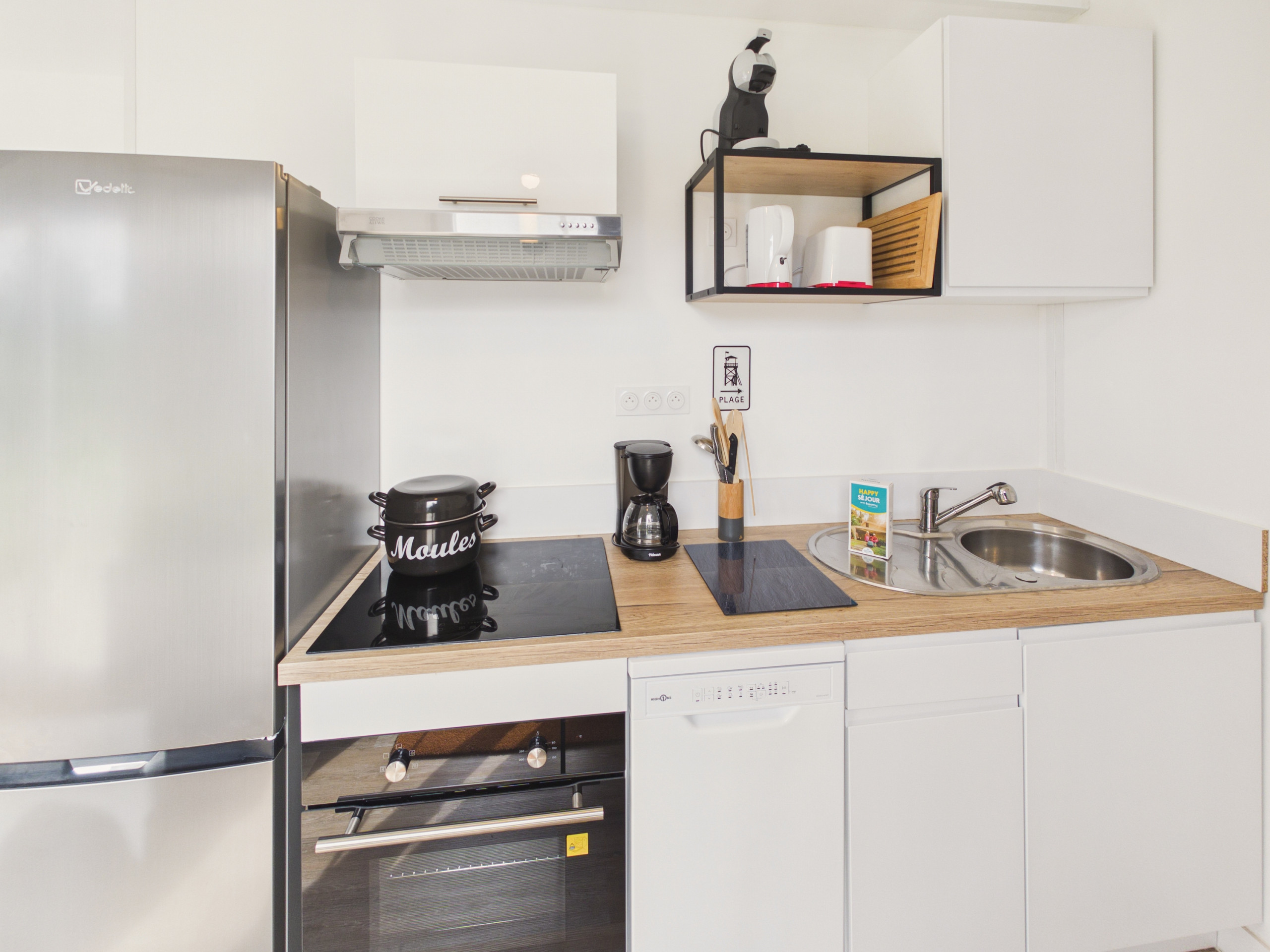 Die offene, zeitgenössische und vollständig ausgestattete Küche (Kühlschrank, Gefrierschrank, Ofen, Mikrowelle, Geschirrspüler) bietet Ihnen alles Notwendige, um köstliche Mahlzeiten zuzubereiten. Für Ihre Frühstücke finden Sie auch eine Filterkaffeemaschine und einen Wasserkocher. Für mehr Komfort steht Ihnen eine Waschmaschine in der Küche zur Verfügung.