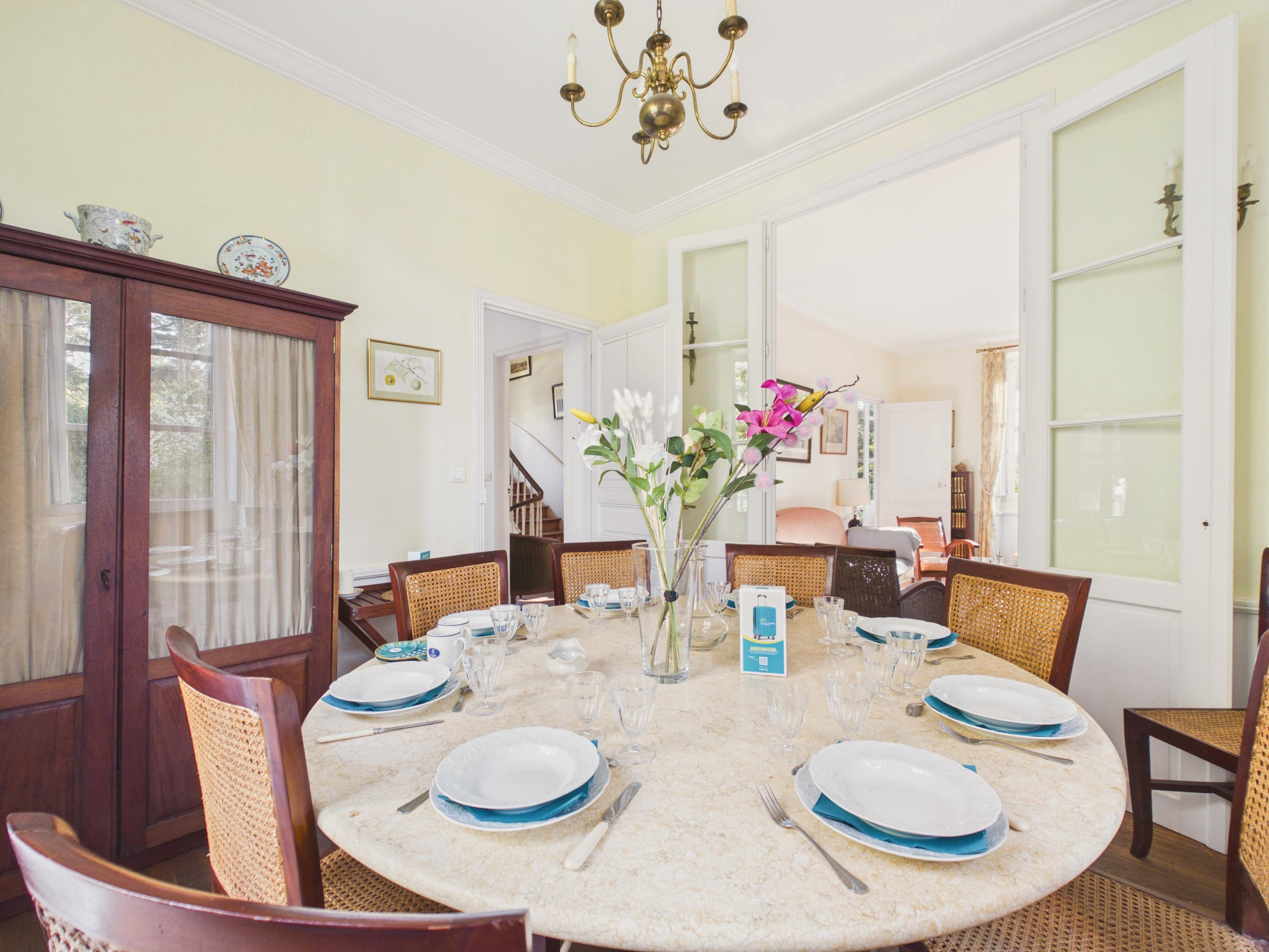 Der Eingang des Hauses erfolgt über eine Außentreppe, die in das erste Stockwerk führt. Auf der linken Seite entdecken Sie ein gemütliches Wohnzimmer, das aus einem Sofa und vier Sesseln besteht, sowie einem dekorativen Kamin, der der Räumlichkeit Charme verleiht. Auf der anderen Seite verfügt der Essbereich über einen großen runden Tisch, der bis zu 10 Personen für gesellige Mahlzeiten Platz bietet. Die separate Gasküche befindet sich in der Nähe und ist vollständig ausgestattet: Kühlschrank, Gefrierschrank, Mikrowelle, Geschirrspüler, Filterkaffeemaschine und Nespresso, Toaster, Wasserkocher und alles Notwendige, um komfortabel zu kochen. Ein kleiner Tisch ermöglicht es auch, schnell ein Frühstück einzunehmen.