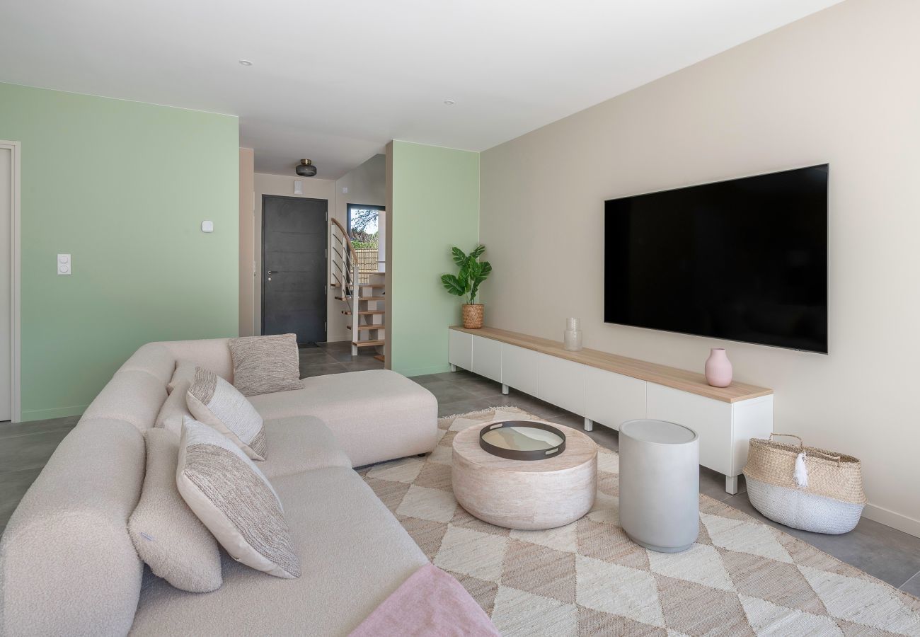 In diesem Haus finden Sie einen großen Wohnbereich mit einem Wohnzimmer, einem Sofa, einem Fernseher und direktem Zugang zum Garten durch große Glasfronten, die einen schönen Blick nach draußen bieten. Gleich dahinter befinden sich der Esstisch und die offene Küche.