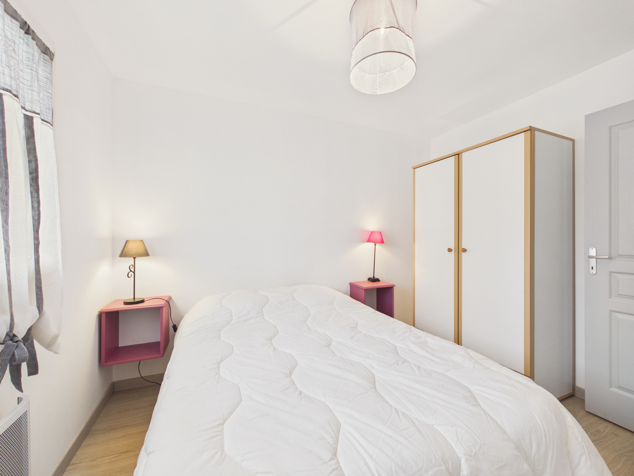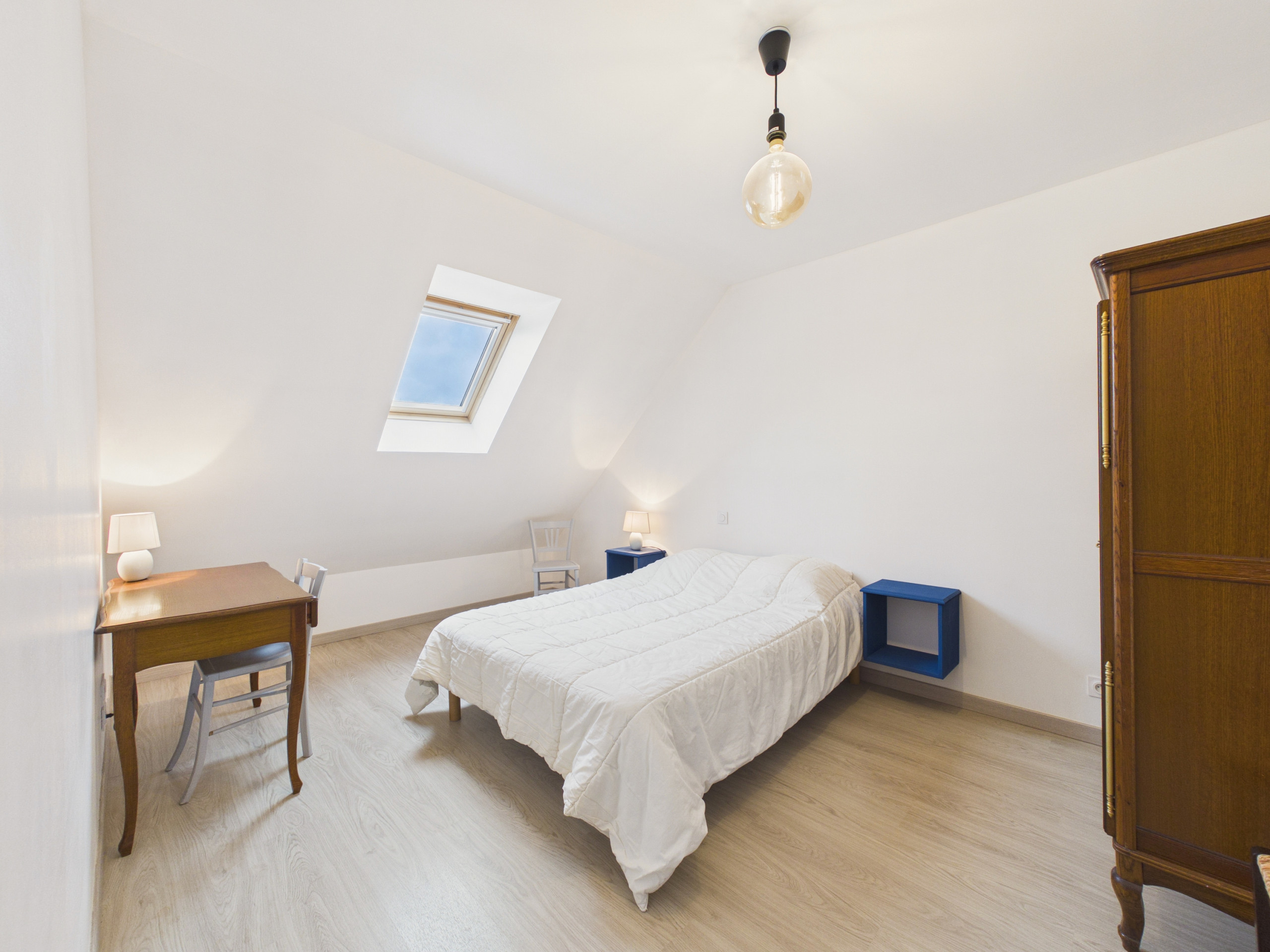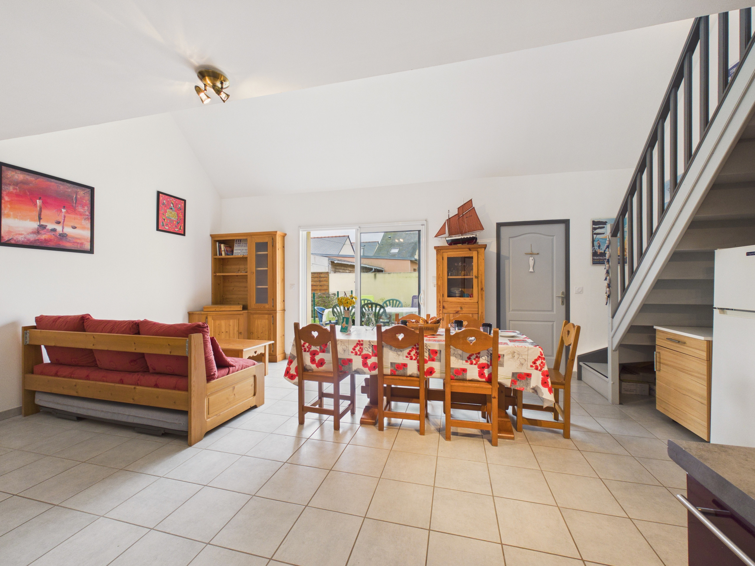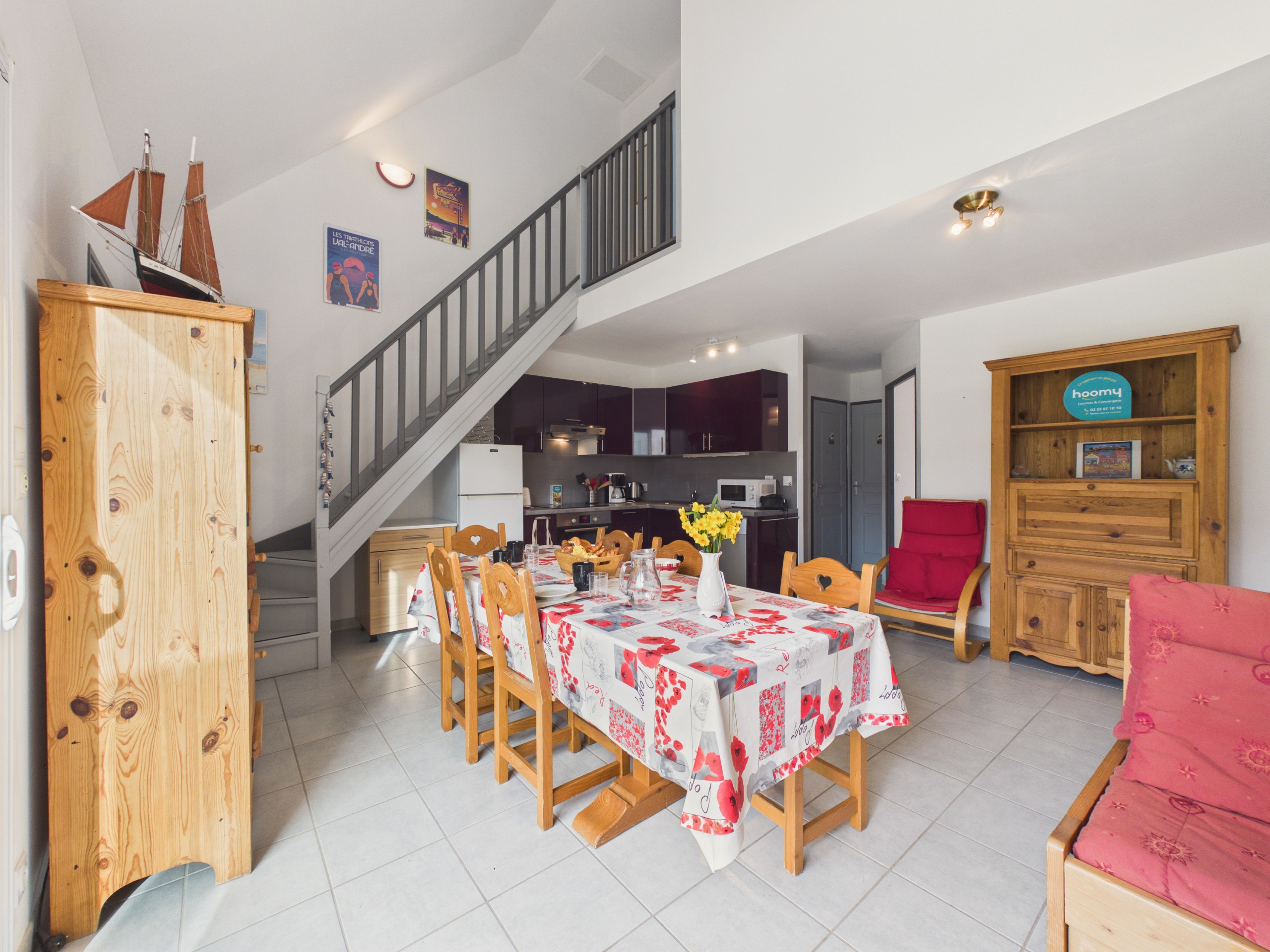 Das Haus kann 6 Personen aufnehmen und verfügt über 3 Schlafzimmer. Zwei befinden sich im Erdgeschoss und sind mit einem Doppelbett ausgestattet. Eines davon grenzt an das große Badezimmer. Im Obergeschoss finden Sie einen großen Entspannungsbereich mit einem Sofa für einen ruhigen Moment, sei es beim Filmschauen (DVD-Player), Gesellschaftsspiel oder einfach nur zum Plaudern. Darüber hinaus kann dieser Raum einen Reisenden für die Nacht aufnehmen, dank seines Einzelbetts. Anschließend finden Sie das letzte Schlafzimmer, das hübsch eingerichtet und mit einem Doppelbett ausgestattet ist.