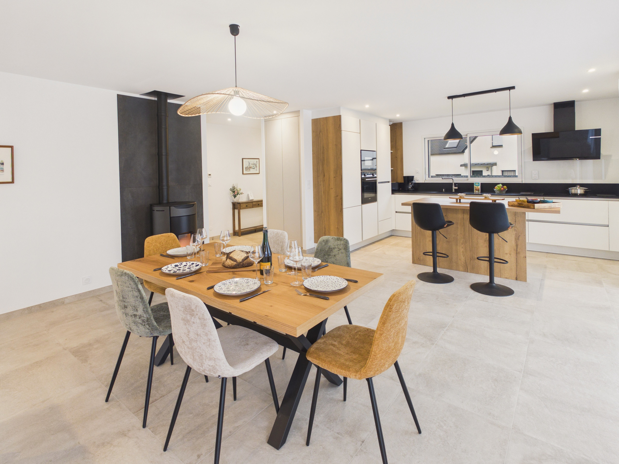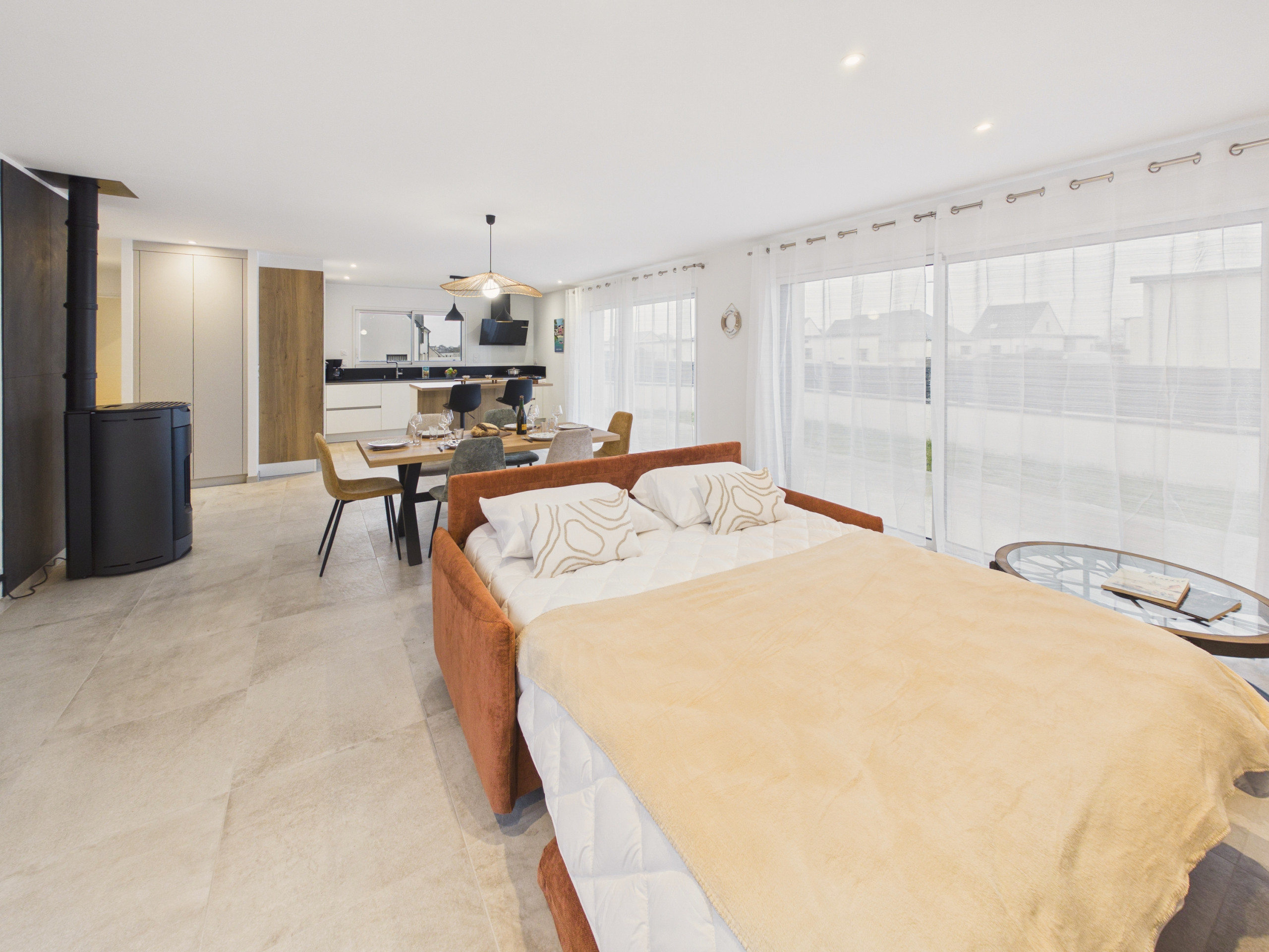 Der Wohnbereich ist einladend, mit Öffnungen, die das ganze Jahr über Blicke auf den Garten und den Pool bieten. Dies macht ihn zu einem gemütlichen Raum, in dem Sie sich gerne zum gemeinsamen Essen, zum Fernsehen oder einfach zum Entspannen mit einem Buch zusammenfinden werden. Die Küche ist sehr gut ausgestattet, um Ihnen die Zubereitung von Mahlzeiten zu erleichtern. Sie verfügt über Induktionsherde, einen Kühlschrank, eine Mikrowelle, einen Backofen, einen Gefrierschrank, eine Spülmaschine, Geschirr, Küchenutensilien, eine Filterkaffeemaschine, eine Nespresso-Kaffeemaschine, einen Toaster und einen Wasserkocher.