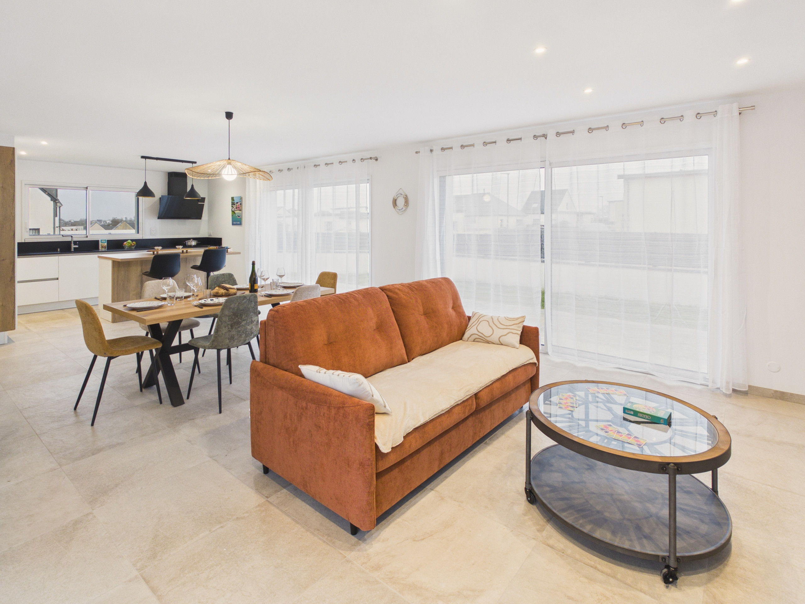 Betreten Sie die Eingangstür und entdecken Sie einen großen, modernen und lichtdurchfluteten Wohnbereich, der direkten Zugang zur Terrasse bietet. Die offene Küche, komplett ausgestattet (Kühlschrank, Gefrierschrank, Ofen, Mikrowelle, Geschirrspüler und Induktionsherde), bietet Ihnen alles Notwendige zur Zubereitung Ihrer Mahlzeiten. Zum Frühstück stehen Ihnen zusätzlich ein Wasserkocher, ein Toaster und eine Filterkaffeemaschine zur Verfügung. Teilen Sie Ihre Mahlzeiten am Esstisch im Innenbereich oder ziehen Sie bei schönem Wetter den Außentisch vor. Am Abend versammeln Sie sich in der Loungeecke, gemütlich auf dem Sofa sitzend vor dem Fernseher.