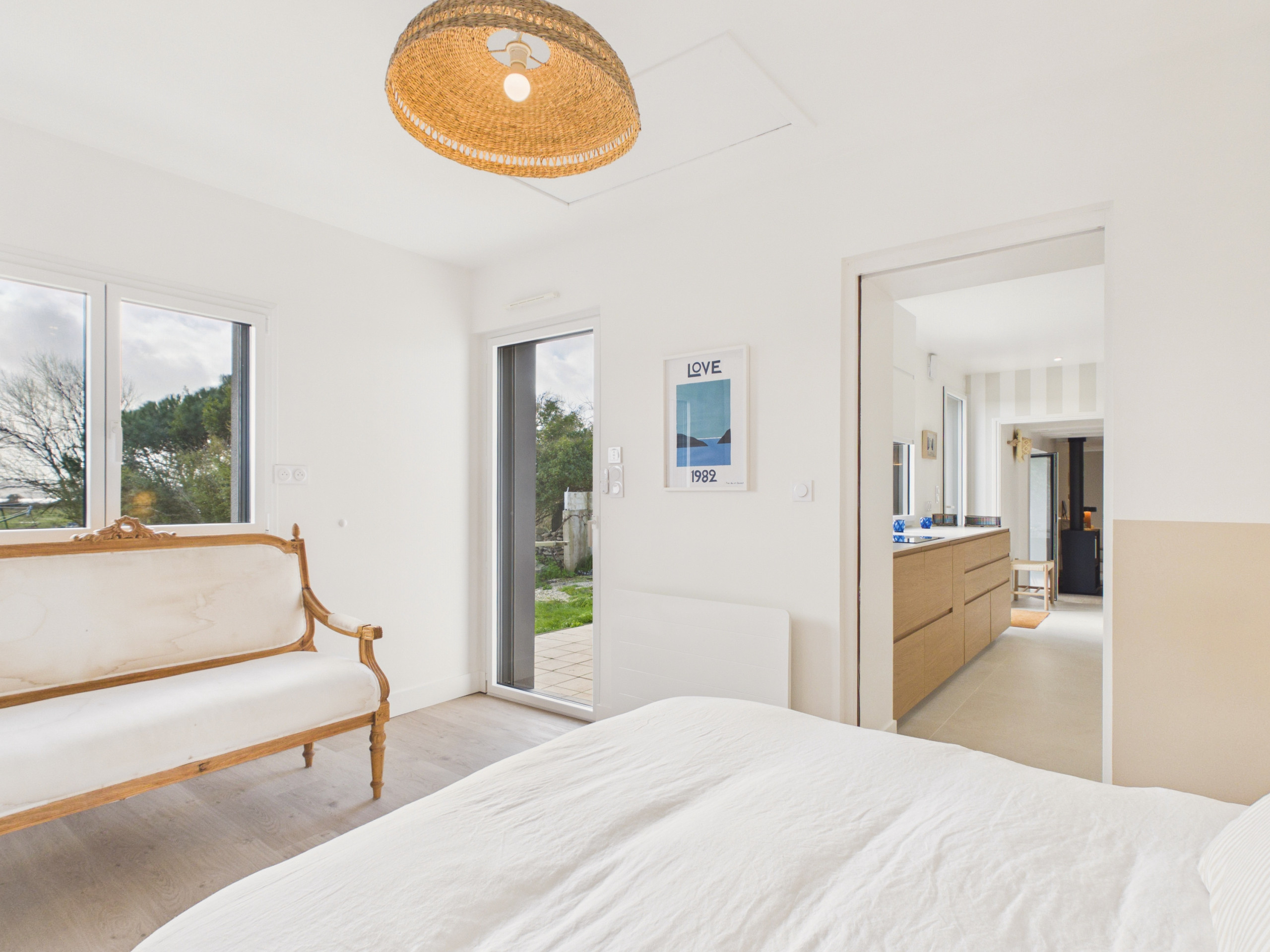 Im Inneren öffnet sich der Eingang direkt auf einen schönen, warmen und einladenden Wohnbereich. Das Wohnzimmer ist mit einem gemütlichen Sofa, einem Couchtisch und einem Schaukelstuhl eingerichtet, was in jeder Jahreszeit eine gemütliche Atmosphäre schafft. Auf der anderen Seite des Raumes befindet sich ein großer Tisch mit Eckbank und Stühlen, der bequem bis zu 7 Personen Platz bietet. Die offene, längliche Küche ist komplett ausgestattet: Induktionsherde, Kühlschrank, Gefrierschrank, Backofen, Mikrowelle, Geschirrspüler, Wasserkocher, Nespresso-Kaffeemaschine und Toaster.