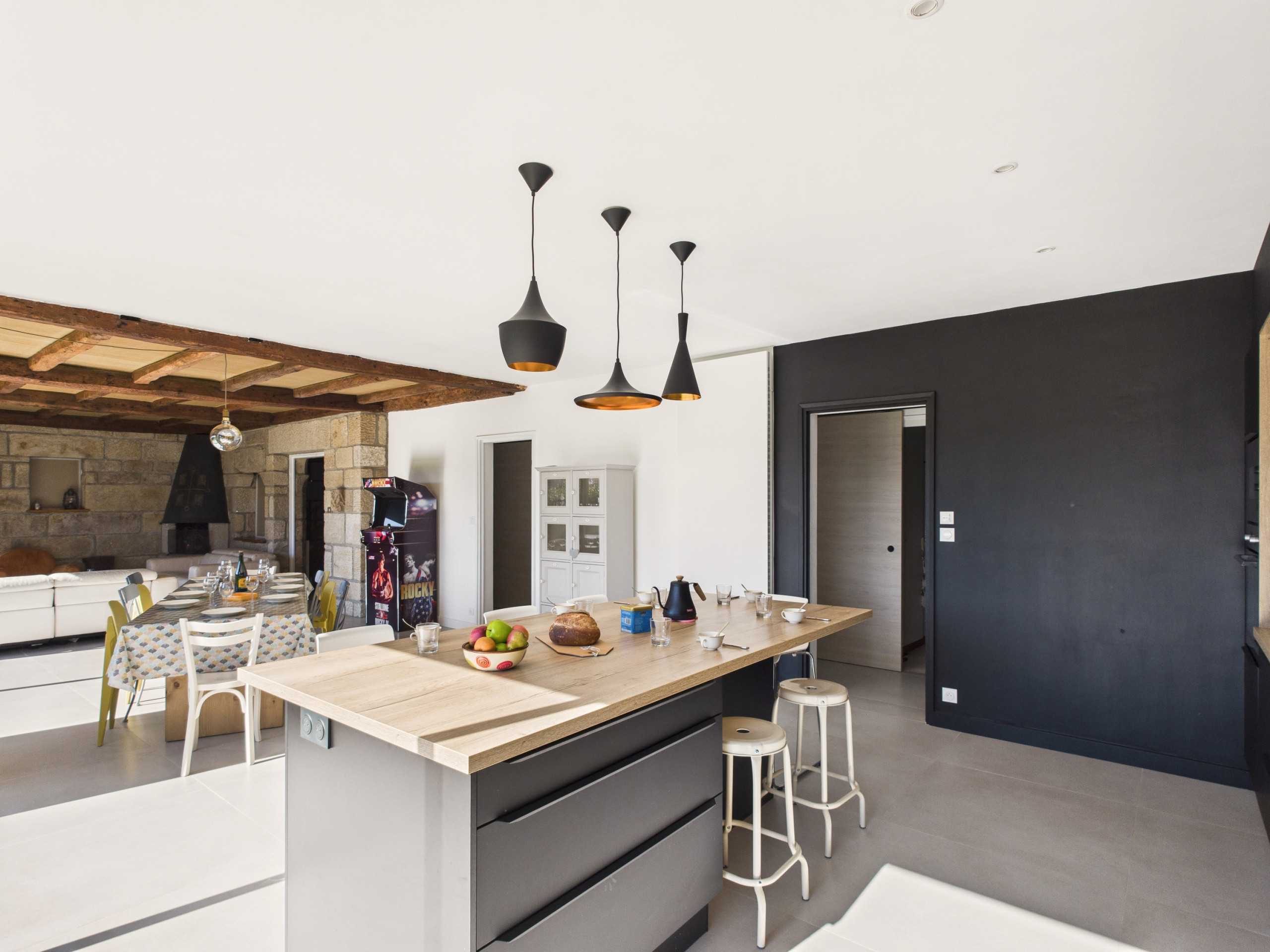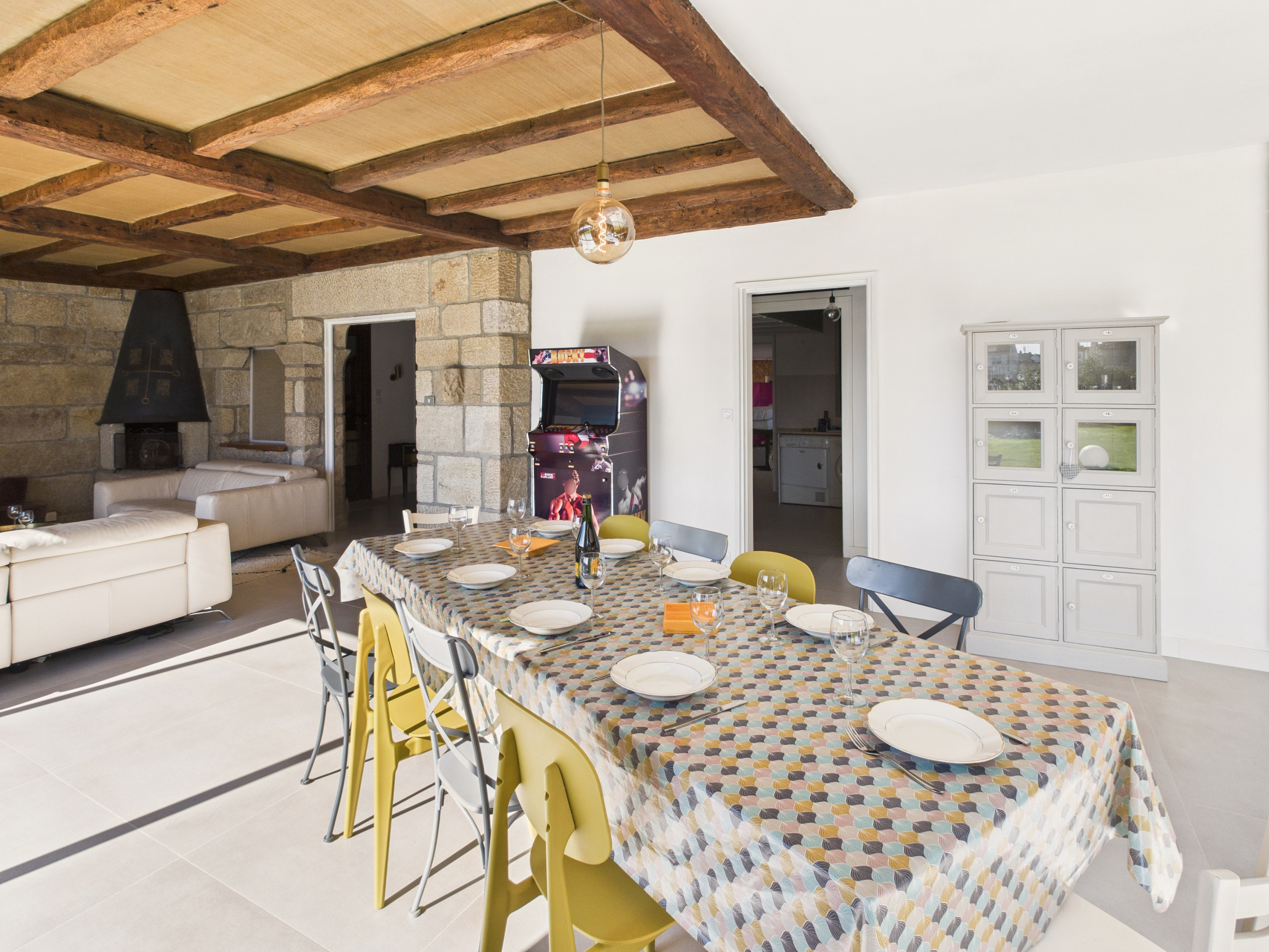 Betreten Sie den Eingang und entdecken Sie einen großen, lichtdurchfluteten Wohnbereich von etwa 65 m², der zur Terrasse und zum Garten hin offen ist. Die offene und moderne Küche ist komplett ausgestattet (Kühlschrank, Gefrierschrank, Backofen, Mikrowelle, Geschirrspüler) und bietet Ihnen alles Notwendige zum Kochen wie zu Hause. Für Ihr Frühstück stehen Ihnen ein Wasserkocher, ein Toaster und eine Kapselmaschine von Magimix zur Verfügung. Teilen Sie Ihre Mahlzeiten an dem Esstisch für 10 Personen oder genießen Sie bei schönem Wetter den Tisch auf der Terrasse. Am Abend treffen Sie sich in der Loungeecke, bequem auf den Sofas sitzend vor dem Fernseher. Zusätzlich steht Ihnen eine Abstellkammer zur Verfügung, mit einem Spülbecken, zahlreichen Stauraummöglichkeiten, einer Waschmaschine und einem Trockner.