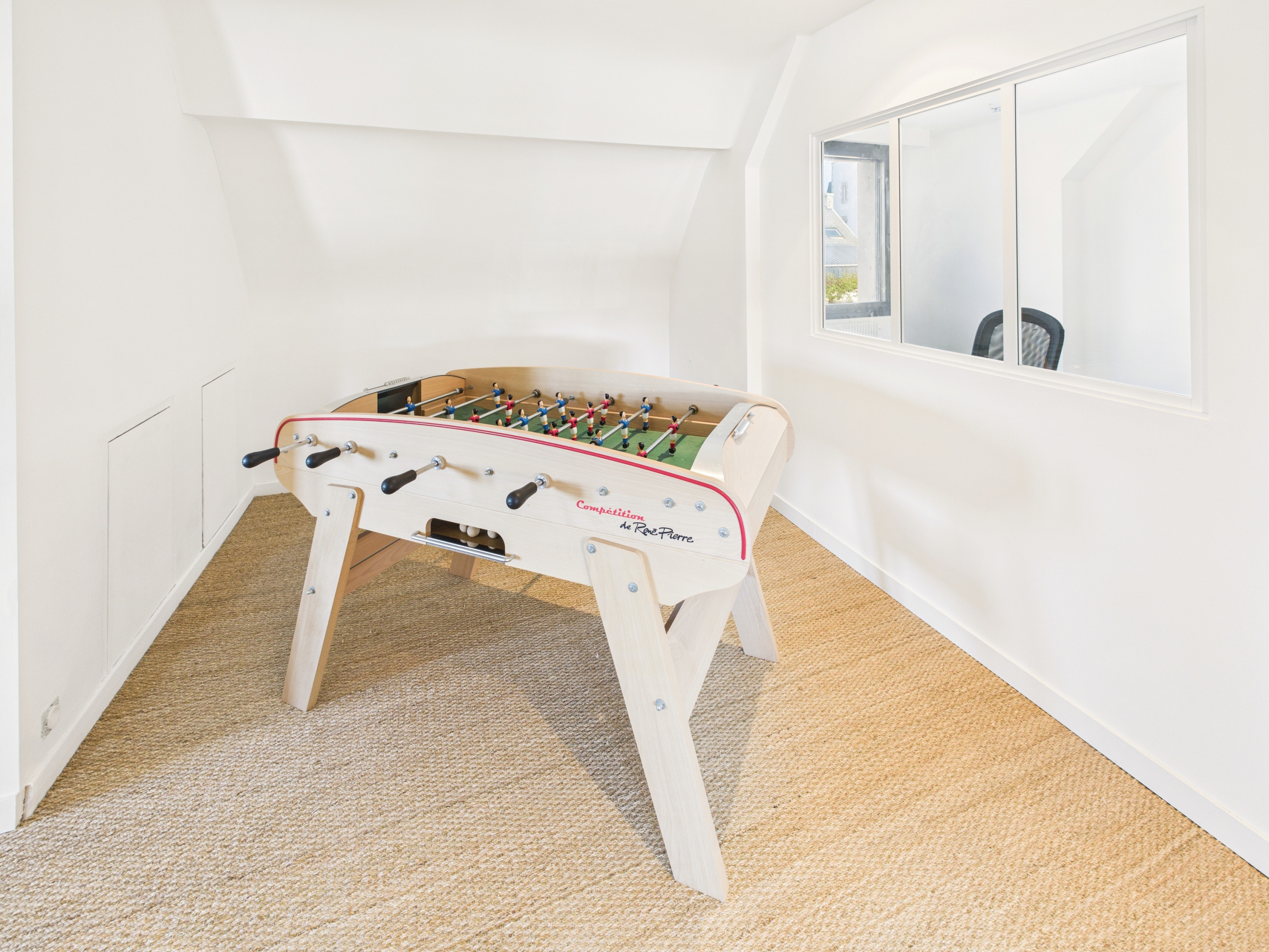 Im Obergeschoss befinden sich auch ein zweites Badezimmer mit Dusche und Badewanne, ein Tischkicker und ein Bürobereich, ideal zum Homeoffice.