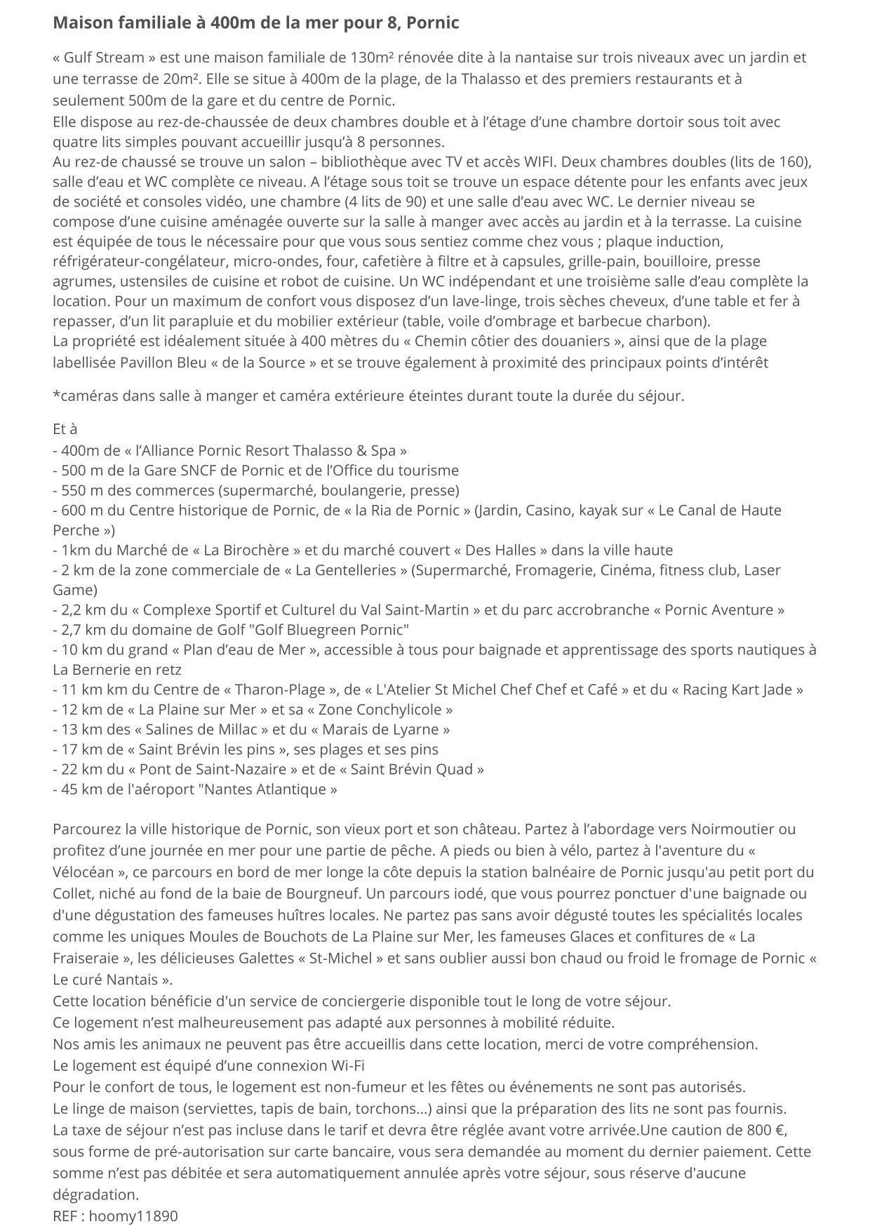 Die Kurtaxe ist nicht im Tarif enthalten und muss vor Ihrer Ankunft bezahlt werden. Eine Kaution von 800 €, in Form einer Vorautorisierung auf Ihrer Kreditkarte, wird Ihnen bei der letzten Zahlung abverlangt. Dieser Betrag wird nicht abgebucht und wird nach Ihrem Aufenthalt automatisch storniert, vorbehaltlich keine Beschädigungen.