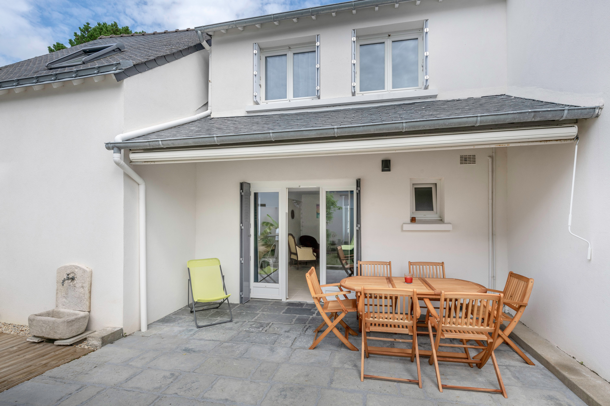 Das Haus verfügt über eine nach Süden ausgerichtete Terrasse (Markise und Innenhof), auf der Sie gerne ein gutes Frühstück, ein Sonnenbad oder sogar einen sehr frischen Aperitif mit gutem Grillfleisch genießen können. Die Terrasse ist mit einer Wasserstelle für die Rückkehr vom Strand, einer Gasgrillplatte, einem Tisch und 6 Stühlen, 2 Liegestühlen und 2 Liegestühlen ausgestattet, um den Blumengarten zu genießen.