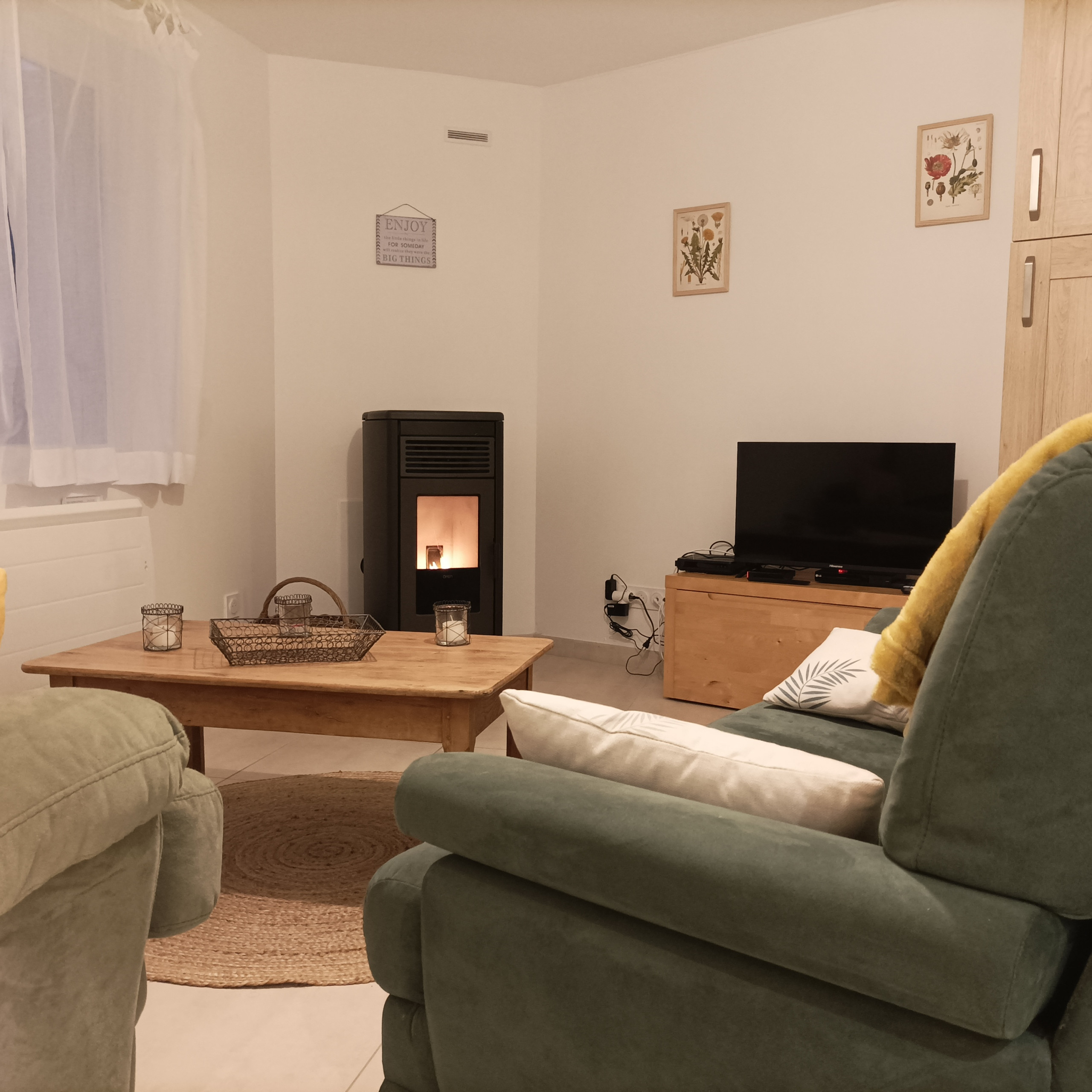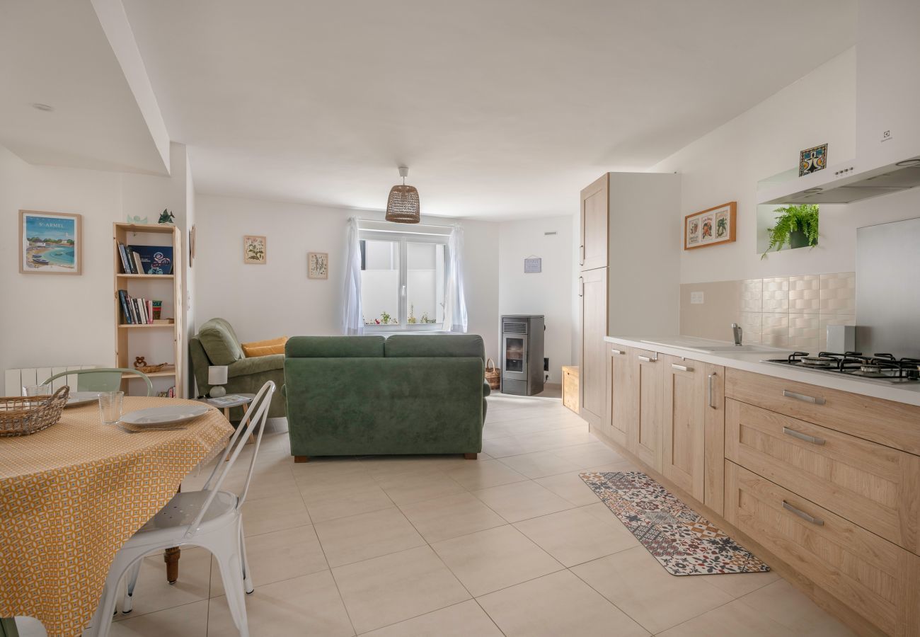 Das Haus bietet Platz für bis zu 4 Personen und ist in zwei Etagen aufgeteilt. Im Erdgeschoss befindet sich der Wohnraum mit einem Wohnzimmer, einer gemütlichen Ecke, in der Sie auf einem der beiden Sofas sitzen können, um einen Fernsehmoment (DVD-Player) oder ein Feuer mit Pelletofen zu genießen. Sie finden den Küche-Essbereich. Die Küche ist neu und sehr gut ausgestattet (Gasherd, Kühlschrank, Kühlschrank, Mikrowelle, Backofen, Waschmaschine, Geschirrspüler, Filterkaffeemaschine, Toaster und Wasserkocher). Sie werden sich gerne dort treffen, um gute Mahlzeiten zuzubereiten und diese dann auf dem Esstisch zu teilen.