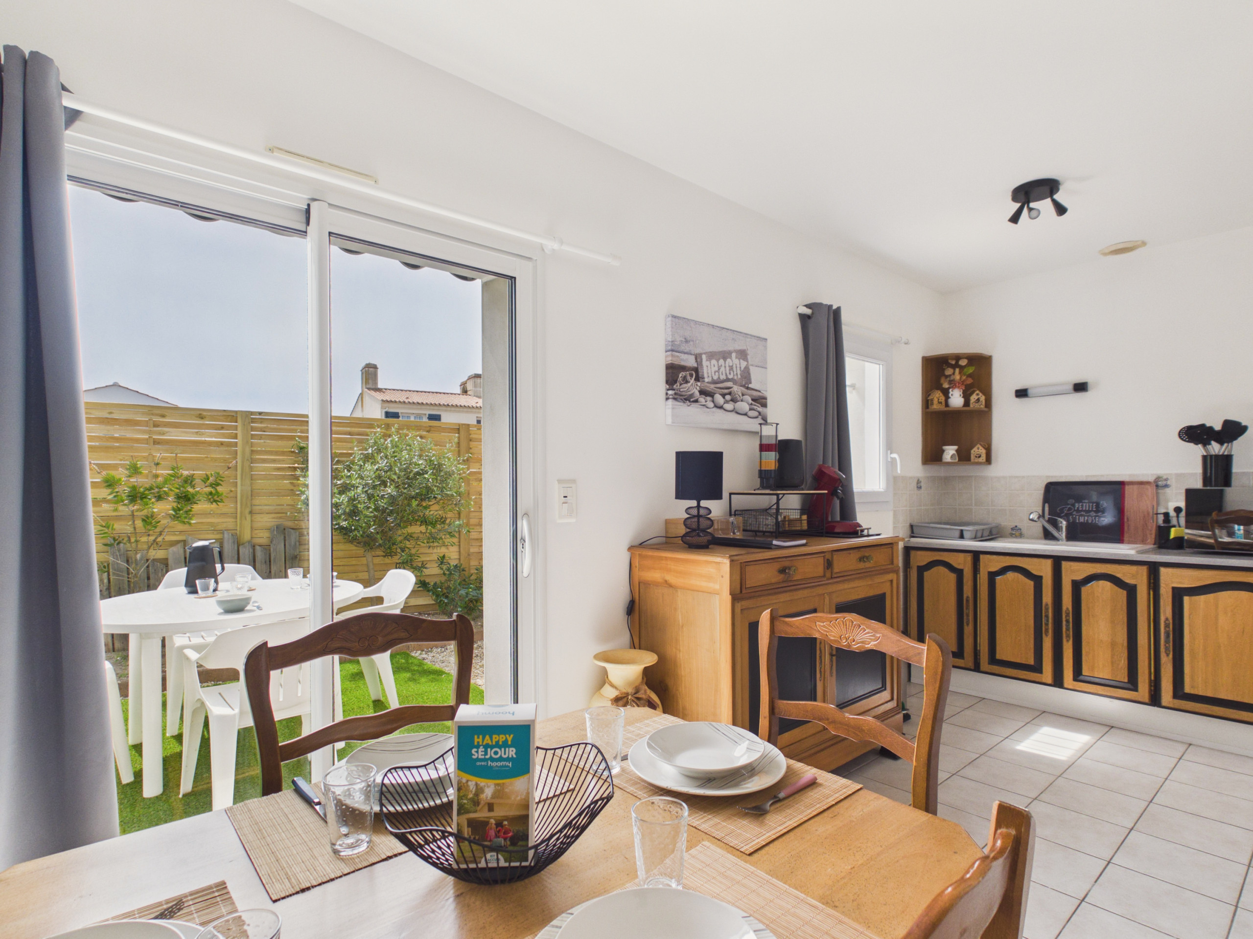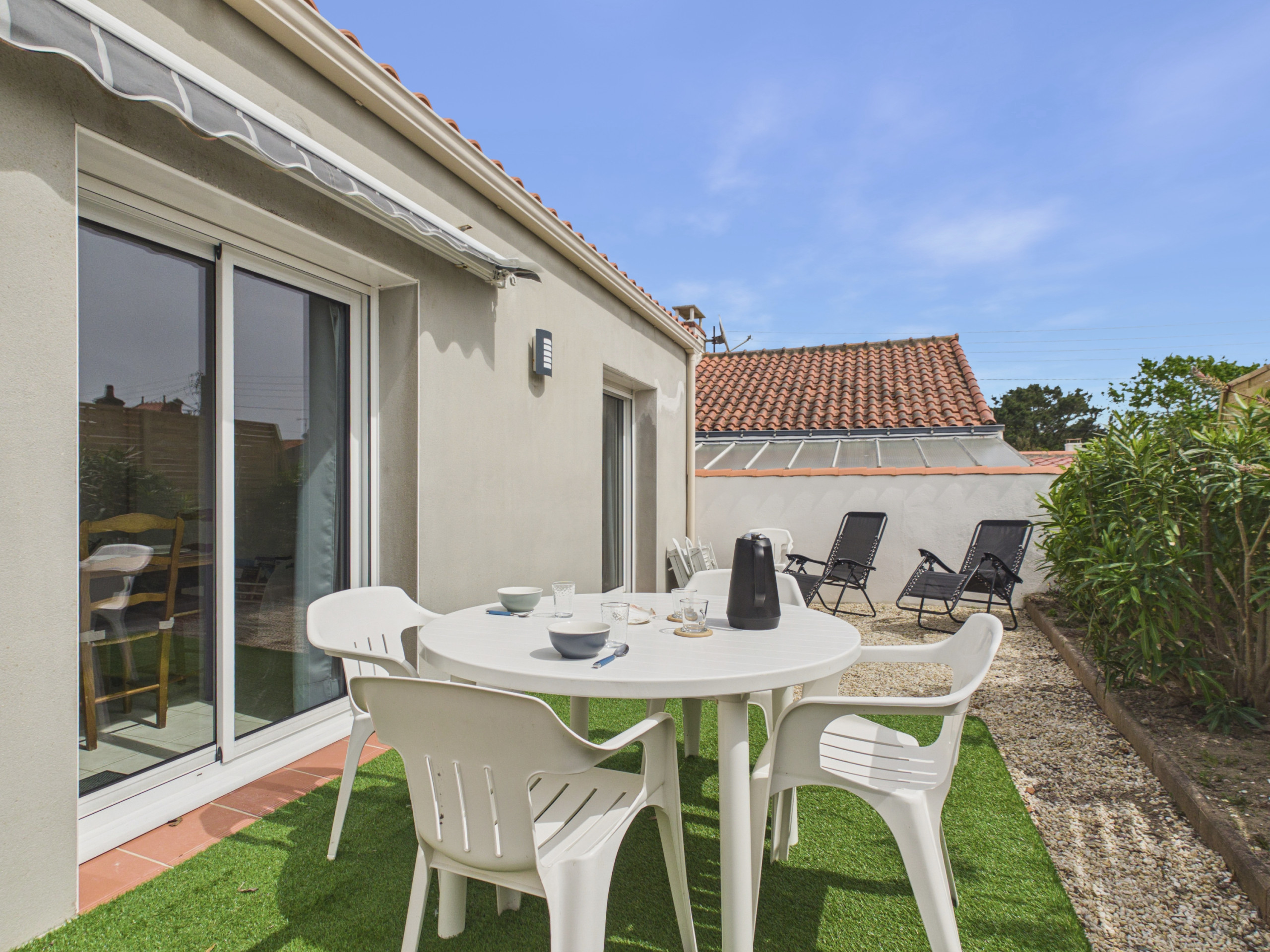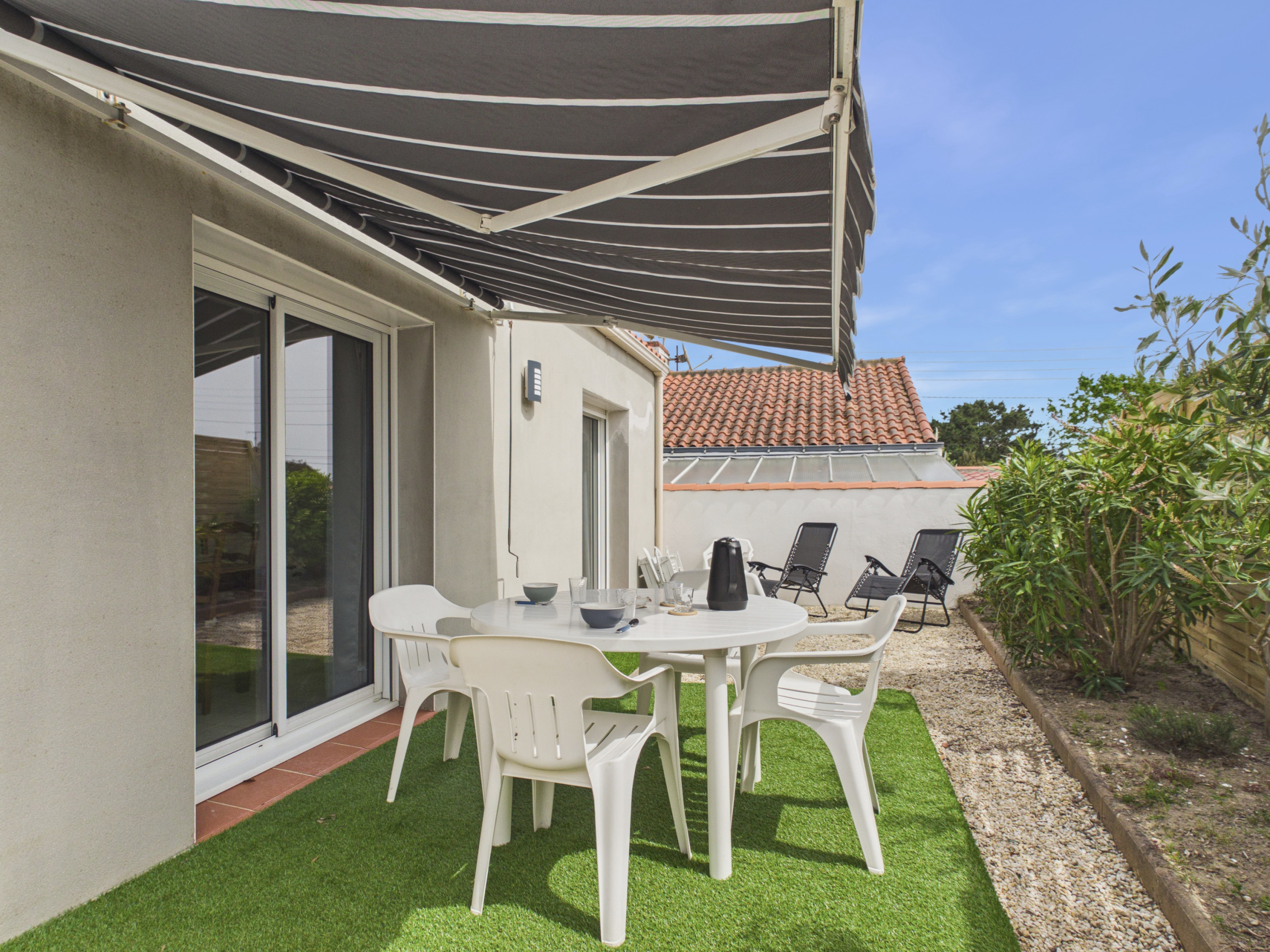 Im Außenbereich ermöglicht ein kleiner, mit Gartenmöbeln ausgestatteter Hof, dass Sie Mahlzeiten im Freien genießen oder Momente der Entspannung unter der Vendée-Sonne verbringen können.