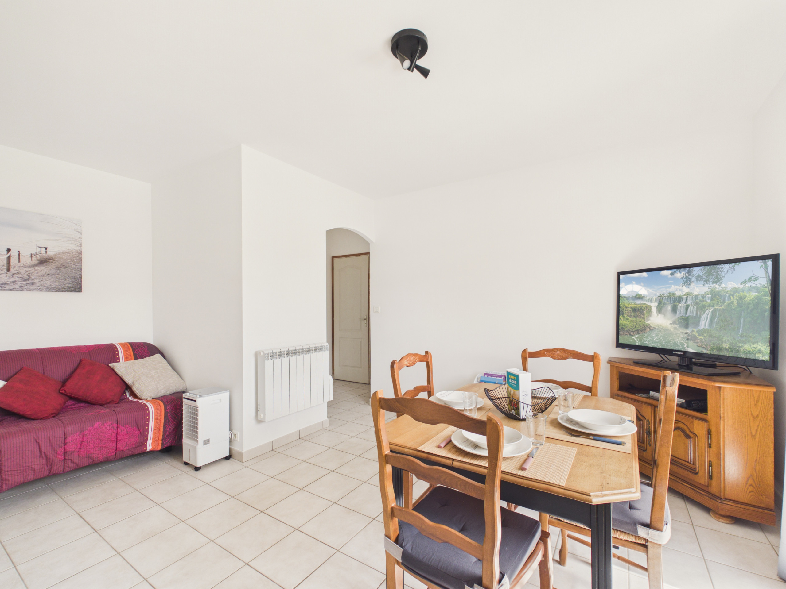 Bei Ihrer Ankunft entdecken Sie einen hellen Wohnbereich mit einer Sitzecke, bestehend aus einem Sofa und einem Fernseher, ideal um gemütliche Momente zu verbringen. Sie können Ihre Mahlzeiten am Tisch im Inneren einnehmen oder den Gartentisch auf der Terrasse nutzen.