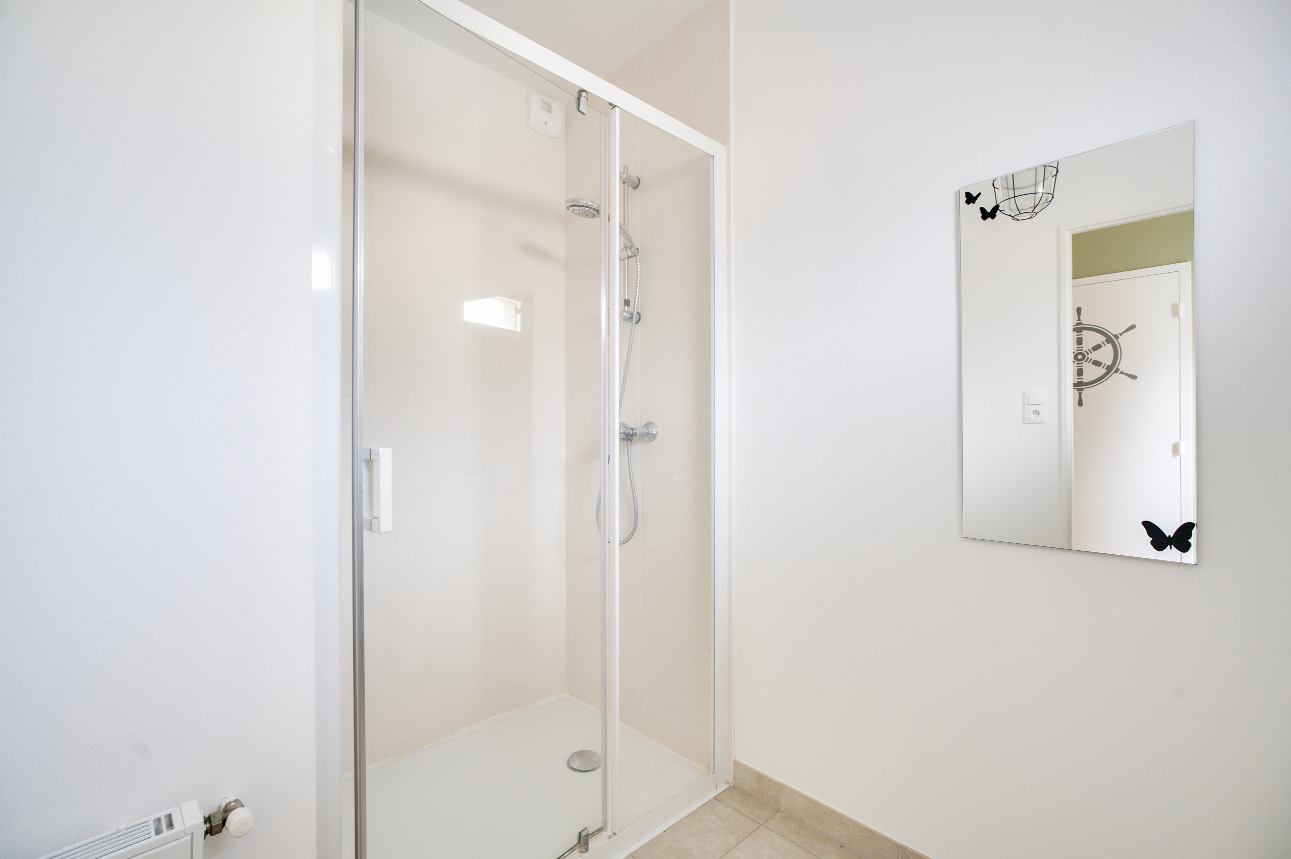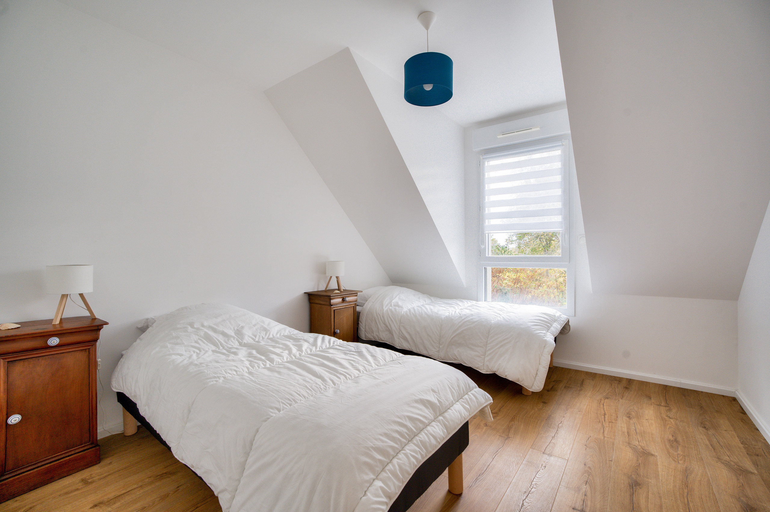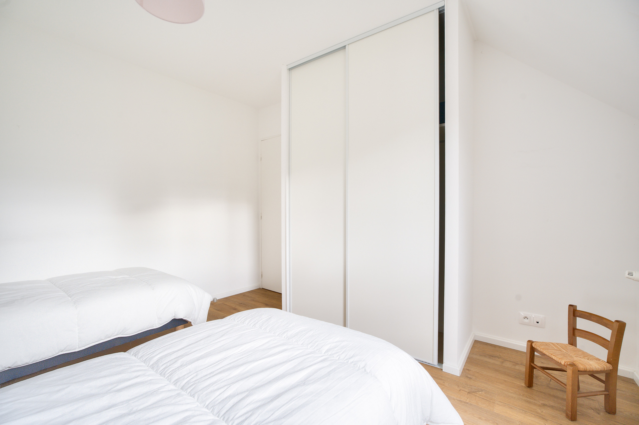 Im Obergeschoss besteht der Schlafbereich aus einem Zimmer mit einem Queen-Size-Bett (160 x 200) und einem kleinen Arbeitsbereich. Ein zweites Zimmer bietet ebenfalls ein Queen-Size-Bett (160 x 200). Im dritten Zimmer finden Sie zwei Einzelbetten (90 x 200). Das Badezimmer verfügt über eine Badewanne, Waschbecken, einen Haartrockner und einen Handtuchtrockner. Ein Arbeitsbereich in der Galerie mit Stuhl und Sessel (ideal für Heimarbeit). Eine separate Toilette befindet sich ebenfalls im Obergeschoss.