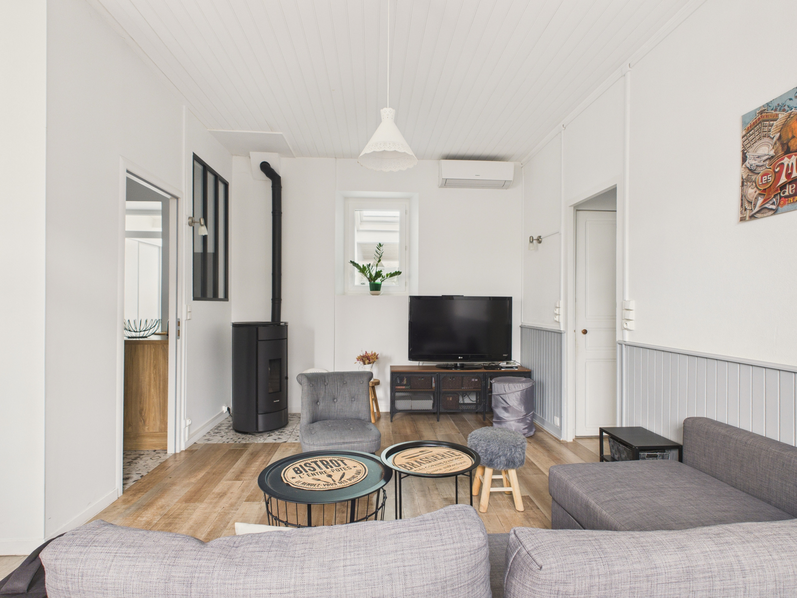 Das TV-Wohnzimmer und der Essbereich verfügen über einen Pelletofen (Pellets zur Verfügung) sowie eine Klimaanlage mit Umkehrfunktion. Zwei ebenerdig gelegene Schlafzimmer, eines mit einem Queen-Size-Bett (160x200), das andere mit zwei Doppelbetten (140x190), sowie eine separate Toilette vervollständigen dieses Haus.