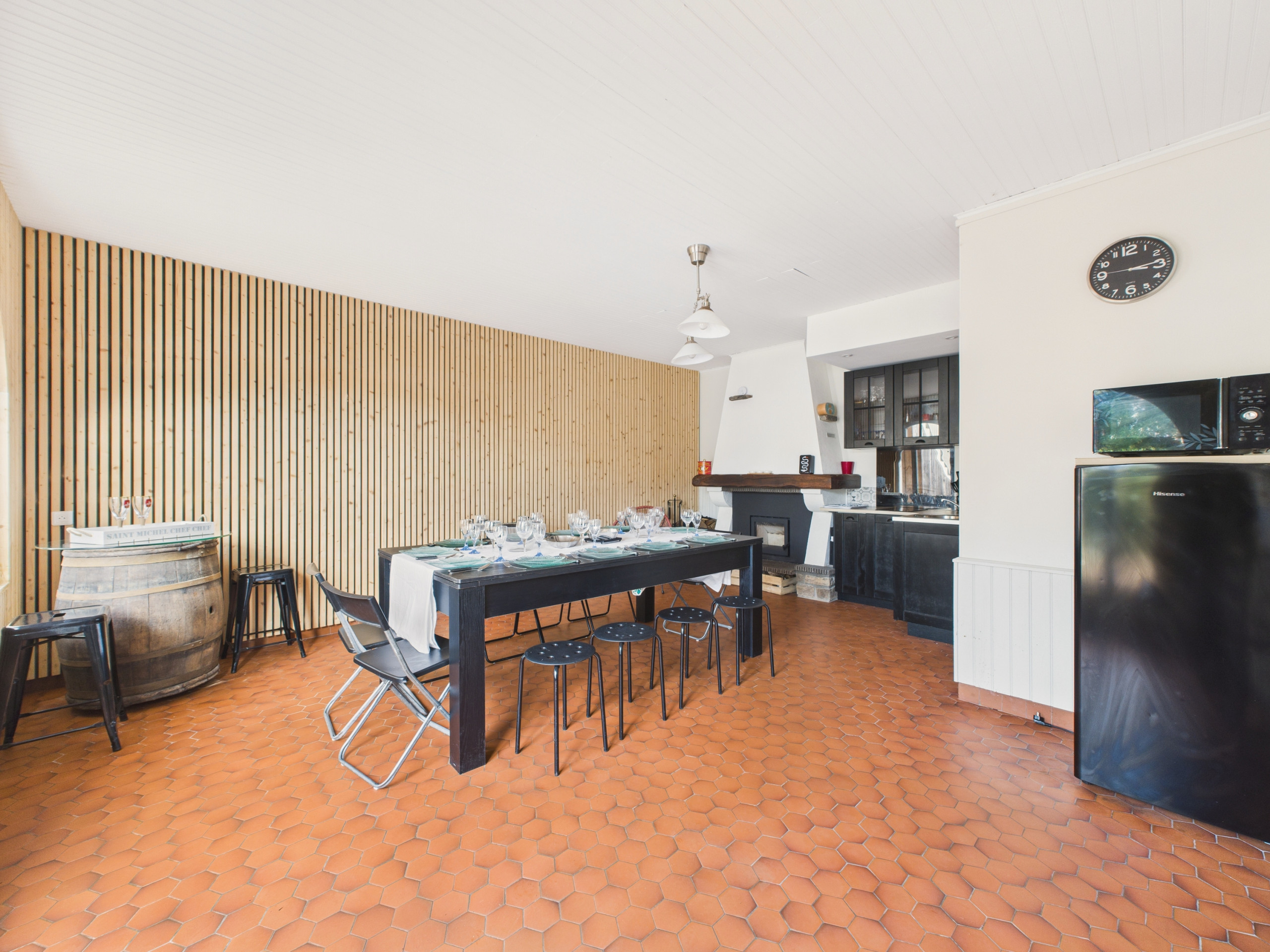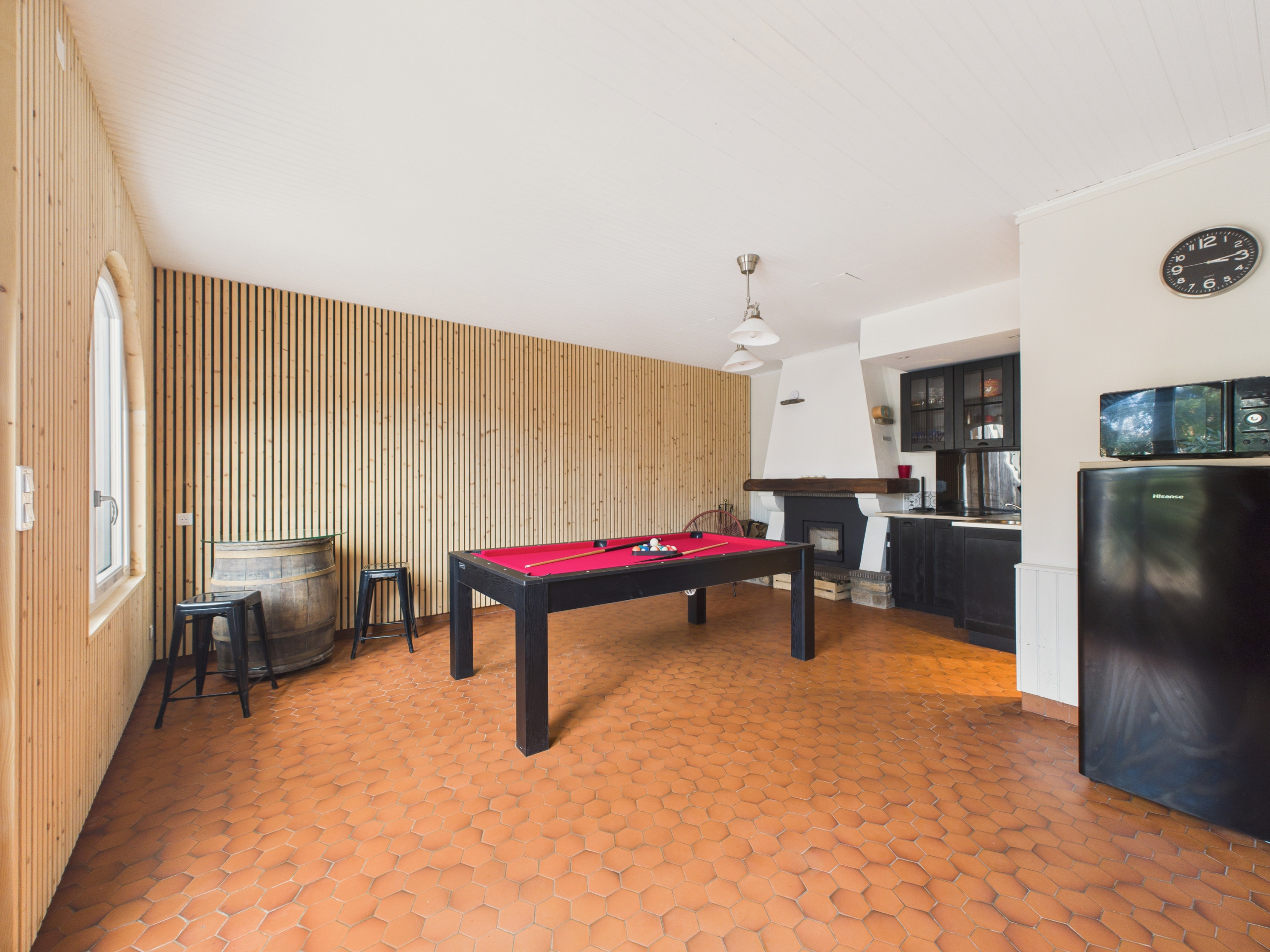 Mit Zugang von außen verfügt das Nebenhaus über einen Wohnraum mit einer kleinen Küche, einem Holzkamin-Insert und einem großen, verwandelbaren Tisch, der als Billardtisch oder Tischtennisplatte dienen kann und alle Gäste zum Essen aufnehmen kann. Eine separate Toilette vervollständigt das Erdgeschoss.
