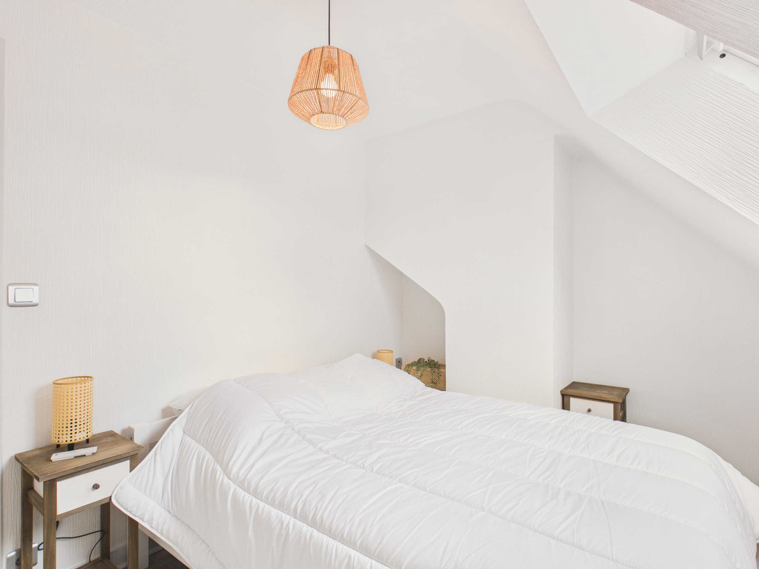 Im Obergeschoss bietet der Schlafbereich zwei weitere Zimmer: eines mit einem Doppelbett, das andere mit zwei Doppelbetten (davon eines von 130/180), sowie ein Badezimmer mit Badewanne. Ein Reisebett und eine Babymatratze werden ebenfalls zur Verfügung gestellt.