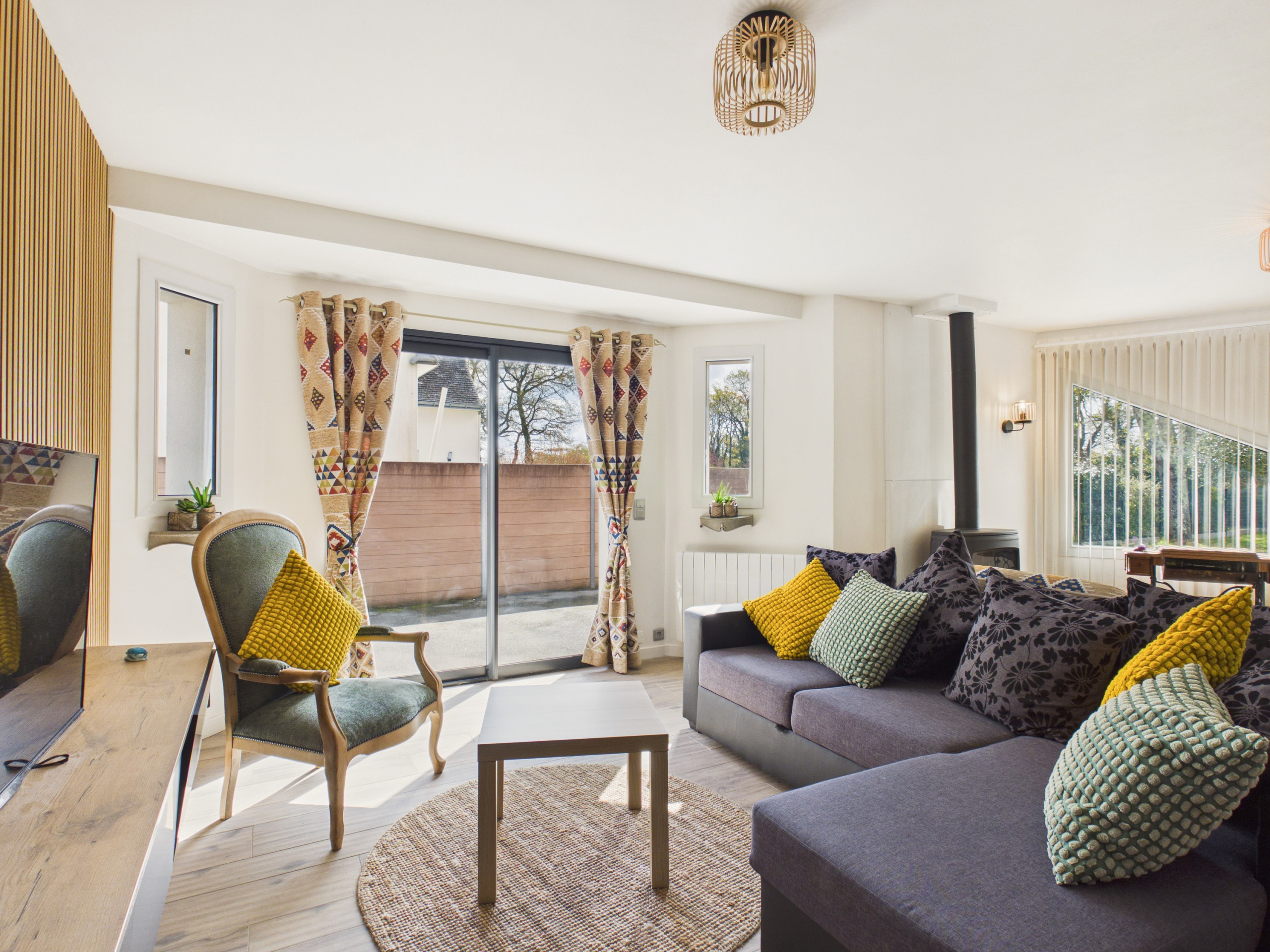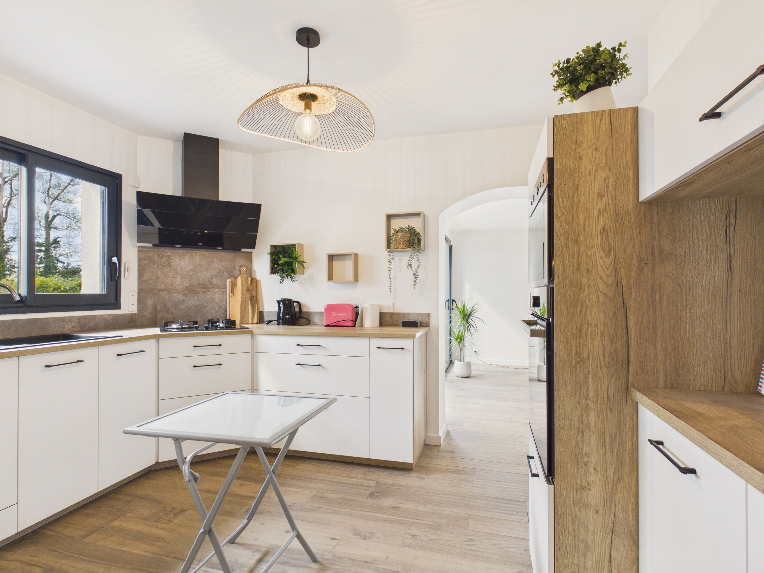 Betreten Sie die Eingangstür und entdecken Sie einen angenehmen Wohnbereich, der Zugang zur Terrasse bietet. Die offene und moderne Küche (Kühlschrank, Gefrierschrank, Gasherde, Ofen, Mikrowelle, Geschirrspüler) ermöglicht es Ihnen, Ihre Mahlzeiten wie zu Hause zuzubereiten. Zum Frühstück stehen Ihnen auch ein Wasserkocher, ein Toaster sowie zwei Kaffeemaschinen (eine Filterkaffeemaschine und eine Espressomaschine) zur Verfügung. Sie können Ihre Mahlzeiten am Esstisch im Innenbereich teilen oder bei schönem Wetter die Terrassentafel genießen. Am Abend können Sie sich in der Loungeecke auf dem Sofa vor dem Fernseher gemütlich machen.