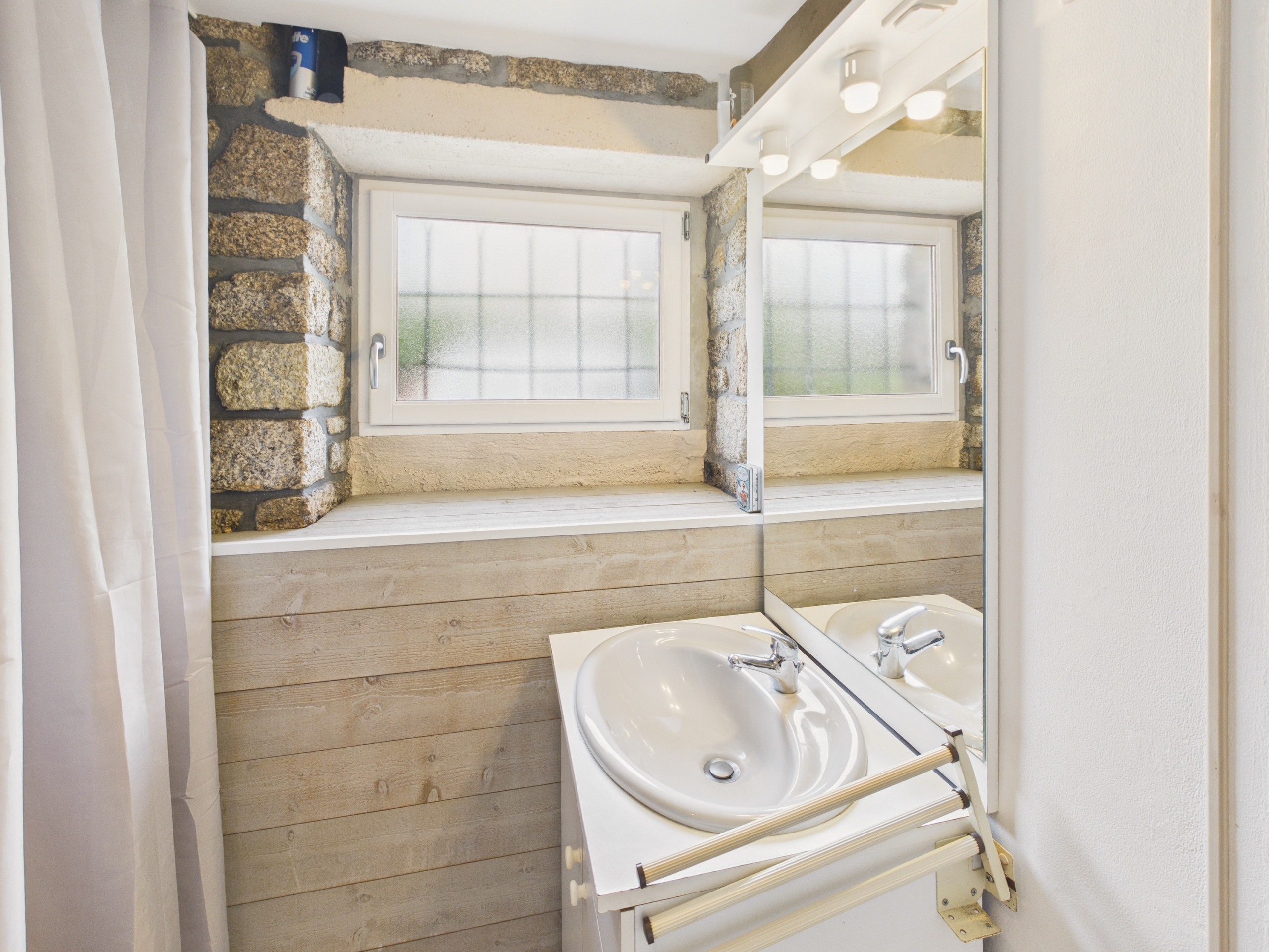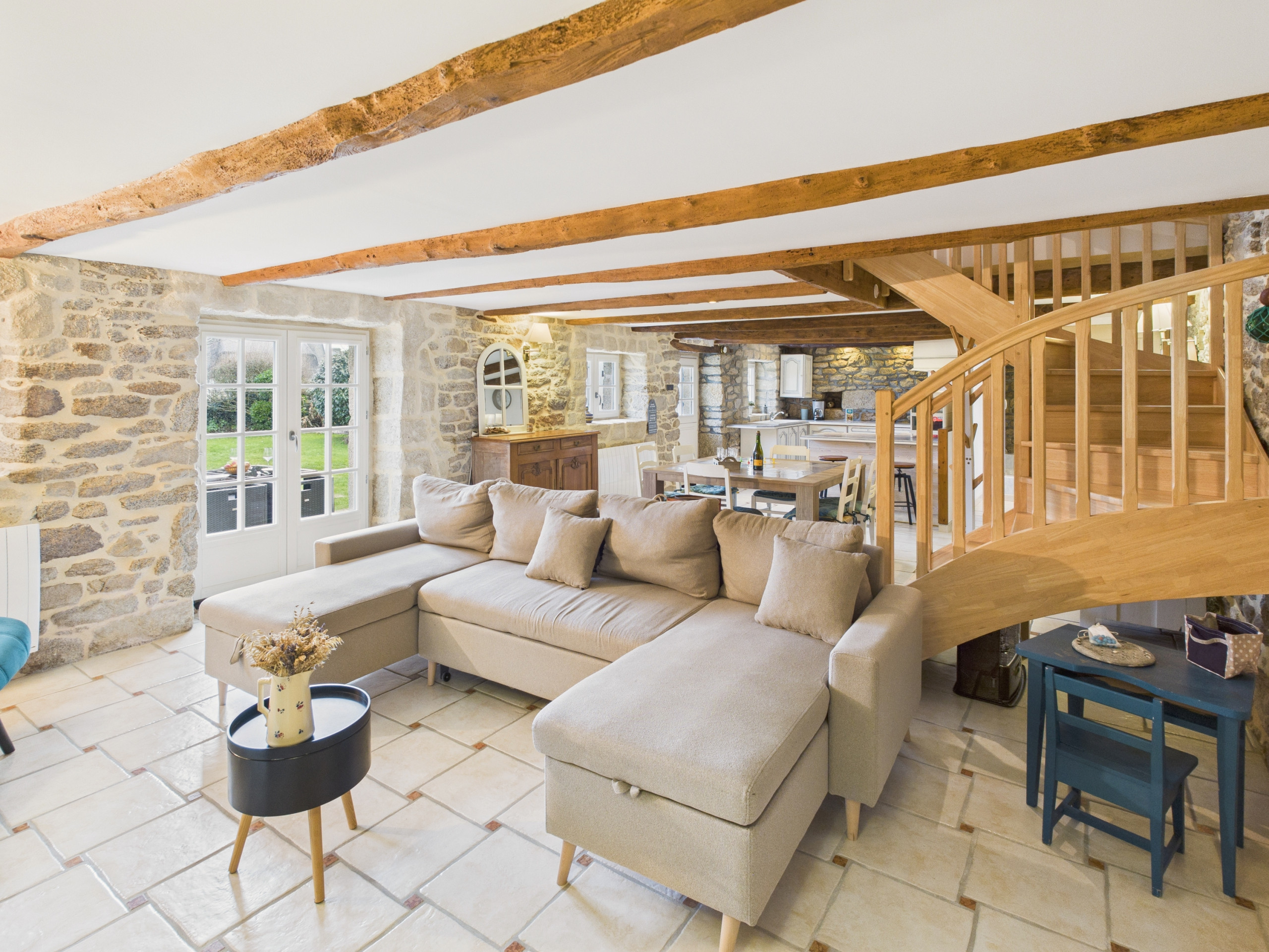 Im Inneren werden Sie einen schönen Wohnbereich von 50 m² entdecken, der hübsch mit Sichtmauerwerk dekoriert ist. Die offene Küche, komplett ausgestattet (Kühlschrank, Gefrierschrank, Ofen, Mikrowelle und Gasherd), bietet Ihnen alles Notwendige zur Zubereitung Ihrer Mahlzeiten. Zum Frühstück stehen Ihnen auch ein Wasserkocher, ein Toaster und eine Filterkaffeemaschine zur Verfügung. Teilen Sie Ihre Mahlzeiten am Esstisch im Innenbereich oder genießen Sie bei schönem Wetter den Tisch auf der Terrasse. Am Abend machen Sie es sich gemütlich in der Sitzecke, gegenüber vom Fernseher.