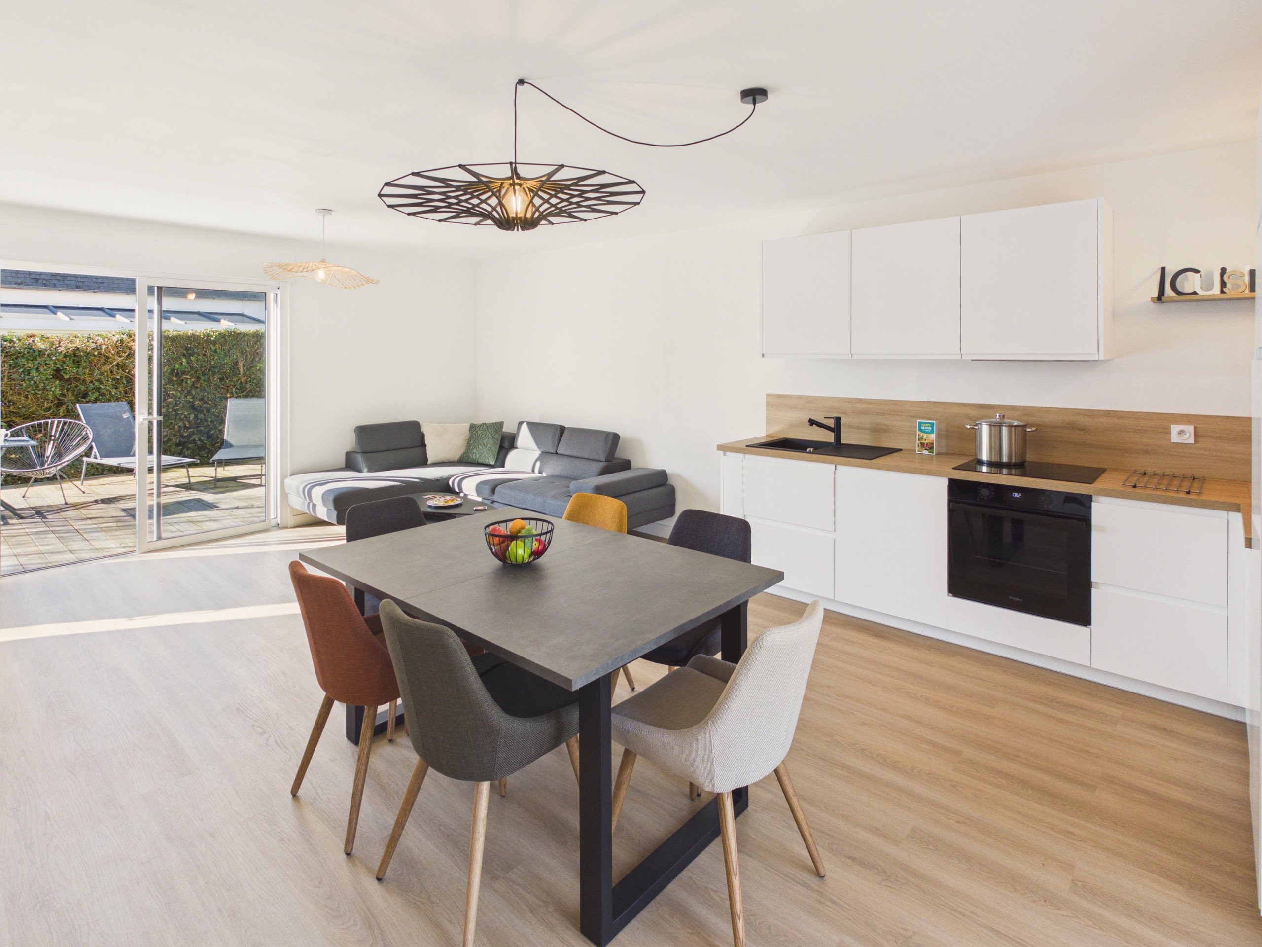 Betreten Sie die Eingangstür und entdecken Sie einen schönen Wohnbereich, der einerseits zur Veranda und andererseits zur Terrasse führt. Die offene und moderne Küche (Kühlschrank, Induktionsherde, Backofen, Mikrowelle, Geschirrspüler) ermöglicht es Ihnen, Ihre Mahlzeiten wie zu Hause zuzubereiten. Zum Frühstück steht Ihnen auch ein Wasserkocher, ein Toaster sowie zwei Kaffeemaschinen (eine Filterkaffeemaschine und eine Senseo) zur Verfügung. Teilen Sie Ihre Mahlzeiten am Esstisch oder am Verandatisch. Am Abend treffen Sie sich in der Loungeecke, gemütlich auf dem Sofa vor dem Fernseher.