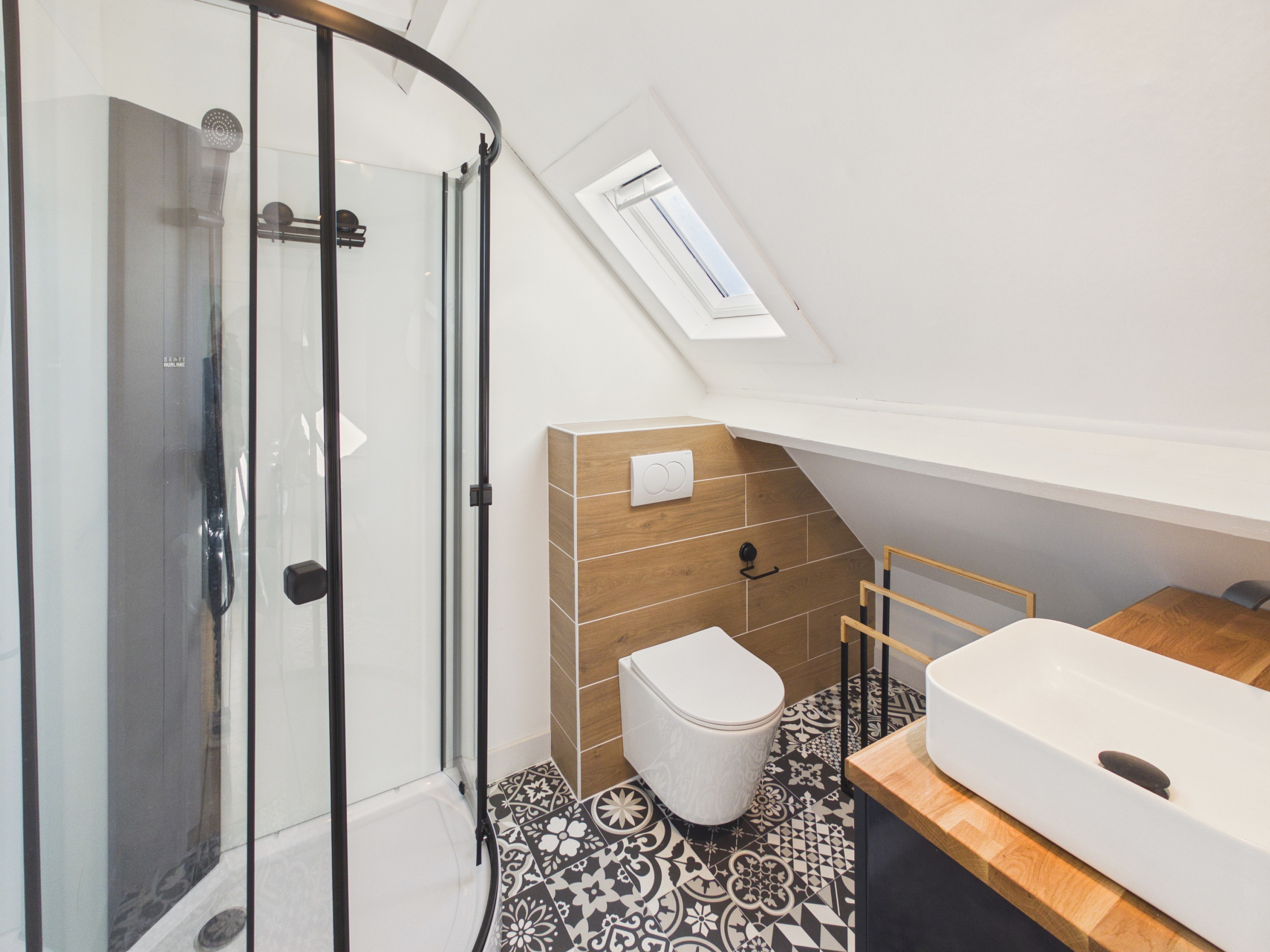 Sobald die Nacht hereingebrochen ist, finden Sie im Obergeschoss zwei Schlafzimmer. Das erste bietet eine gemütliche Atmosphäre in hellen Tönen, in der Sie sich kuscheln möchten. Das zweite Schlafzimmer ist einladend mit seiner Holzdecke und schafft so einen Kokon, in dem Sie sich gerne in seinem Kingsize-Bett einrichten werden. Darüber hinaus ist dieses Zimmer flexibel, da es sich um zwei aneinandergeklebte Einzelbetten handelt. Wenn Sie möchten, können drei Kinder in diesem Zimmer schlafen, indem Sie die Betten trennen und das verfügbare Zusatzbett aufklappen. Da das Haus 6 Personen aufnehmen kann, können die beiden anderen Bewohner im Wohnzimmer schlafen - Sie müssen nur das Sofa ausklappen!