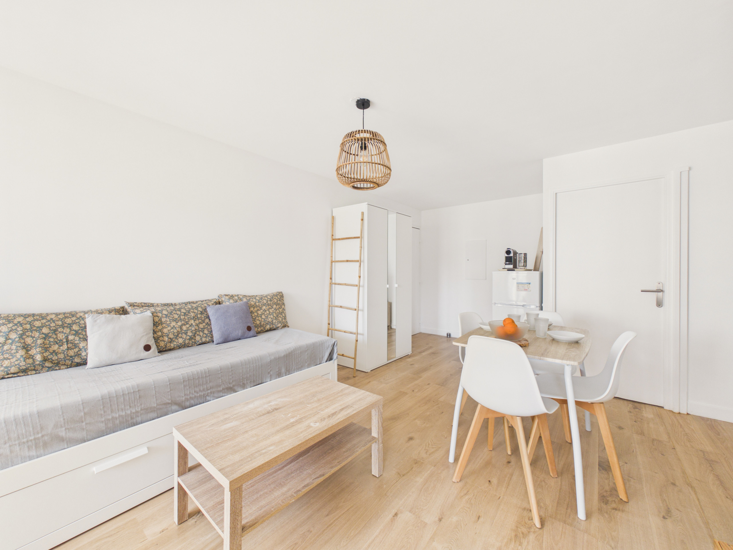 Sobald Sie in dieser Wohnung ankommen, werden Sie das helle Wohnzimmer mit Zugang zum Balkon entdecken. Dort finden Sie ein Schlafsofa, das 2 Kinder beherbergen kann. Sie verfügen über einen Esstisch und eine offene Küche. Vollständig ausgestattet, verfügt sie über das Nötigste zum Kochen mit Induktionskochfeld, Mikrowelle, Geschirrspüler, Wasserkocher, Toaster und Krups-Kaffeemaschine.