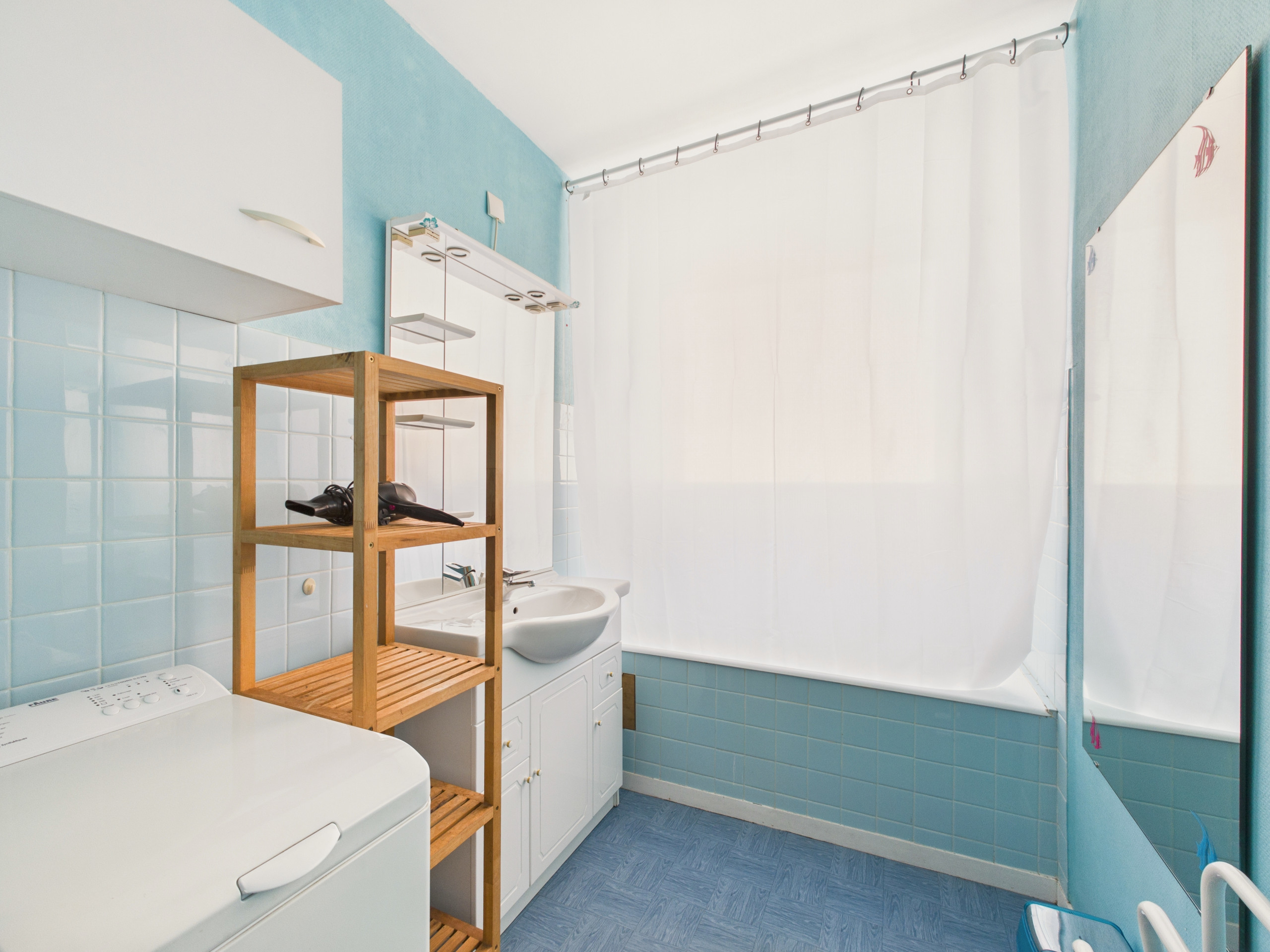 Ein Badezimmer mit Badewanne, Waschmaschine und Föhn sowie eine separate Toilette vervollständigen das Ensemble.