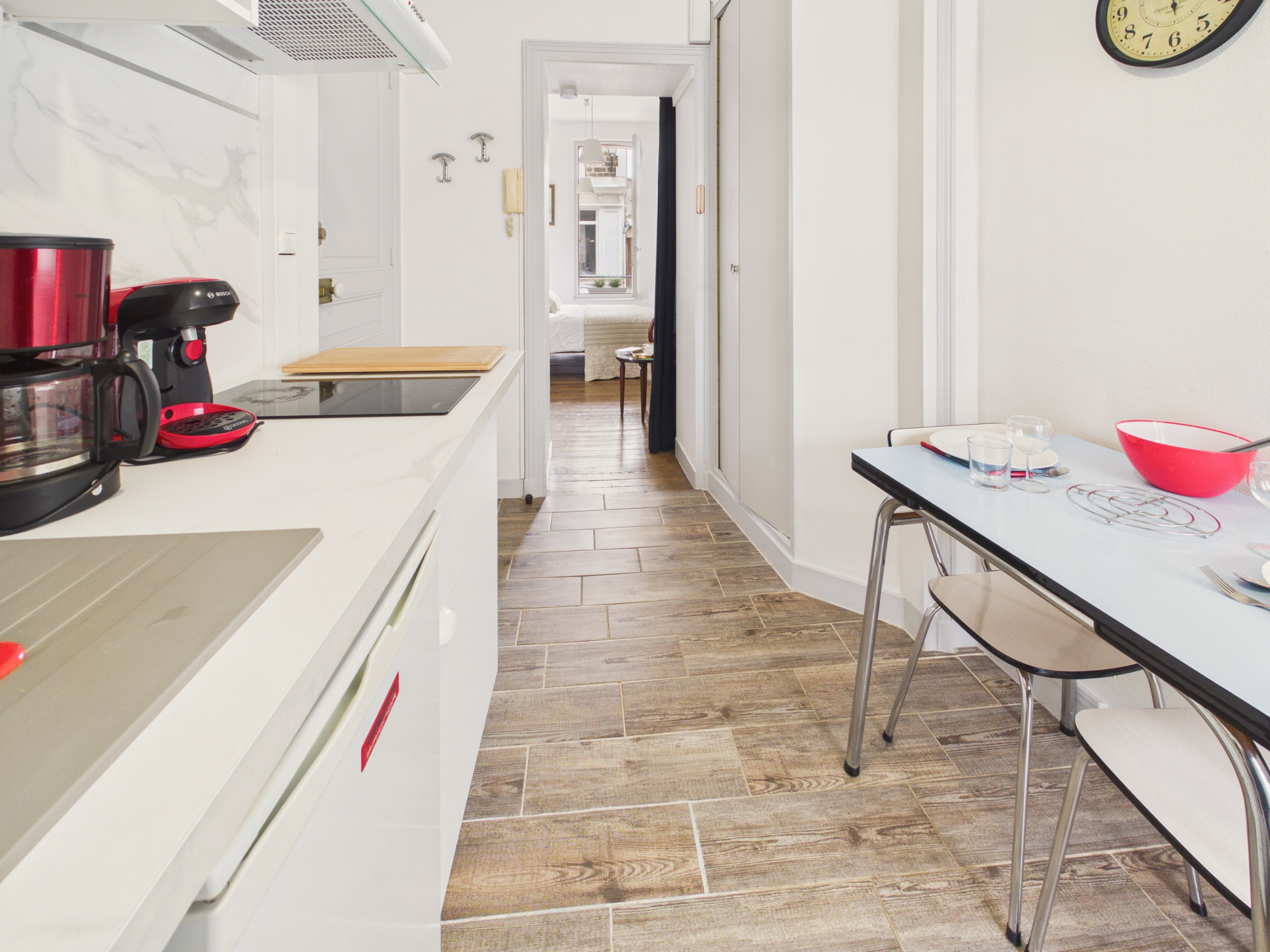 Im Inneren entdecken Sie gleich beim Eingang einen funktionalen Küchen-/Essbereich mit einem Tisch für 2 Personen. Die amerikanische Küche mit Induktion ist vollständig ausgestattet: Kühlschrank, Mikrowelle, Geschirrspüler, Nespresso-Kaffeemaschine, Toaster, Wasserkocher und alles Notwendige zum einfachen täglichen Kochen.