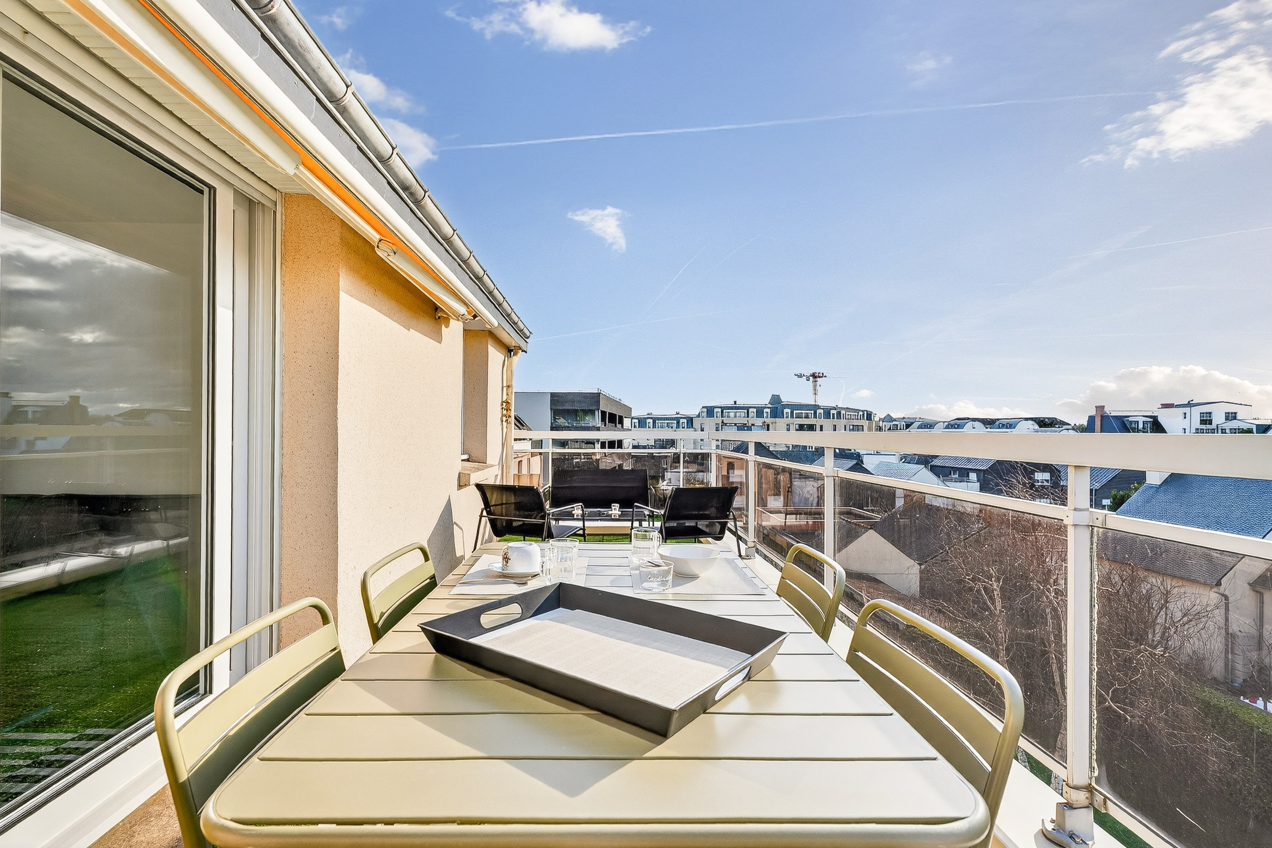 Bei Ihrer Ankunft werden Sie in einem lichtdurchfluteten Wohnbereich begrüßt. Das Wohnzimmer, bestehend aus einem gemütlichen Sofa und einem Fernseher, lädt zur Entspannung ein. Eine große Glasfront bringt schönes natürliches Licht und bietet Zugang zu einem Balkon von 5 m², perfekt um einen Kaffee oder eine Mahlzeit im Freien zu genießen. Der Essbereich, auf der anderen Seite des Raumes, verfügt über einen Tisch, der bis zu 4 Personen Platz bietet.
