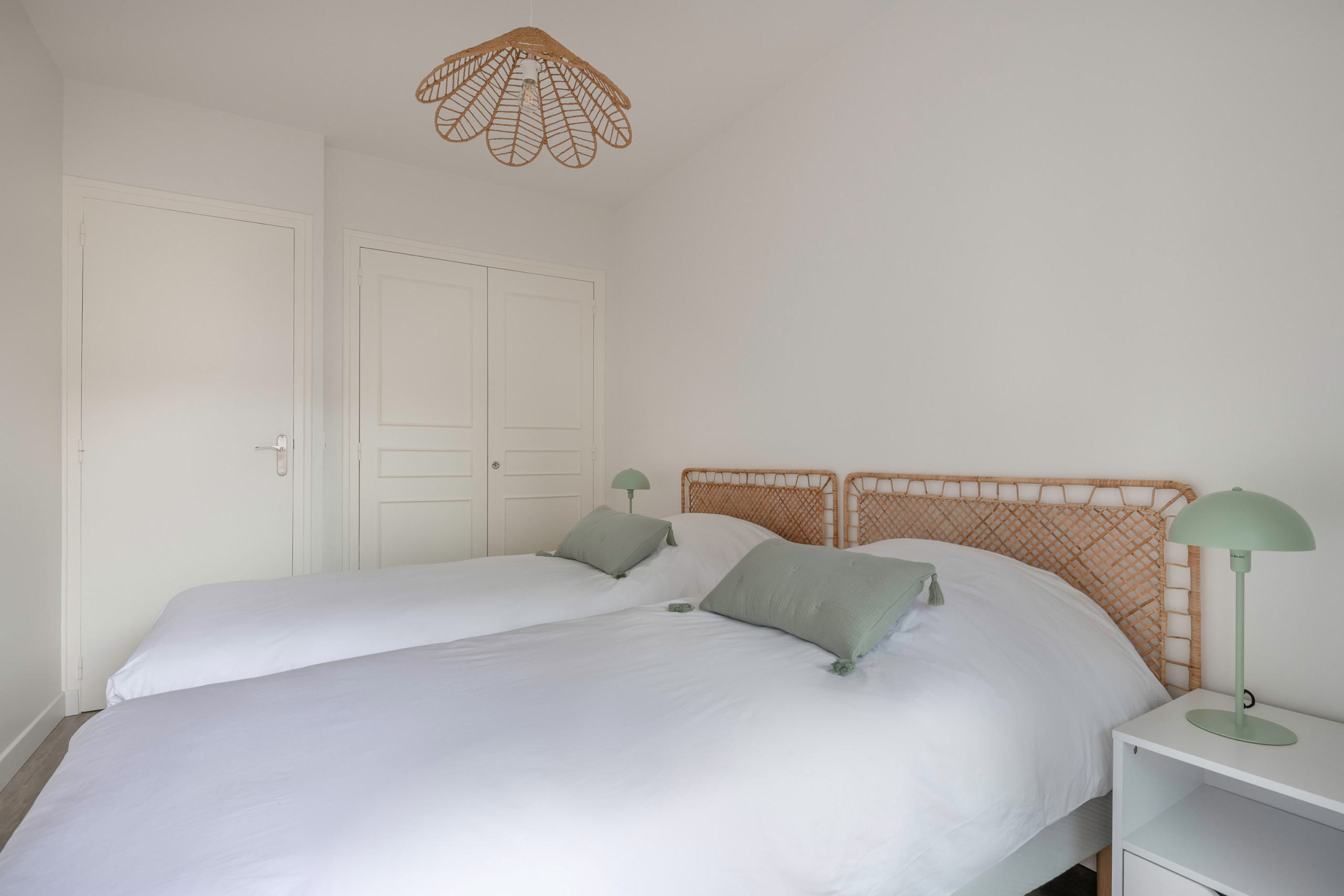 Die Wohnung bietet Platz für bis zu 5 Personen. Das Schlafsofa kann zum Schlafen ausgeklappt werden, zusätzlich zu den beiden schlicht, aber schön eingerichteten Schlafzimmern. Das erste Schlafzimmer hat ein Doppelbett und einen natürlichen Wandabschnitt, während das zweite Schlafzimmer über zwei Einzelbetten und eine ebenso beruhigende Einrichtung verfügt.