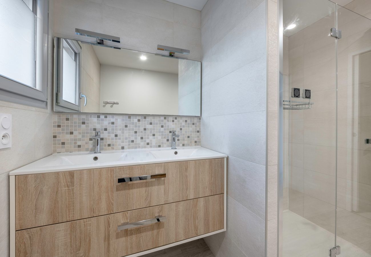 Im Obergeschoss öffnet sich die Küche zum Wohn-TV-Bereich und bietet Zugang zur 15 m² großen Holzterrasse ohne Einblicke, ausgestattet mit Außenmöbeln und Sonnenschirm. Die eingerichtete Küche verfügt über Induktionsherde, einen Backofen, einen Kühl-Gefrier-Schrank, eine Mikrowelle, eine Filterkaffeemaschine, einen Toaster, einen Wasserkocher, eine Zitruspresse, ein Raclette-Gerät und die gesamte Küchenausstattung. Eine separate Toilette ergänzt die Vermietung. Für maximalen Komfort stehen Ihnen zusätzlich ein Haartrockner, eine Waschmaschine, ein elektrischer Grill, ein Bügeltisch und ein Bügeleisen zur Verfügung. Sie verfügen über einen privaten und überdachten Parkplatz.