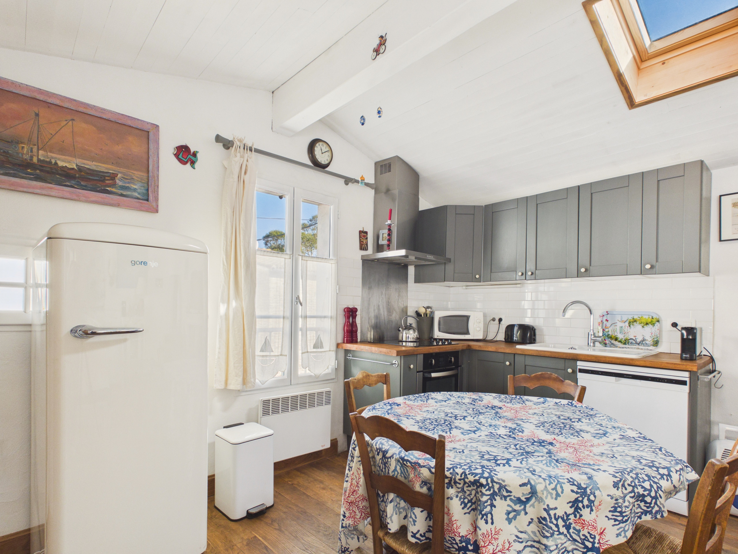 Über eine kleine Treppe rechts gelangen Sie in den warmen und hellen Wohnbereich. Er besteht aus einem gemütlichen Sofa, einem Sessel, einem Fernseher und einem charmanten dekorativen Ofen, der dem Ganzen eine gemütliche Atmosphäre verleiht. Ein runder Tisch, der 4 Personen Platz bietet, ermöglicht es Ihnen, Ihre Mahlzeiten in aller Geselligkeit zu teilen. Die offene amerikanische Küche ist komplett ausgestattet: Induktionsherde, Kühlschrank mit Gefrierfach, Backofen, Mikrowelle, Geschirrspüler, Nespresso-Kaffeemaschine, Toaster und Wasserkocher.