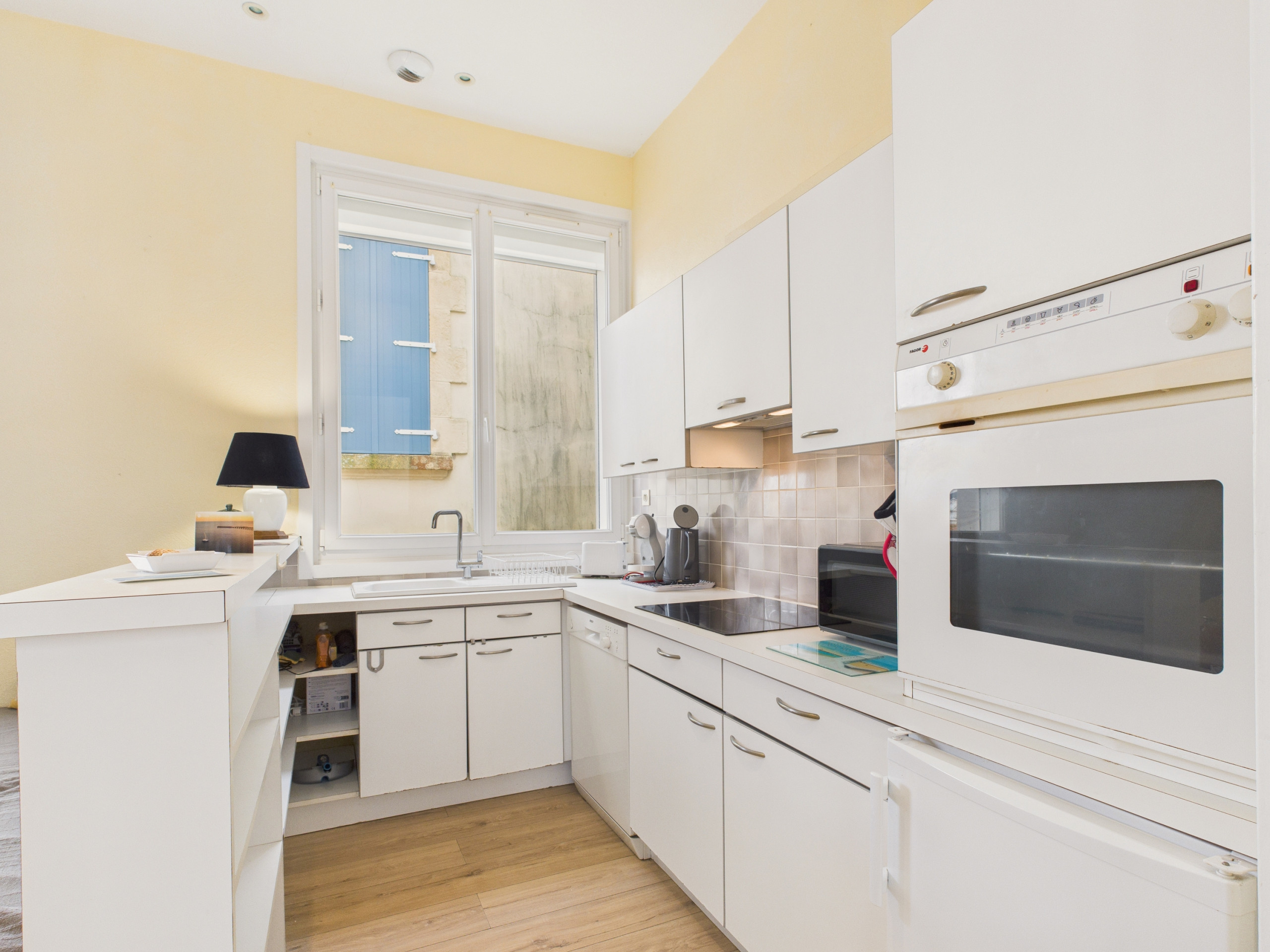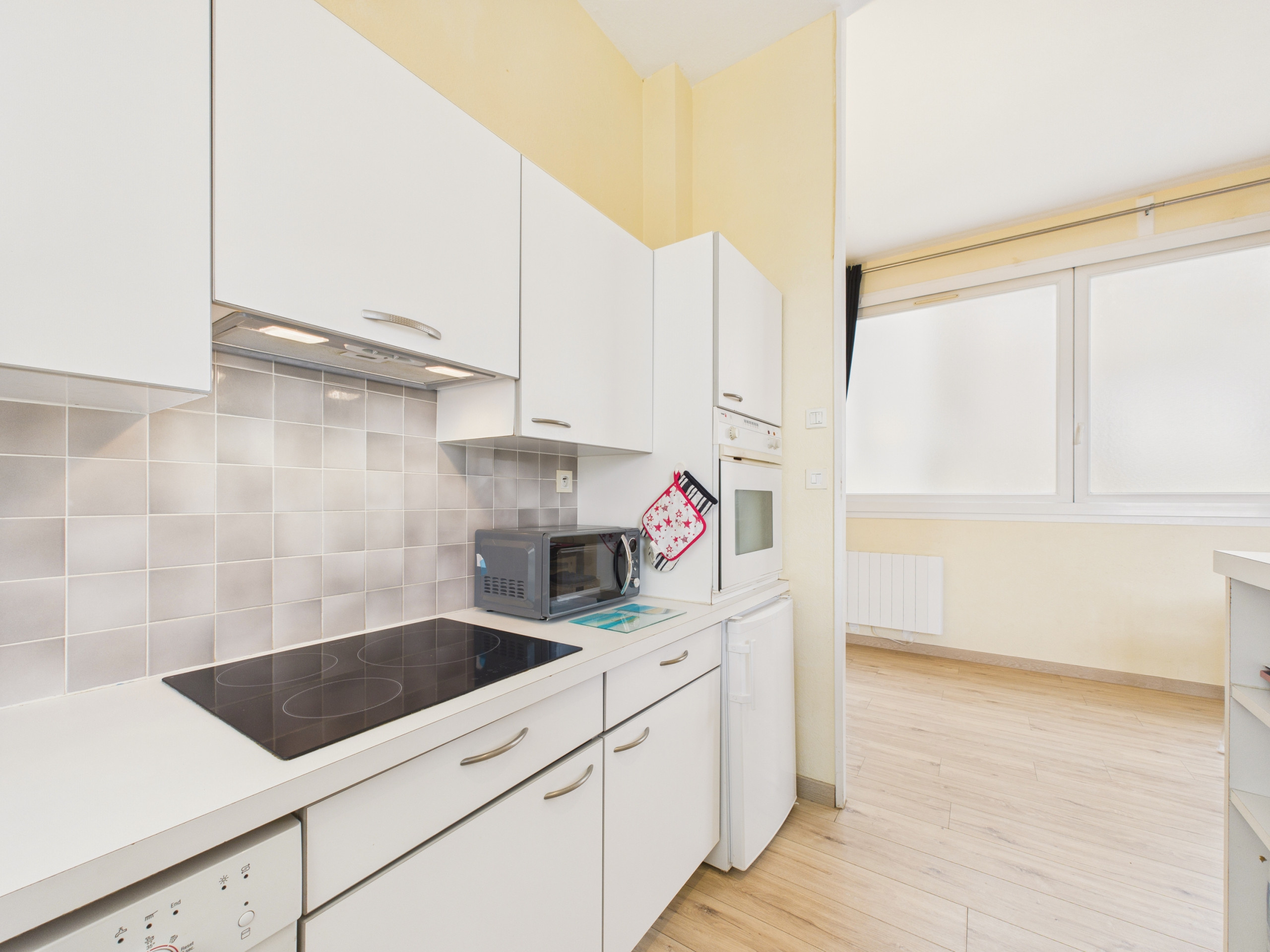 Bei Ihrer Ankunft in dieser Wohnung werden Sie einen großen Wohnbereich mit zwei Schlafcouches entdecken: Einer ermöglicht eine Schlafgelegenheit für zwei Personen, der zweite für eine Person. Direkt daneben befindet sich der Esstisch, und gleich dahinter werden Sie die voll ausgestattete offene Küche entdecken. Sie verfügen über alles Notwendige zum Kochen, mit Induktionsplatten, einem Backofen, einer Mikrowelle, einem Toaster, einem Wasserkocher und einer Dolce Gusto Kaffeemaschine.