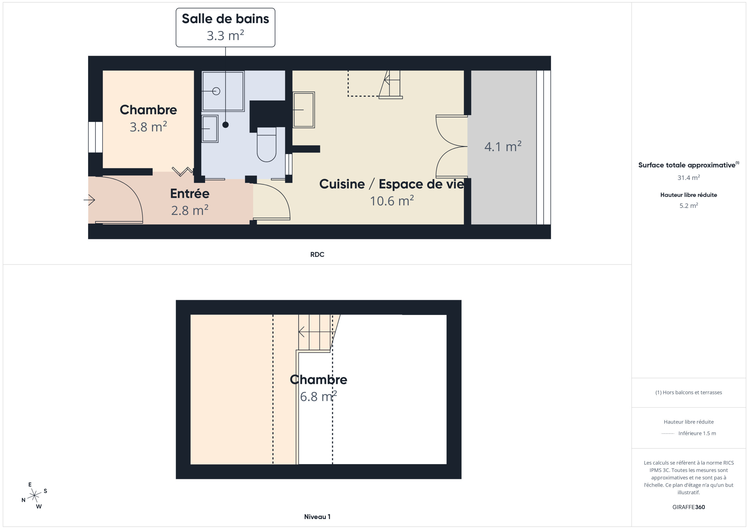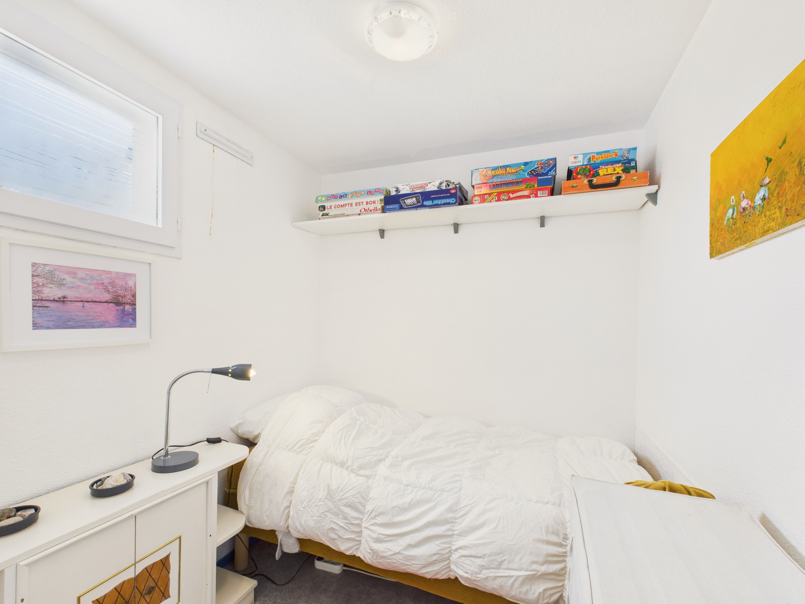 Sie werden ein Zimmer mit einem Einzelbett (85/185) entdecken und auf der Galerie werden Sie zum zweiten Schlafplatz gelangen, der ein Doppelbett (140/190) ist.