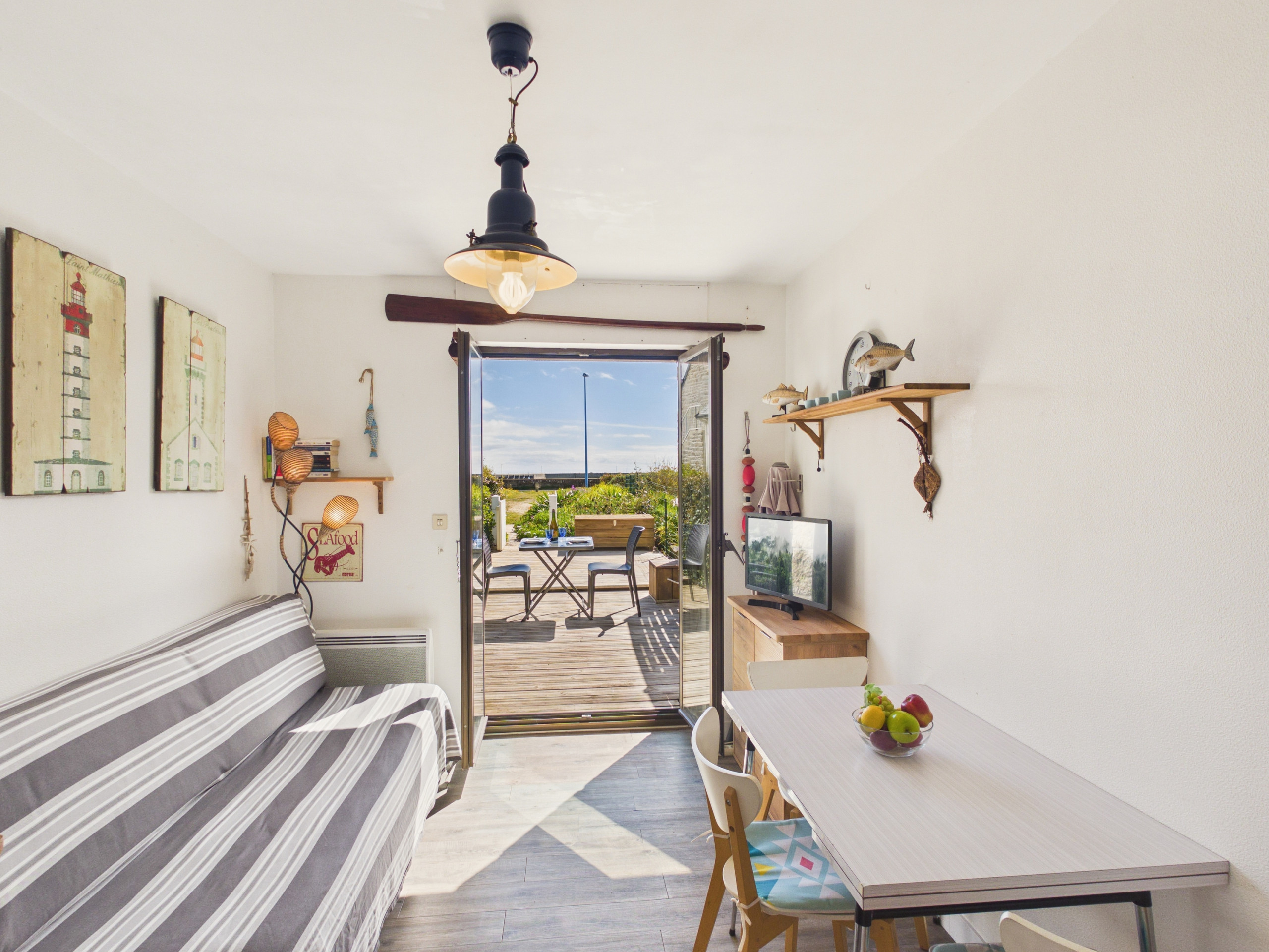 Bei Ihrer Ankunft entdecken Sie einen komfortablen Wohnbereich mit Fernseher für Ihre Abende. Sie können Ihre Mahlzeiten am Esstisch im Inneren genießen oder denjenigen auf der Terrasse nutzen.